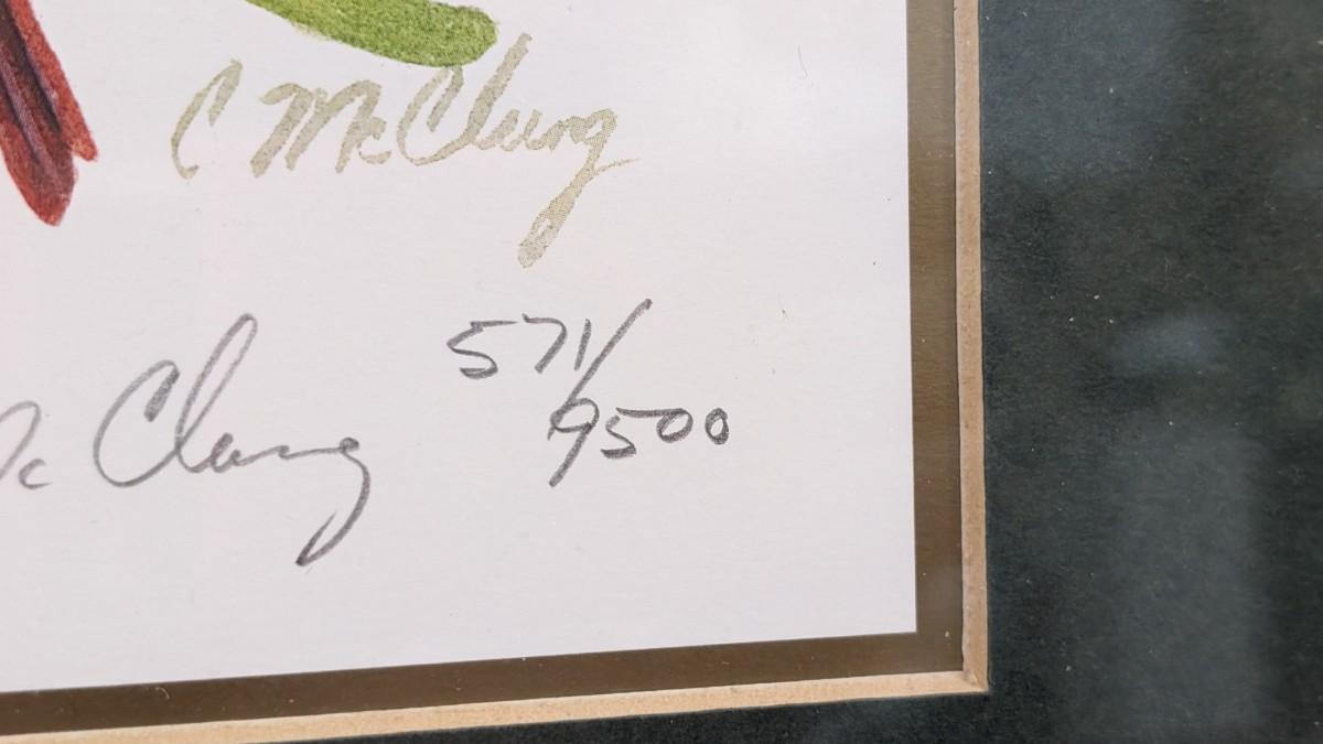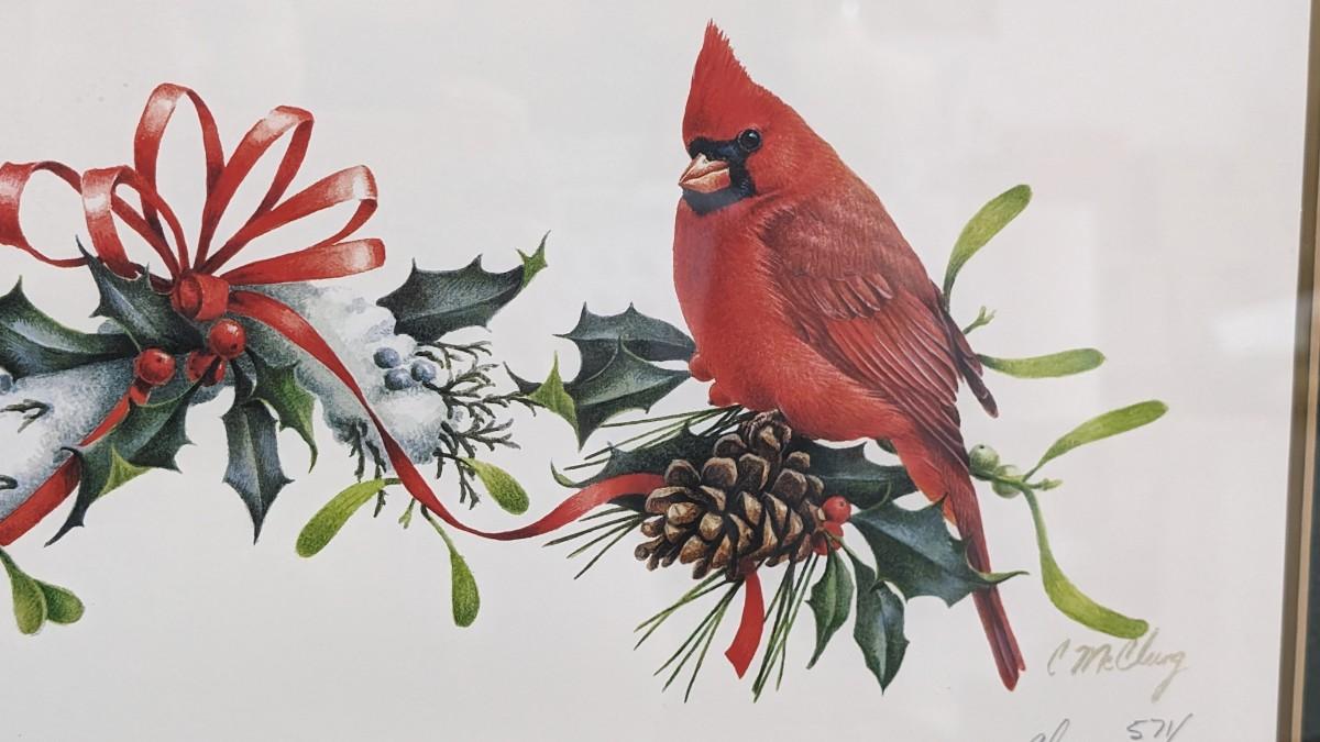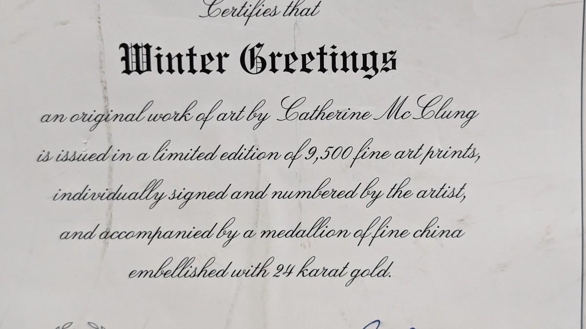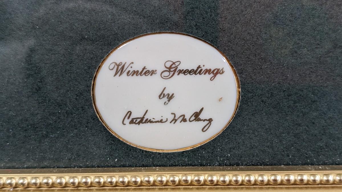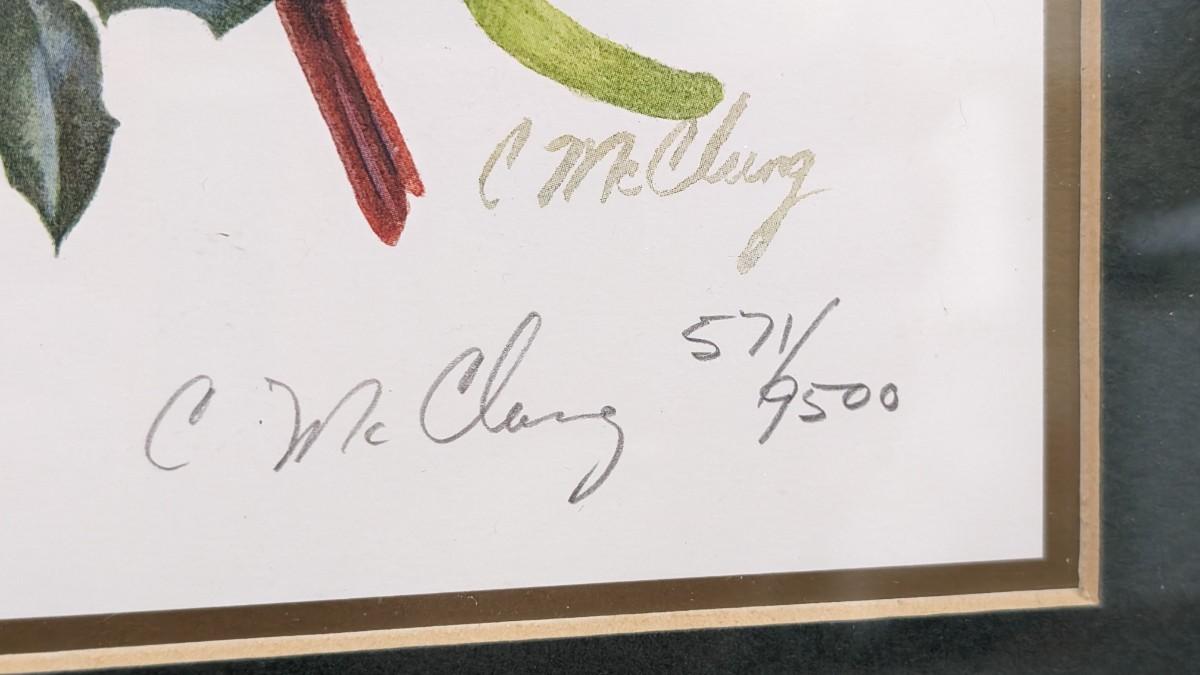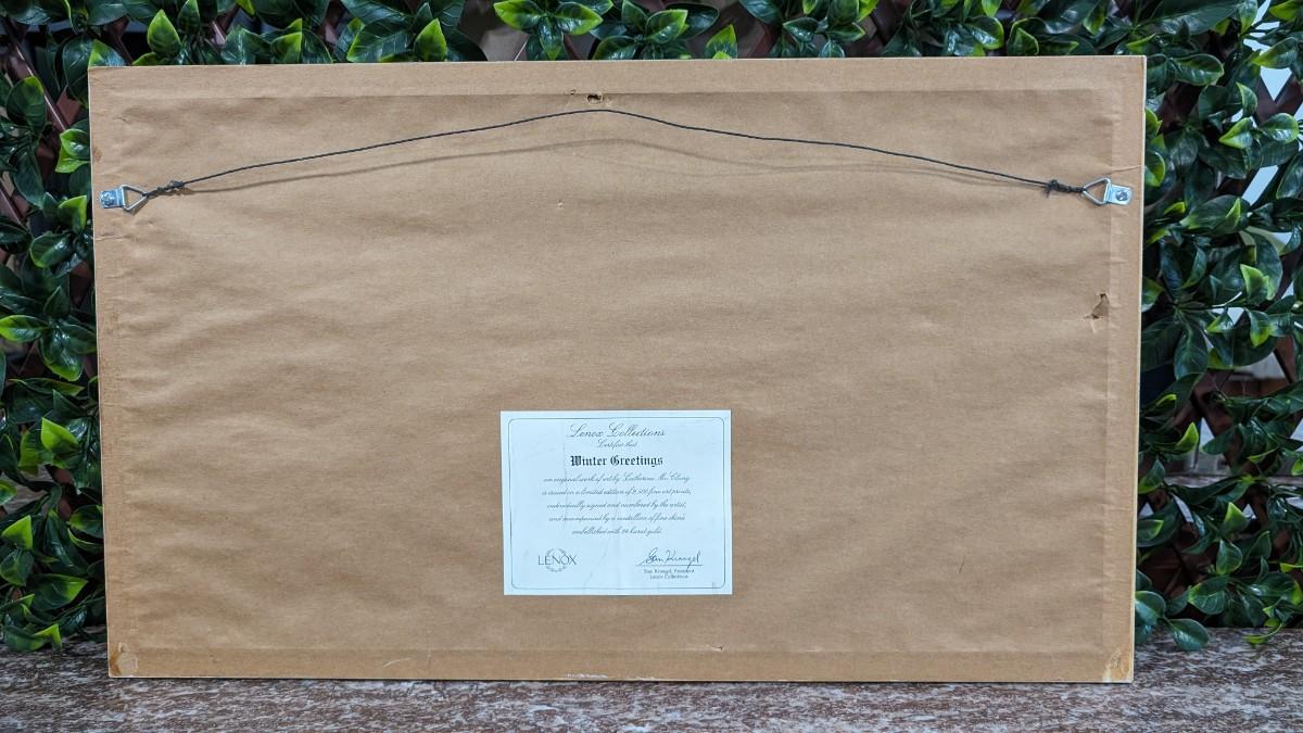 This is a Lenox Winter Greetings Cardinals Holly Red Bow Catherine McClung Signed 571/9500. Some wear and nicks on frame. Some punctures on back paper.