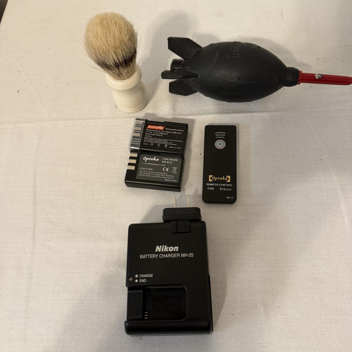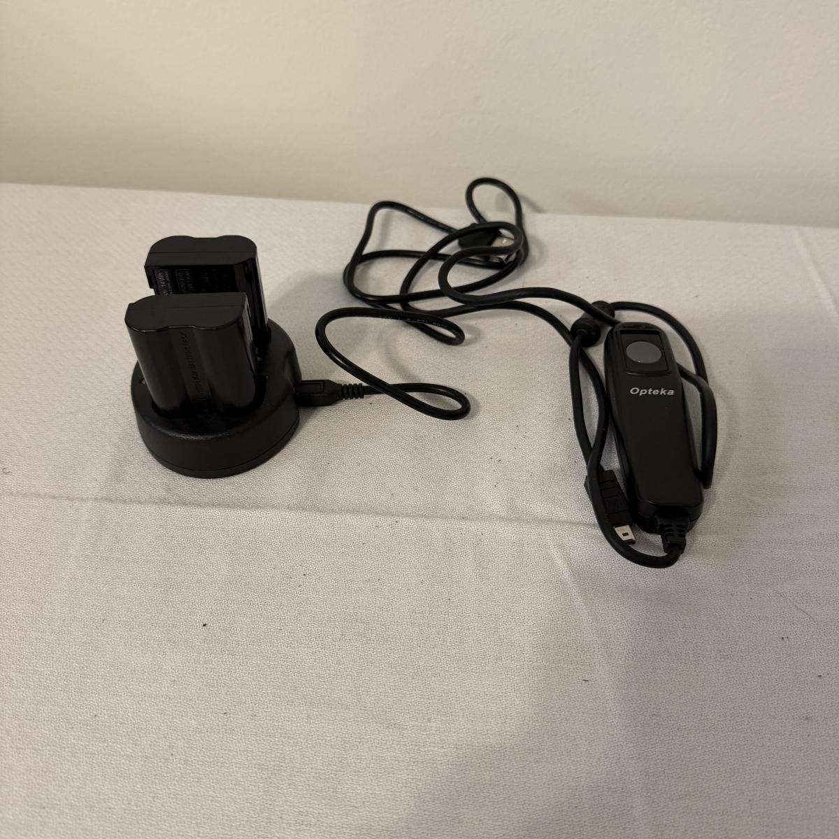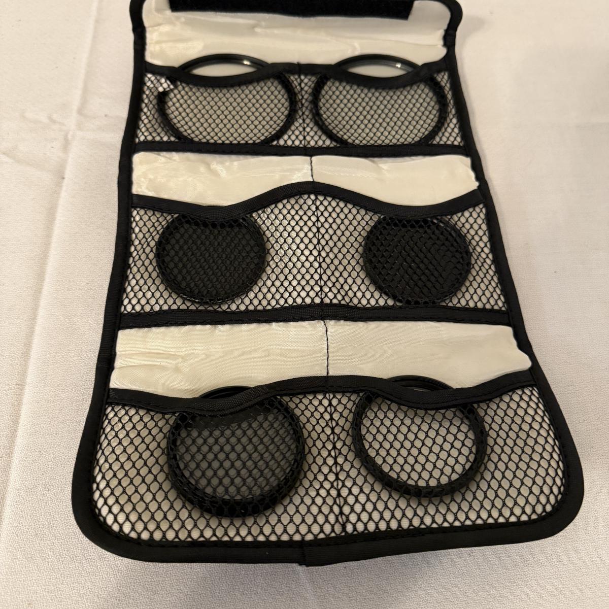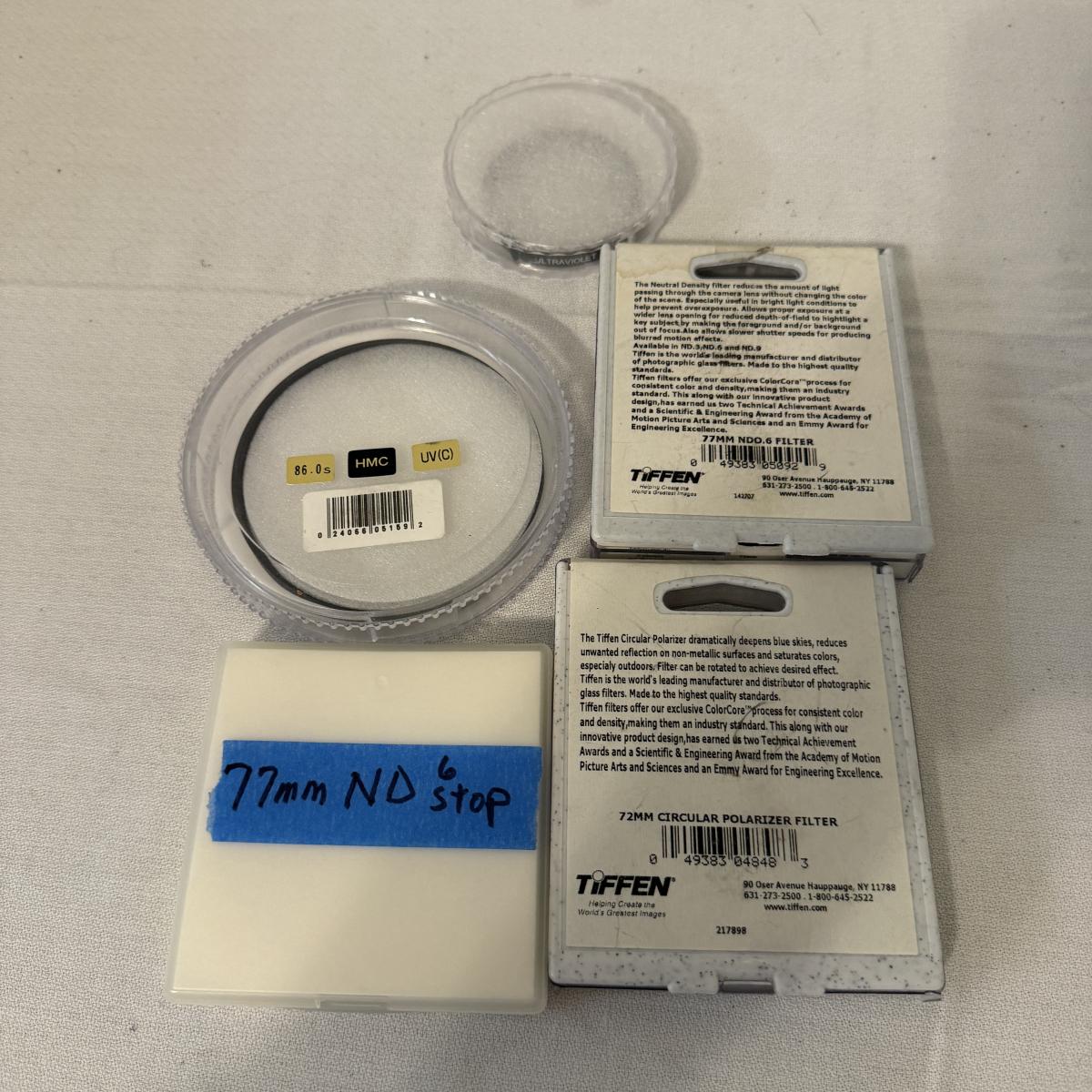 Lot includes over 16 filters in a variety of sizes and styles. Also includes Carson cleaning magnifier, Giotto air blower, battery chargers, batteries, lens caps and more. Batteries were not tested.
