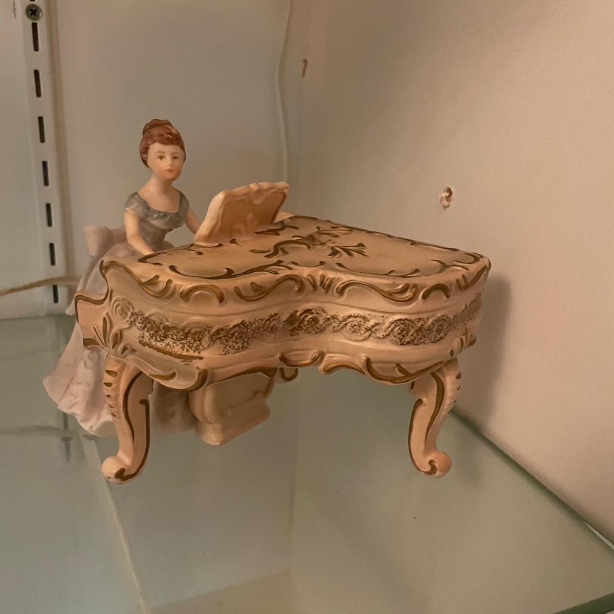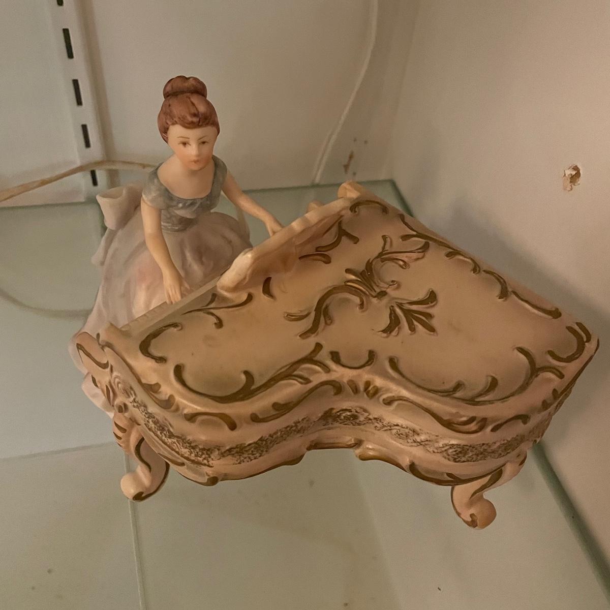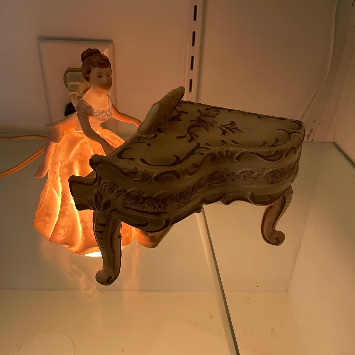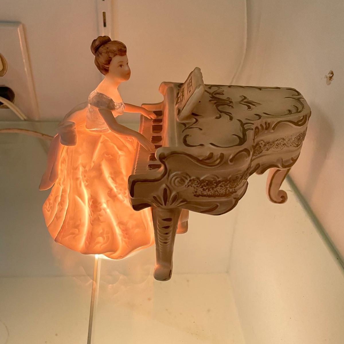 This fine China Lenwile Ardalt piece is a working lamp. The figurine sits playing the piano and Measures 8” x 6” x 6”.