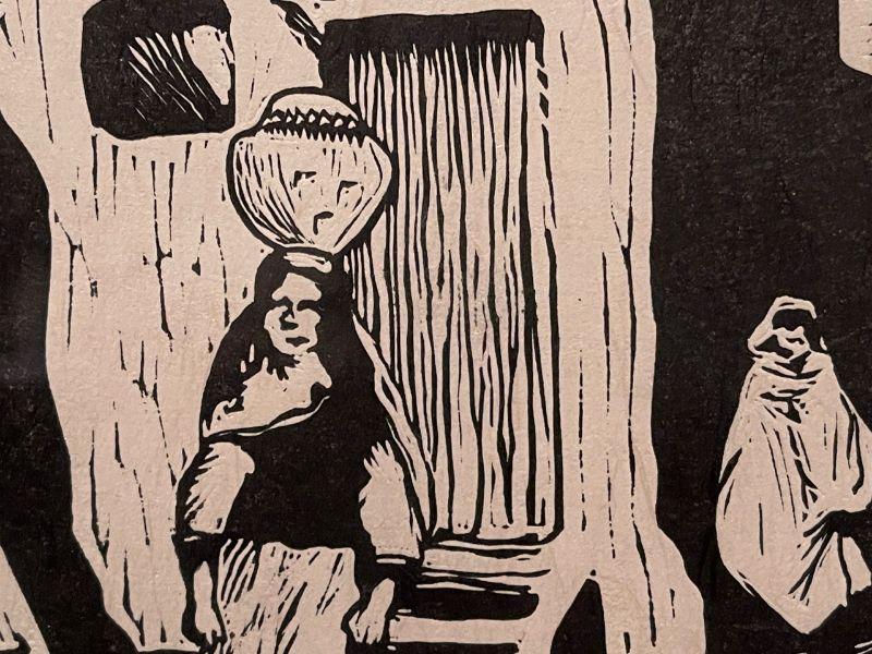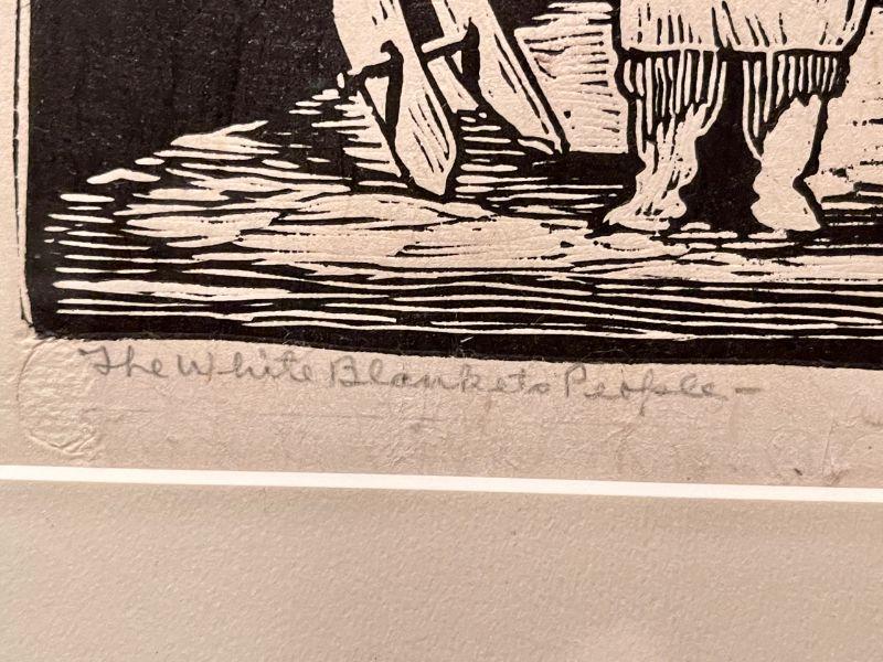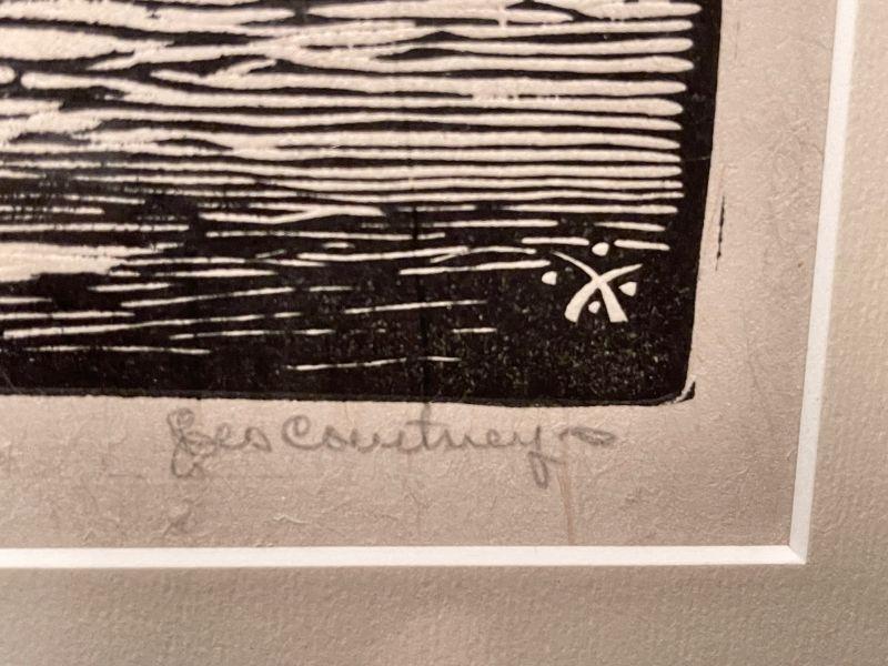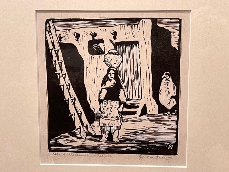 This is an original signed print by founding Prairie Printmaker member Leo Courtney. This deceptively simple block print featured a Native American woman posed carrying a large ola water jar sitting on her head. She stands at the foot of a ladder flanking a large pueblo dwelling.