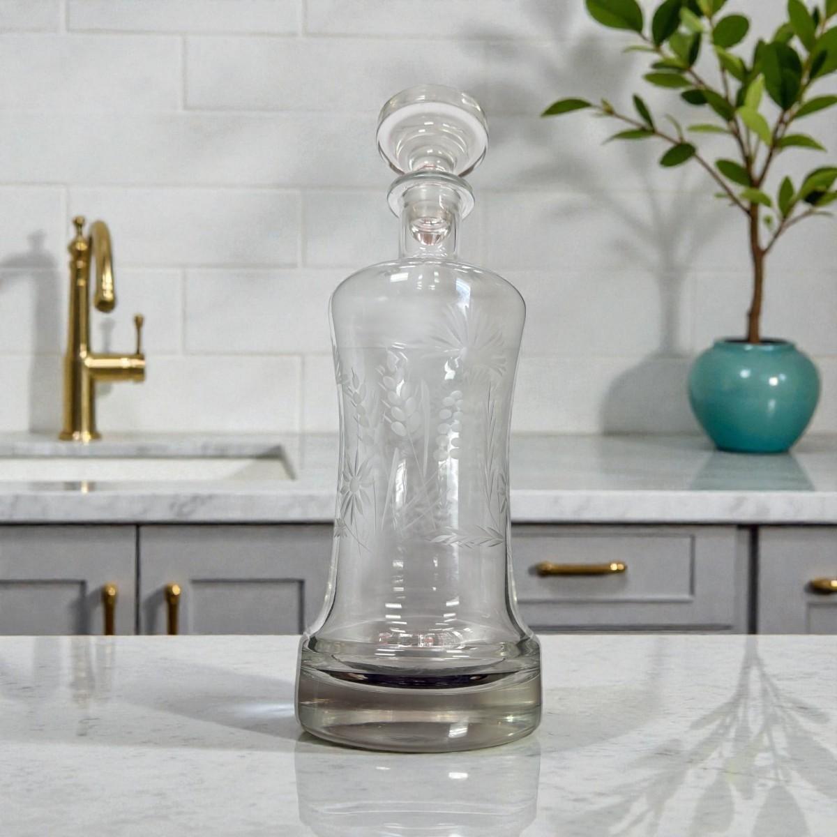 Leonard Silver Company Summerfield Crystal Liquor Decanter 42 oz. Like New etched flowers and wheat design with lid Approximately 13" Tall