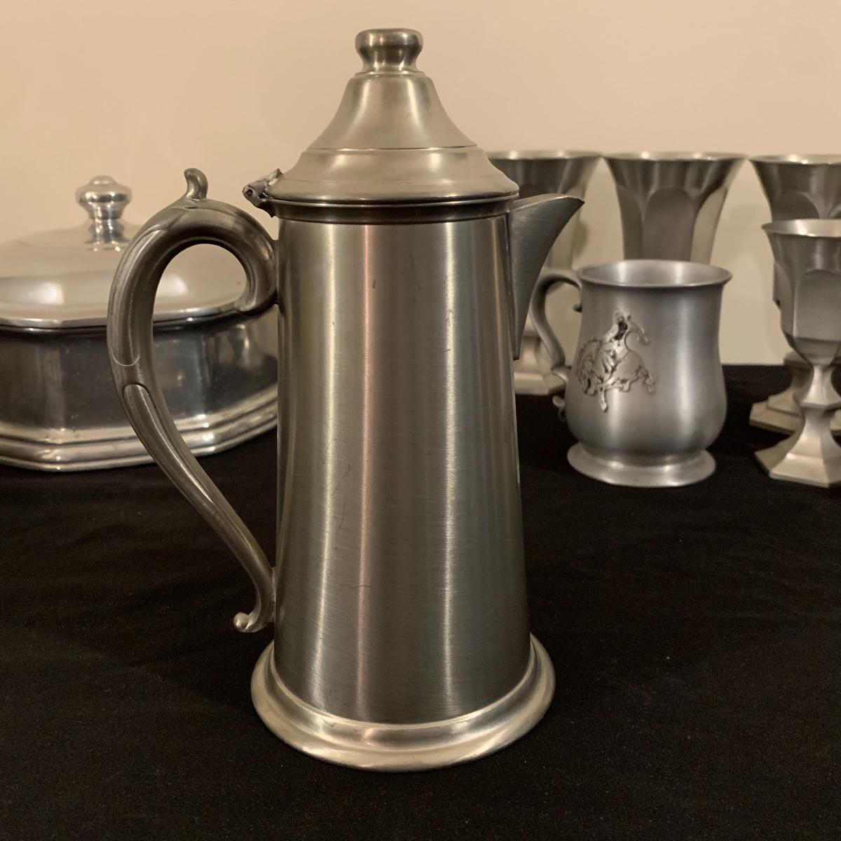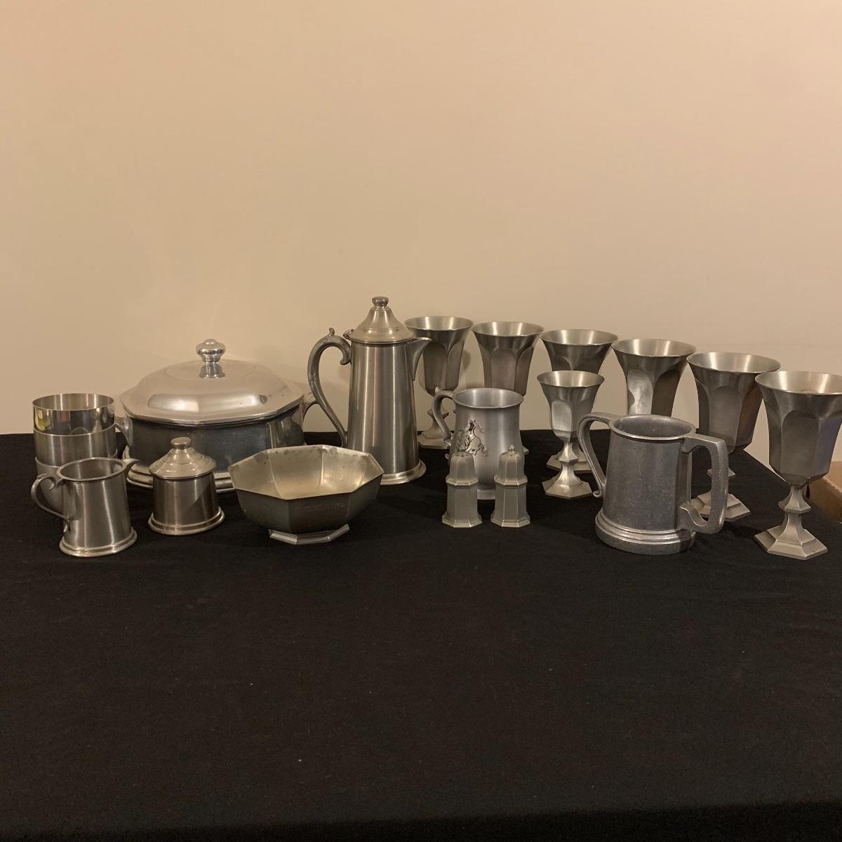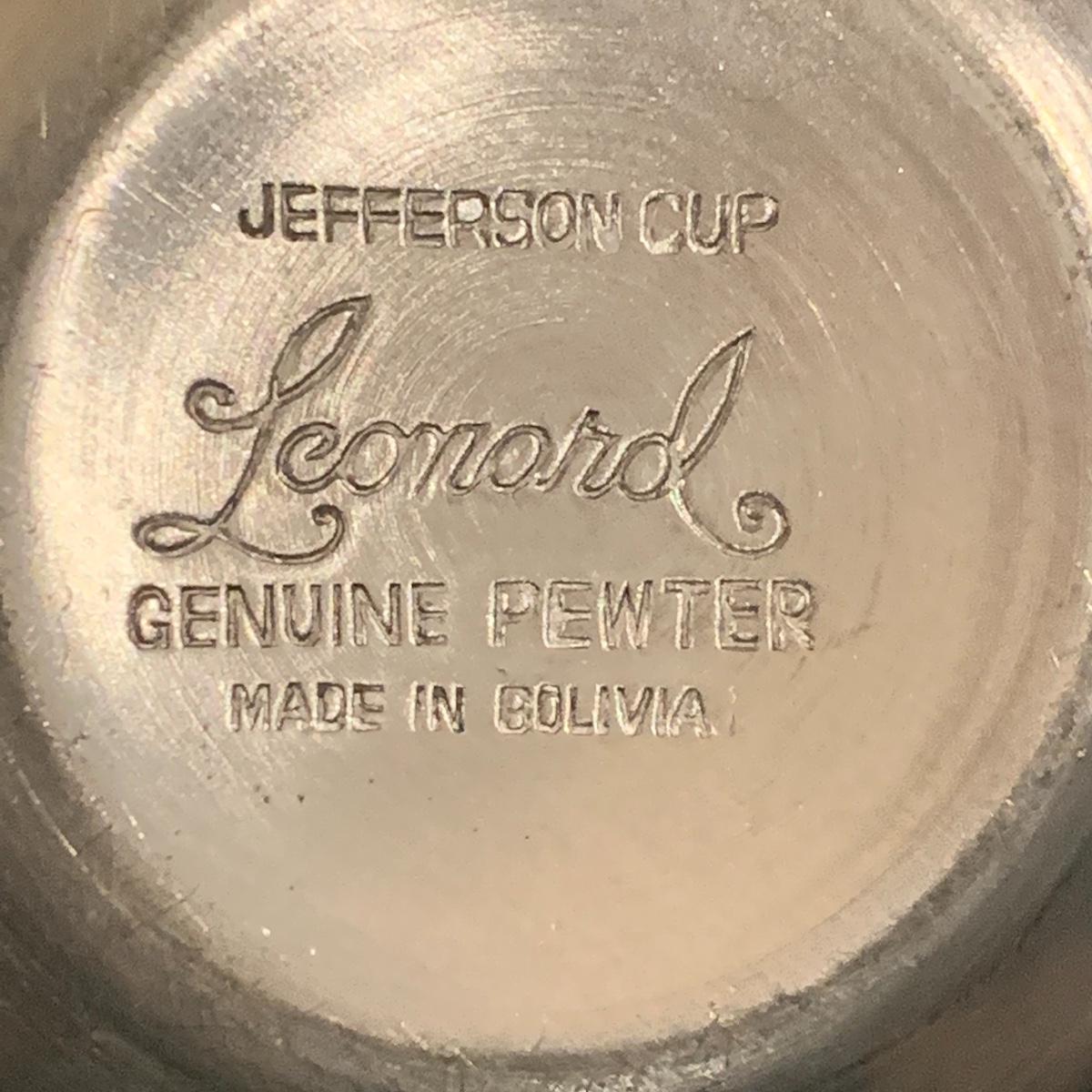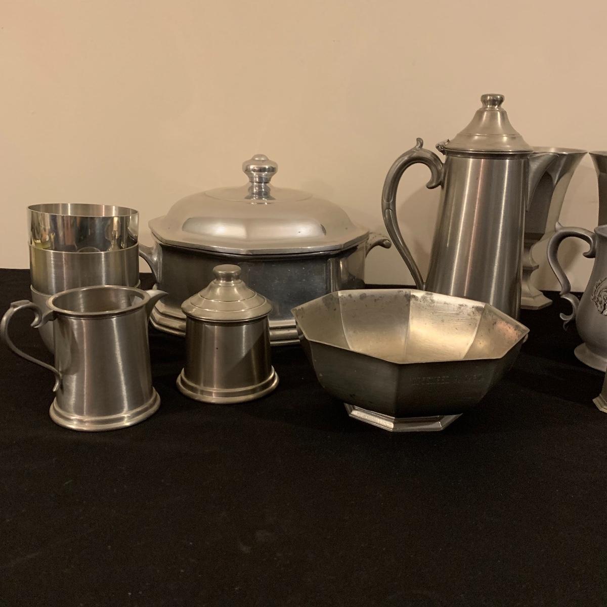 Nice collection of Pewter with most pieces being by Leonard. Large covered dish is Wilton and measures 12” x9” x5”. All three Jefferson cups are by different maker but mostly match. The shinier one is Steiff. Shipping available.