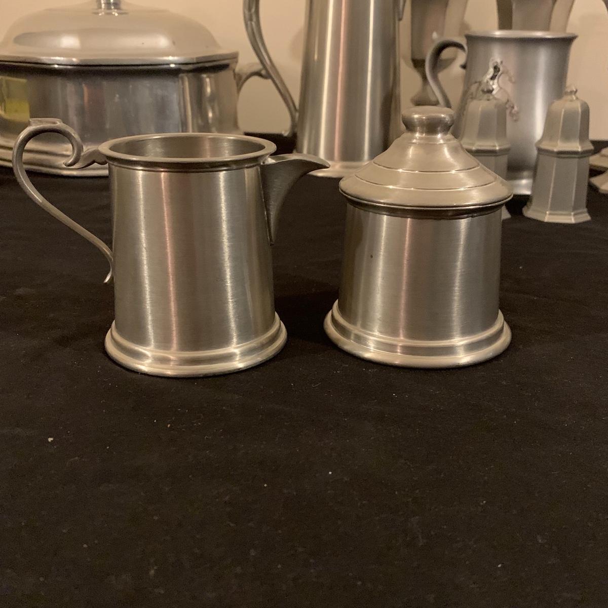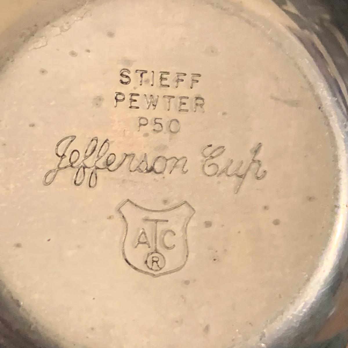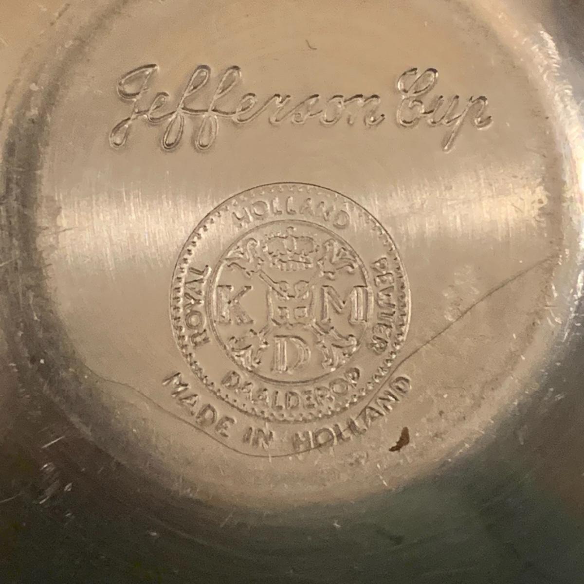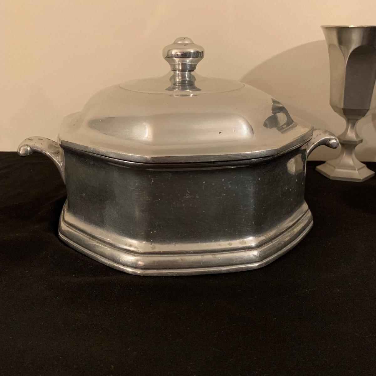 Nice collection of Pewter with most pieces being by Leonard. Large covered dish is Wilton and measures 12” x9” x5”. All three Jefferson cups are by different maker but mostly match. The shinier one is Steiff. Shipping available.