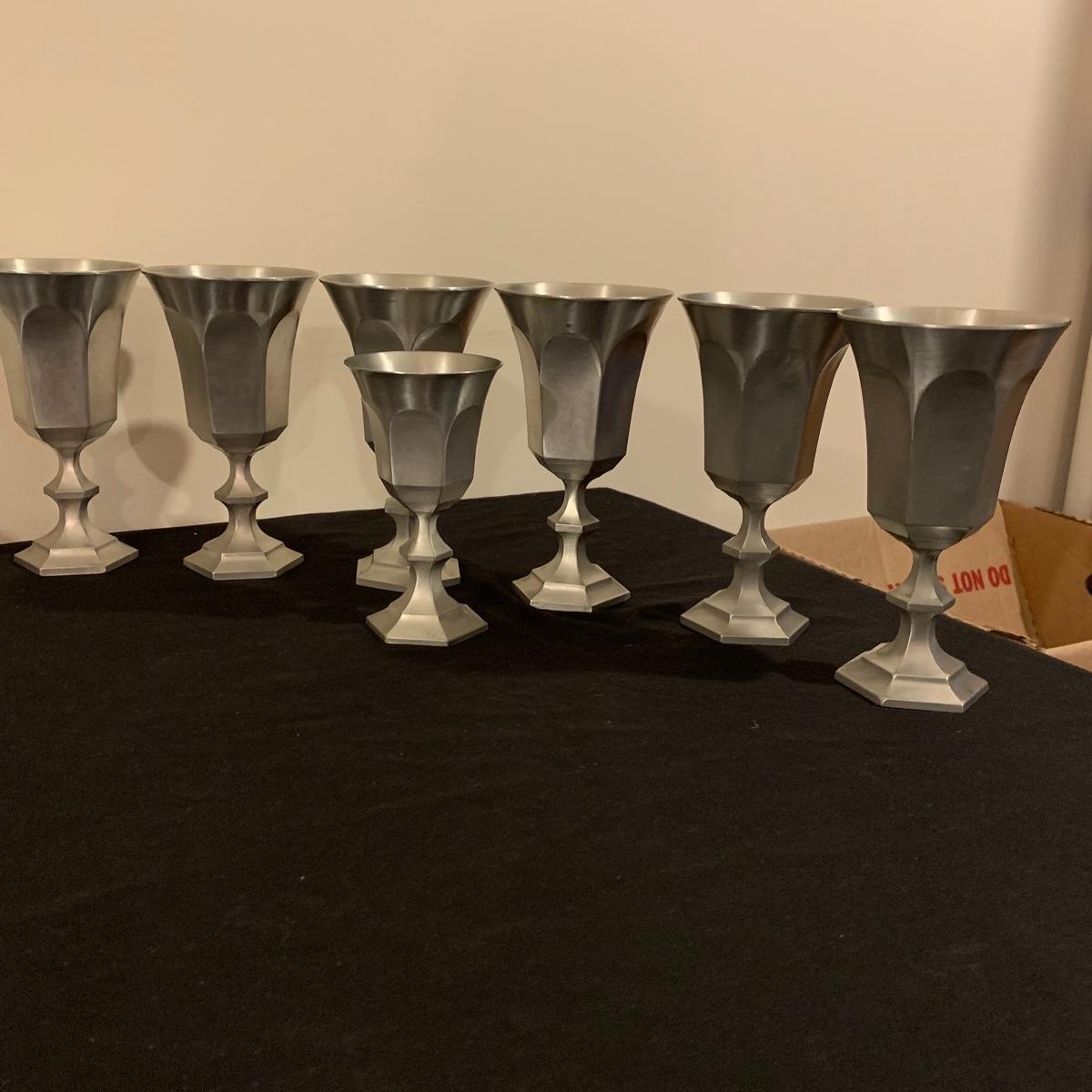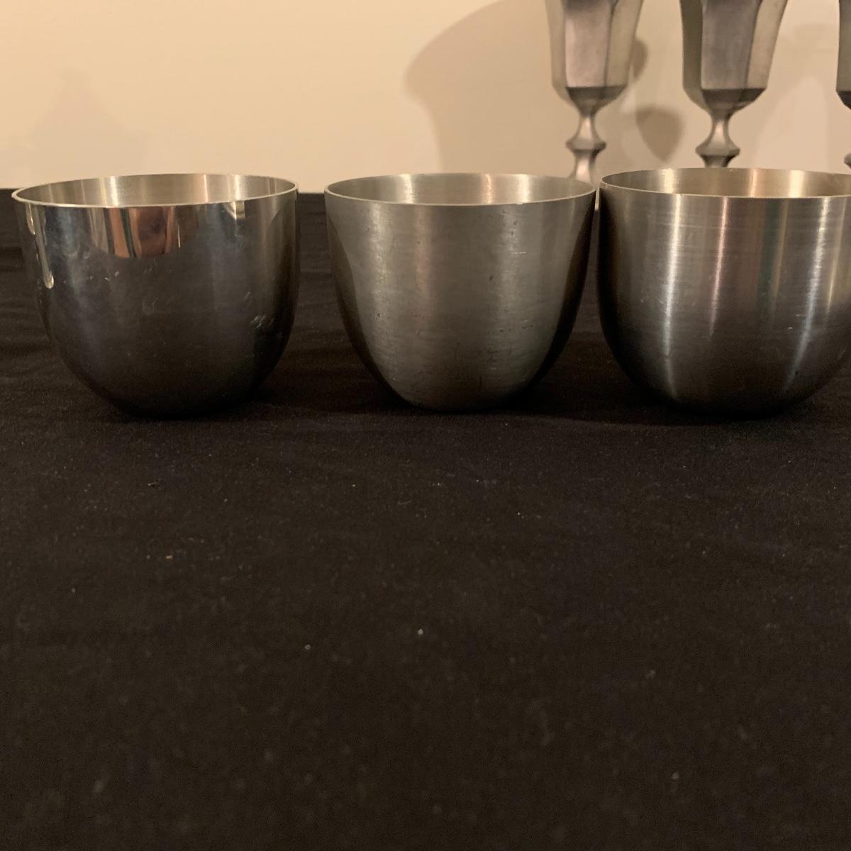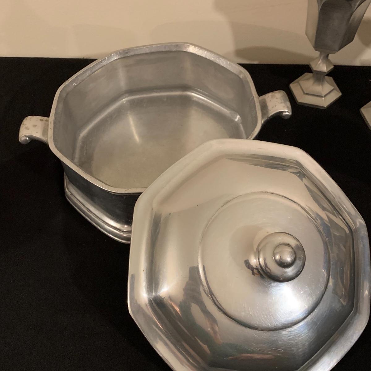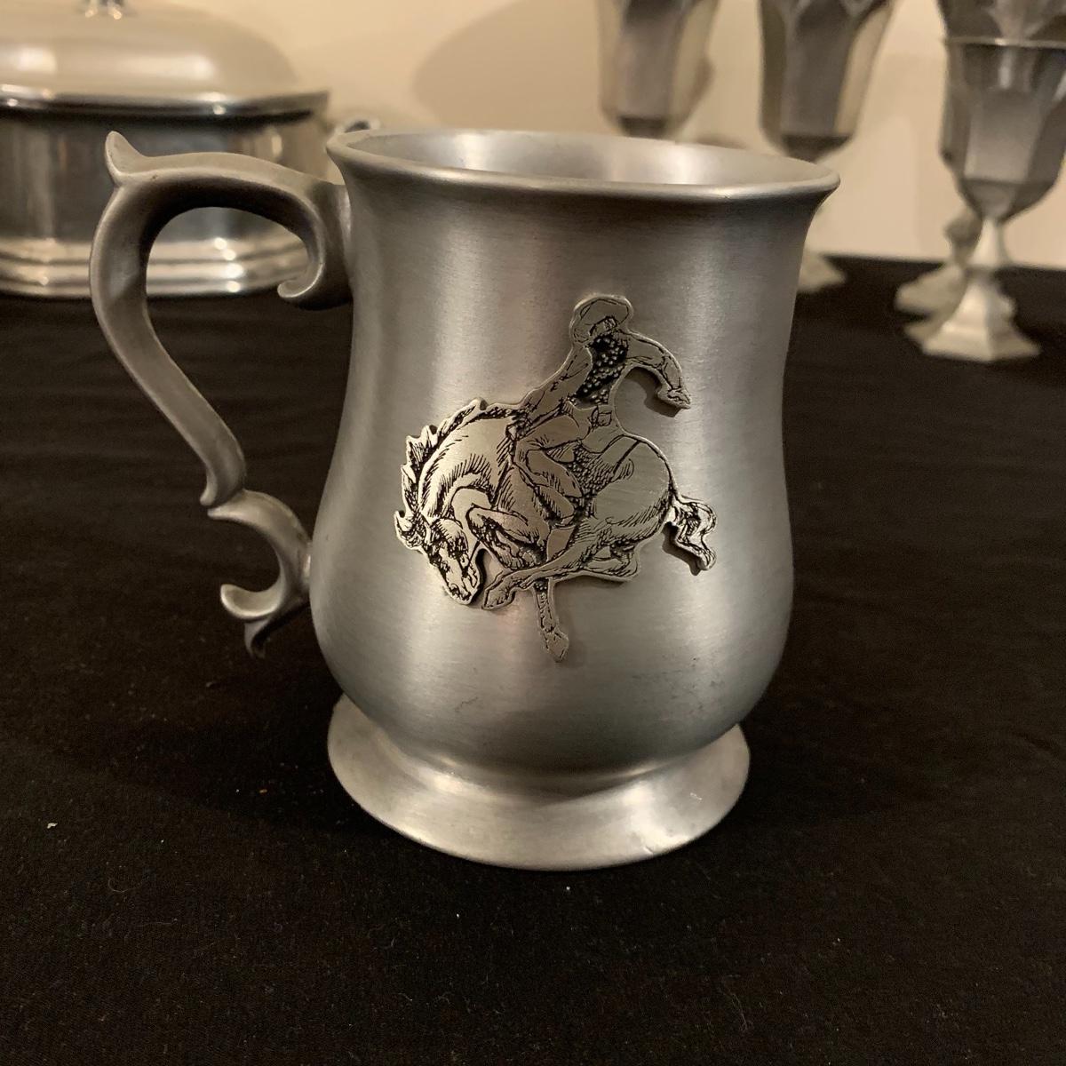 Nice collection of Pewter with most pieces being by Leonard. Large covered dish is Wilton and measures 12” x9” x5”. All three Jefferson cups are by different maker but mostly match. The shinier one is Steiff. Shipping available.