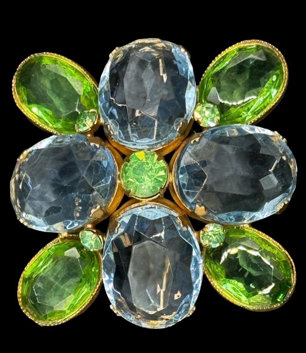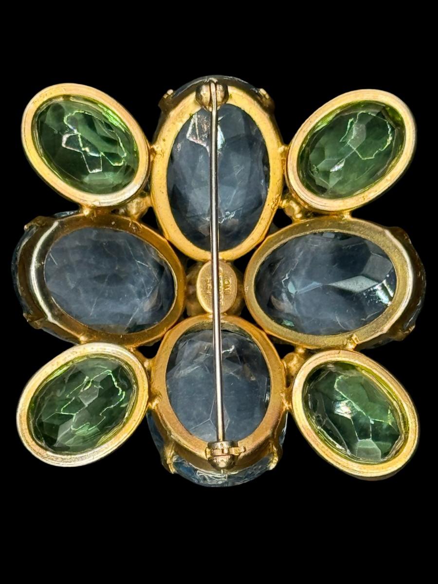 This Modernist gold tone brooch is signed “Les Bernard.” It features nine green stones and four cornflower blue stones. Each stone is bezel set. Measurement: 2” x 2”. [JP]