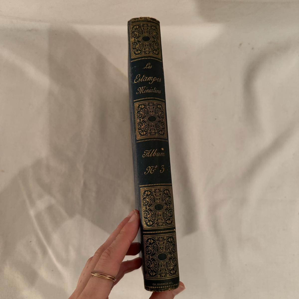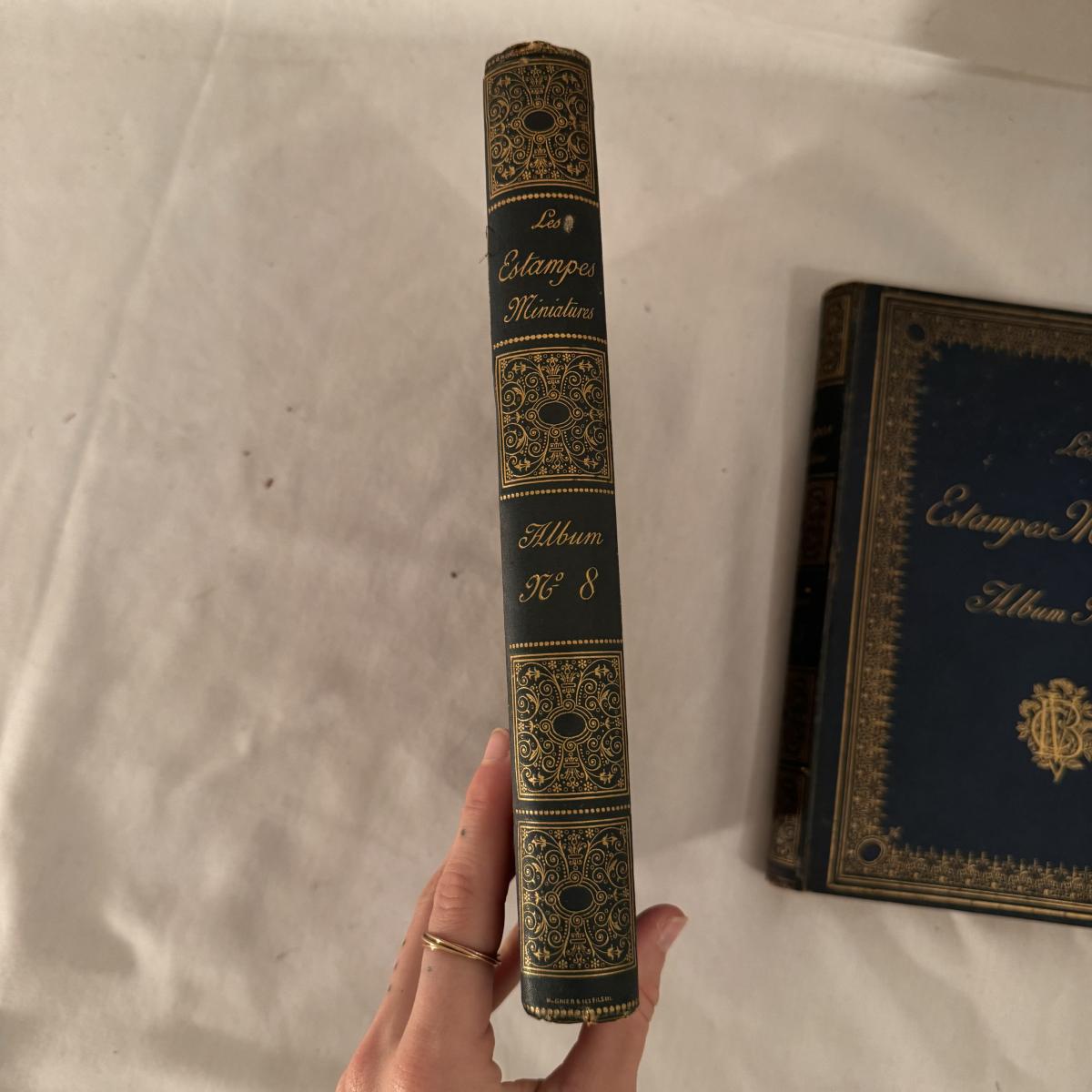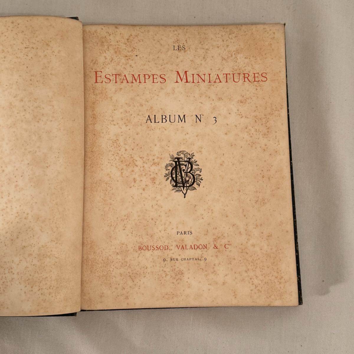 This lot includes the following two books: Les Estampes Miniatures Album No. 3 and Les Estampes Miniatures Album No. 8. Both appear to be from Paris. Both books individually measure 8” x 1” x 10”H. The books show signs of wear including spots of mold - see pictures of the pages included.
