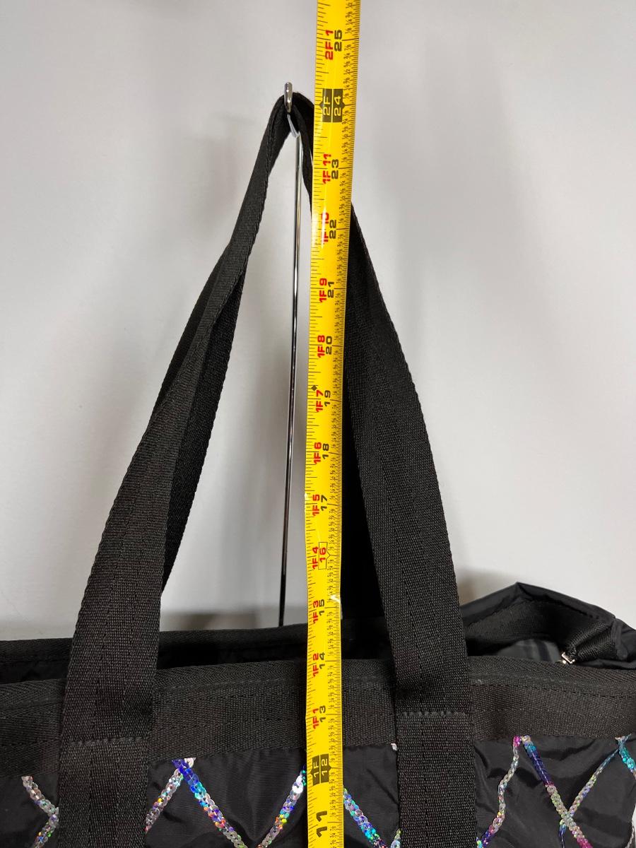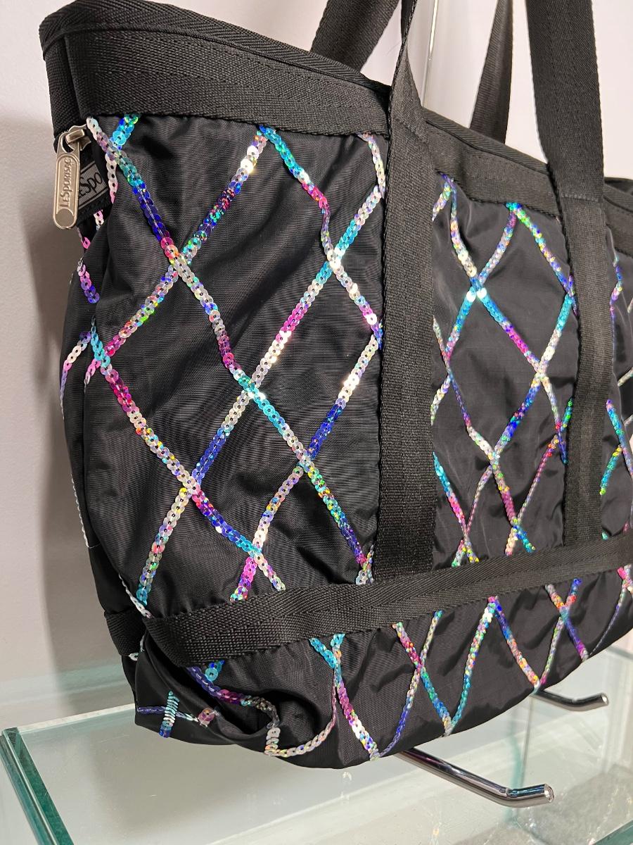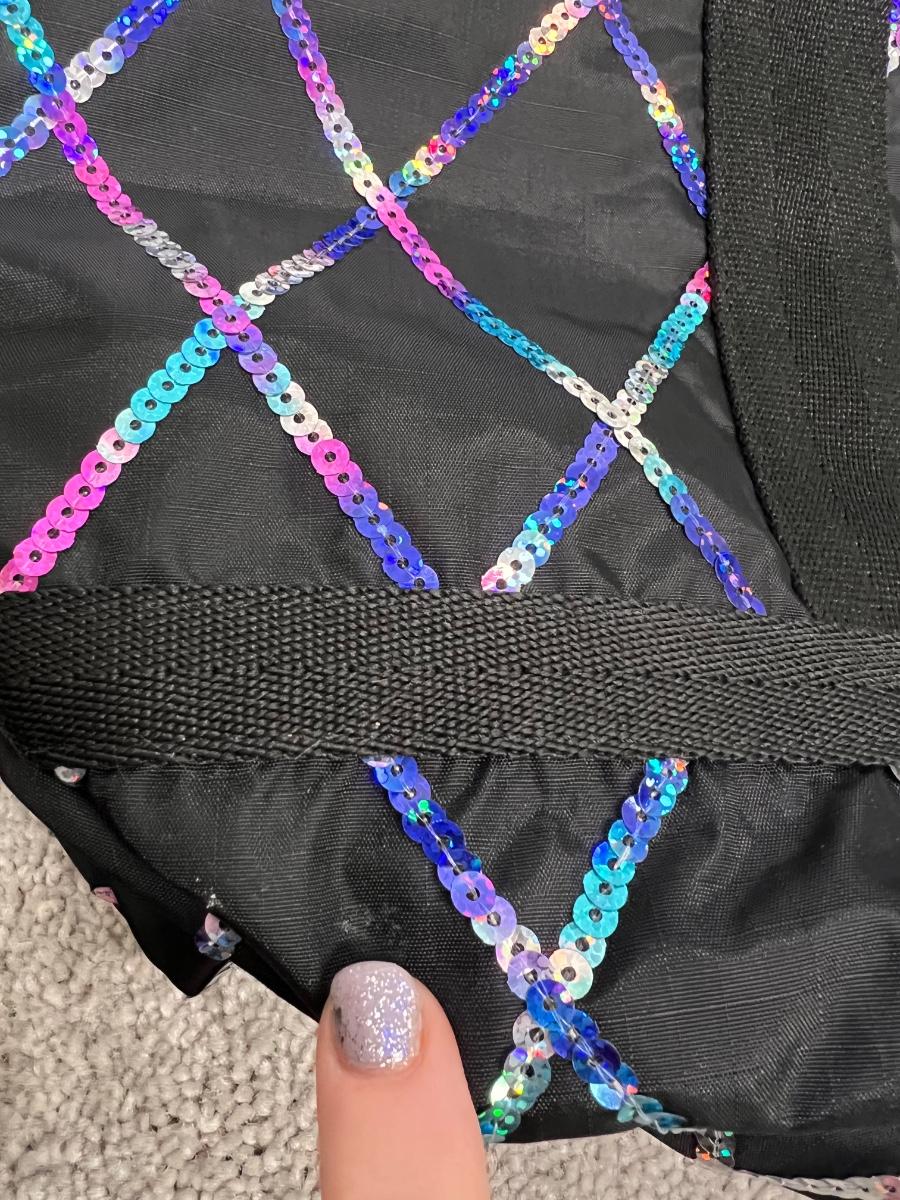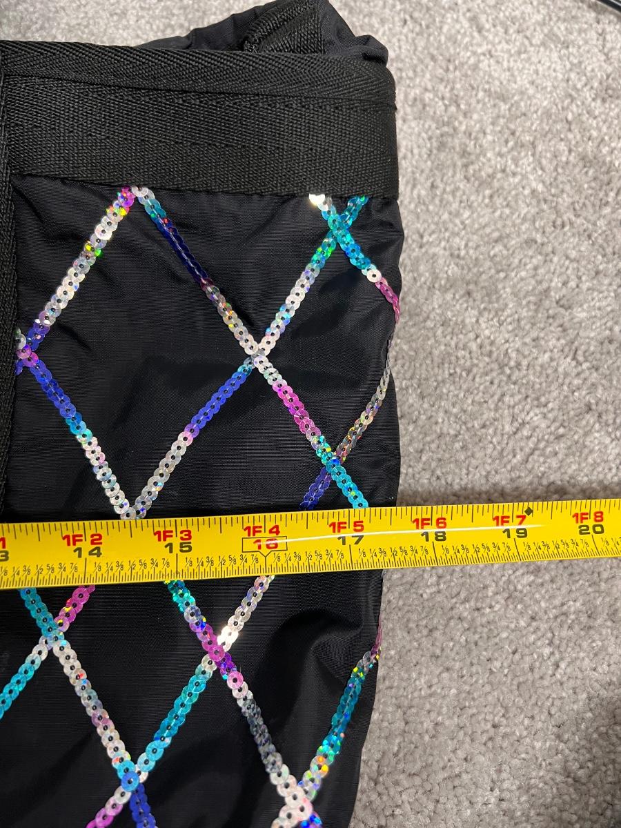 Holographic basket weave sequin design on black nylon. Condition is rated as very good. Very slight marks here and there as shown in pics. Interior is clean. No fraying to straps.