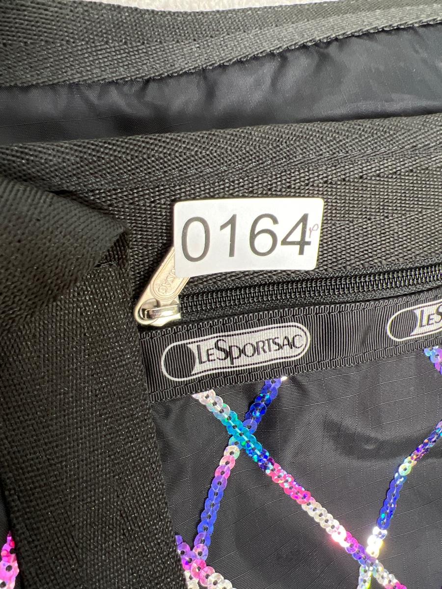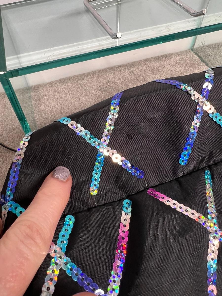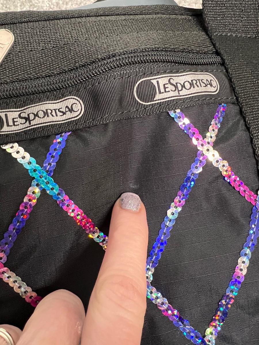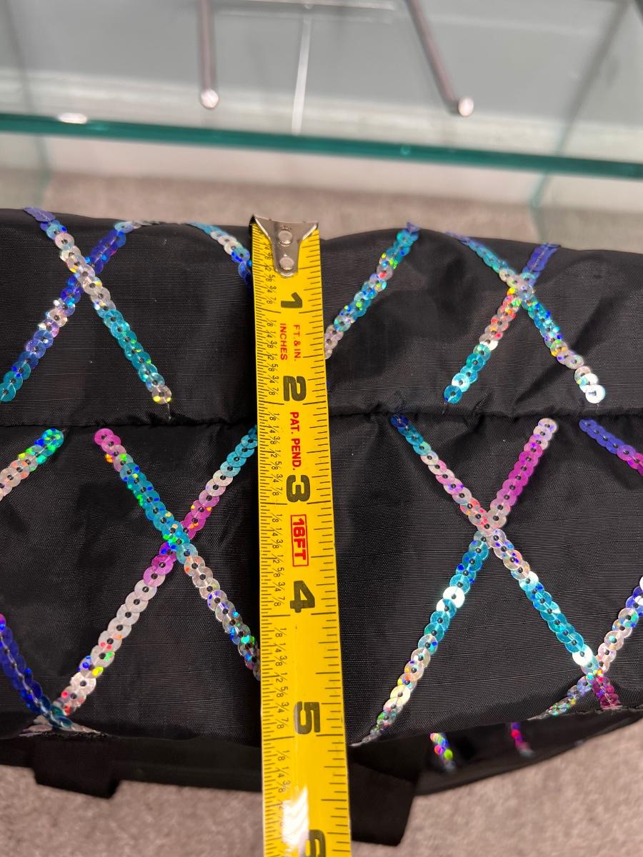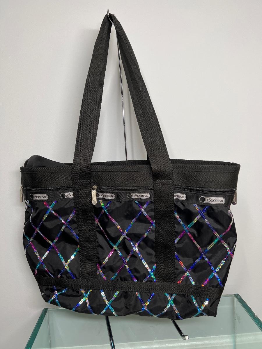 Holographic basket weave sequin design on black nylon. Condition is rated as very good. Very slight marks here and there as shown in pics. Interior is clean. No fraying to straps.
