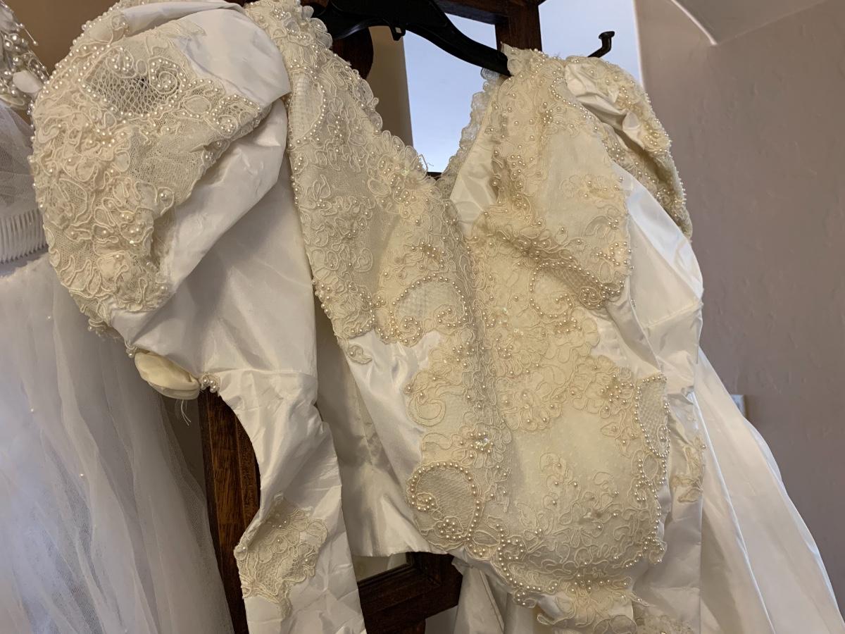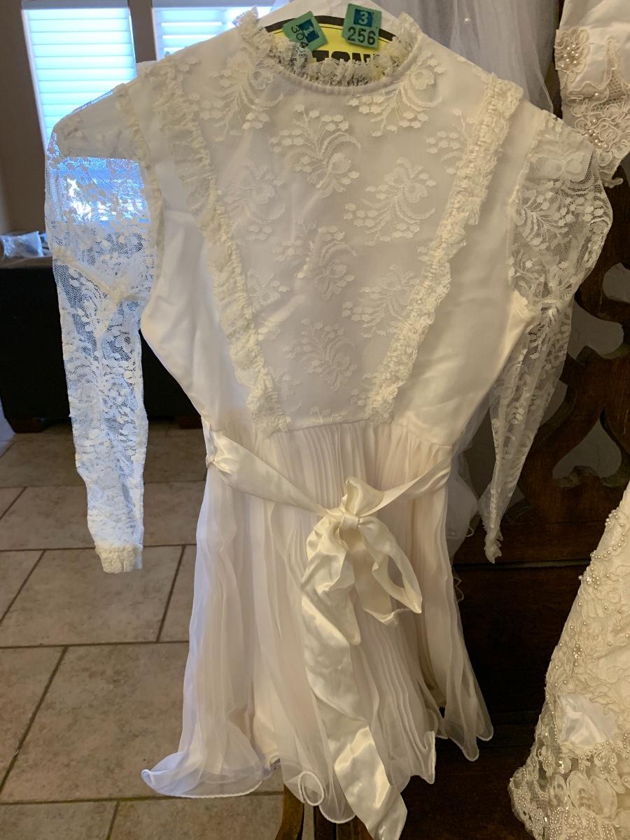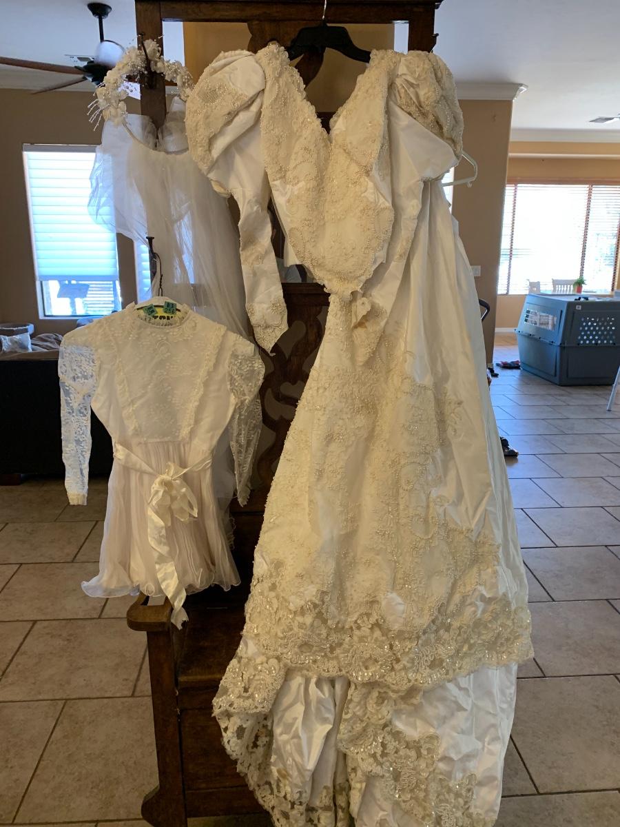 One two piece lace and beaded wedding dress with veil (brand Jobre Original petite size and in good condition with the exception of some obvious staining seen in pictures) and a flower girl dress in great condition