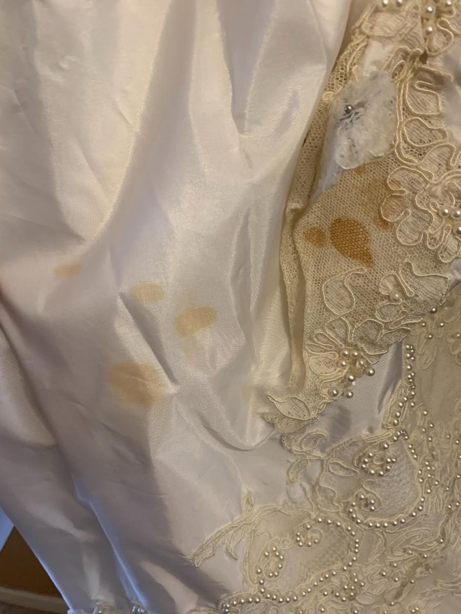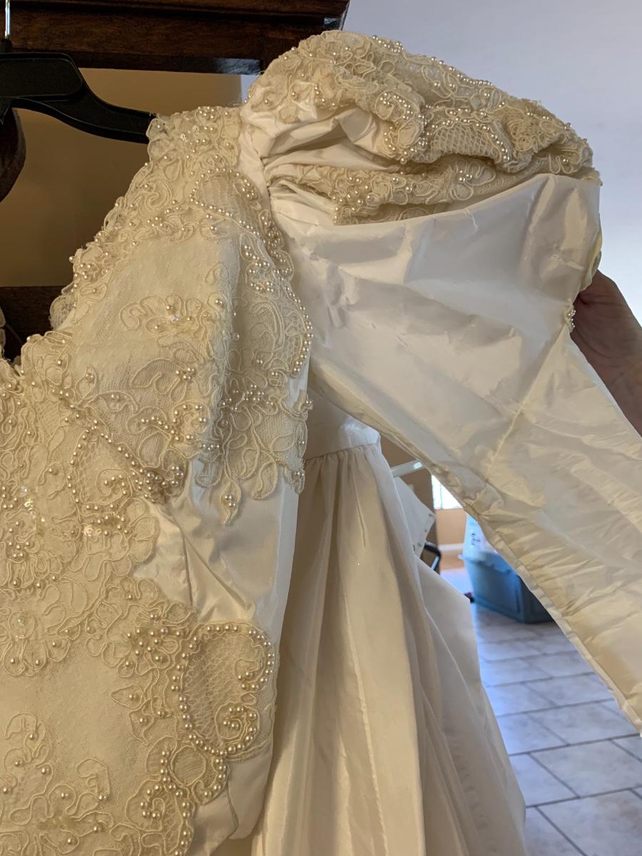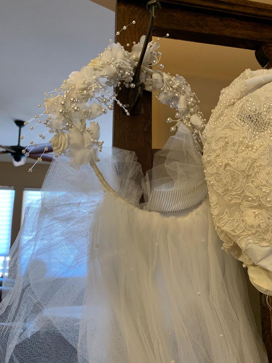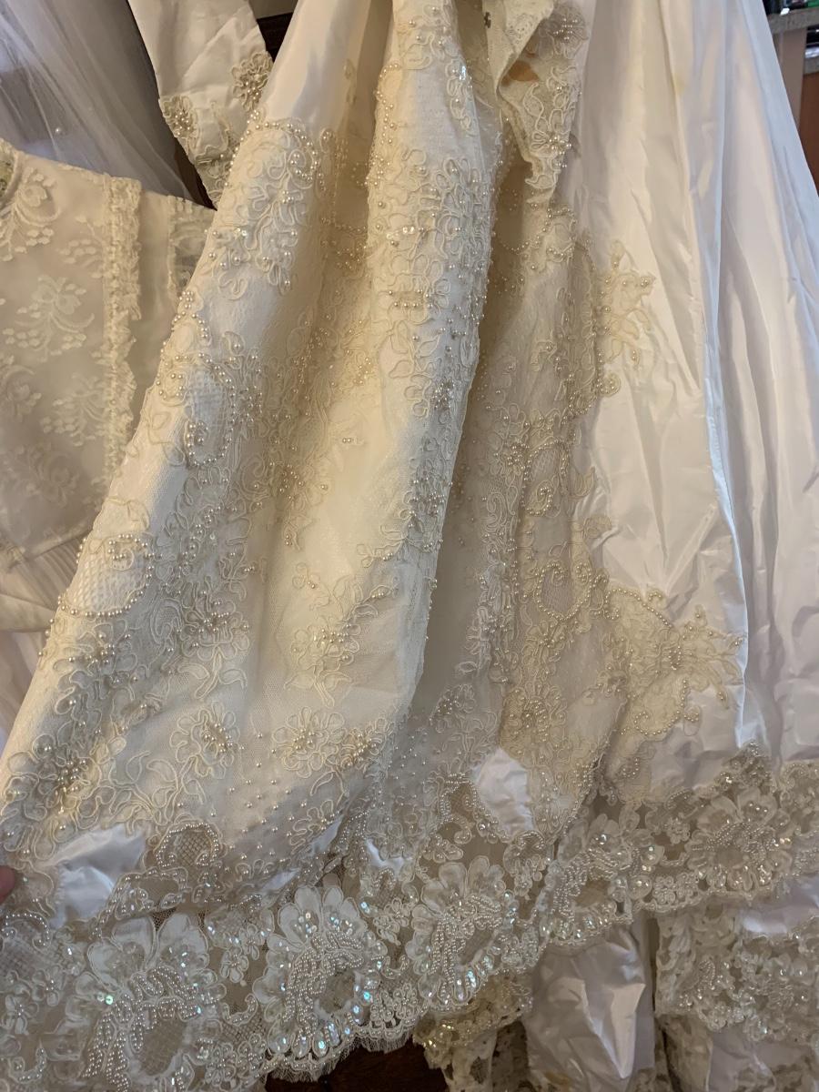 One two piece lace and beaded wedding dress with veil (brand Jobre Original petite size and in good condition with the exception of some obvious staining seen in pictures) and a flower girl dress in great condition
