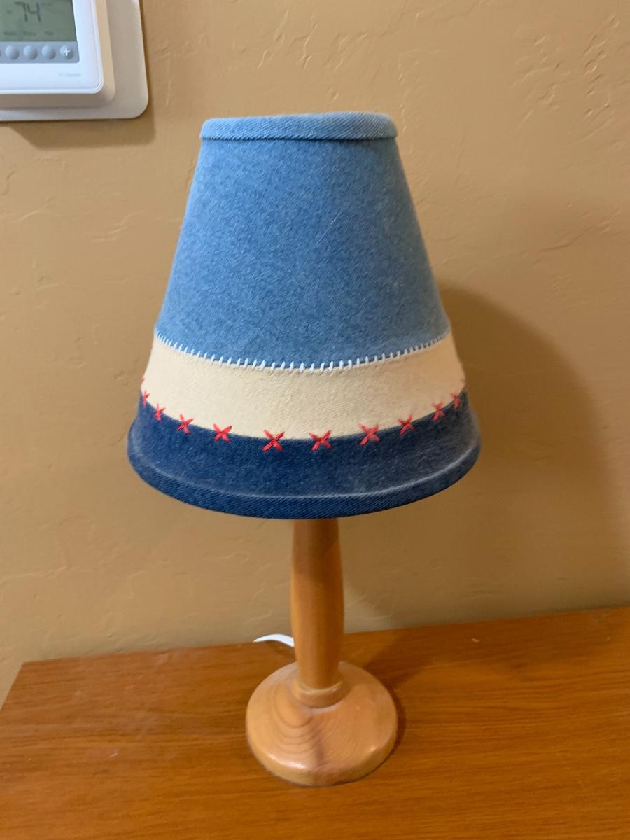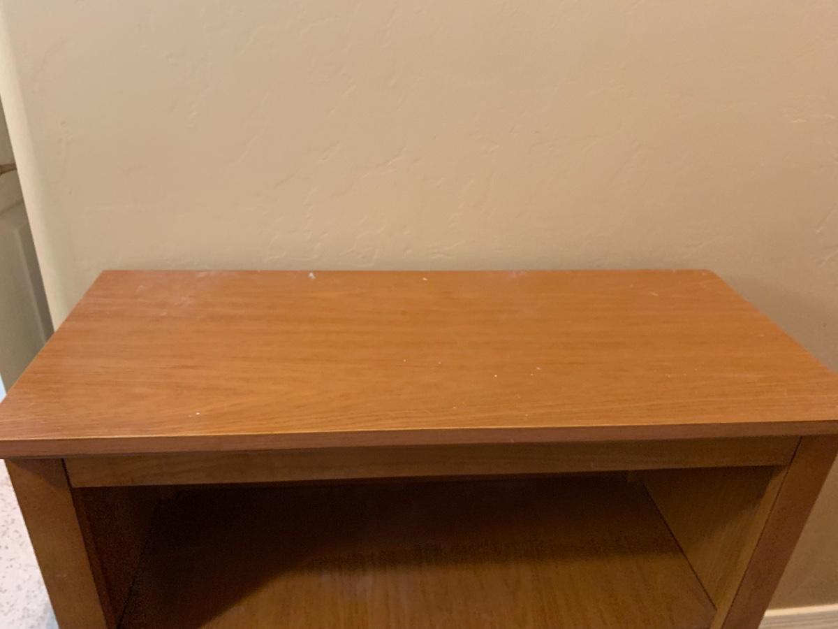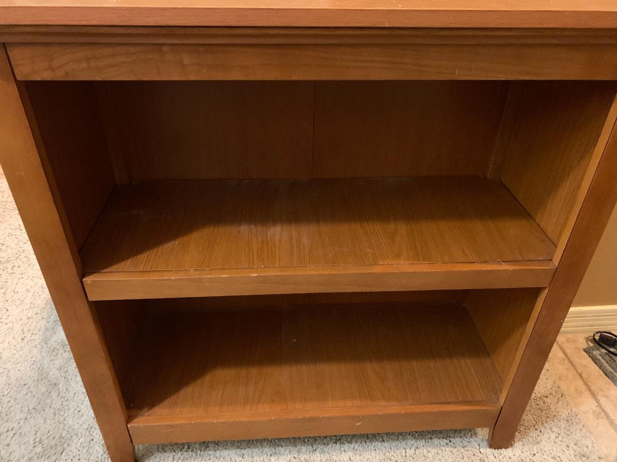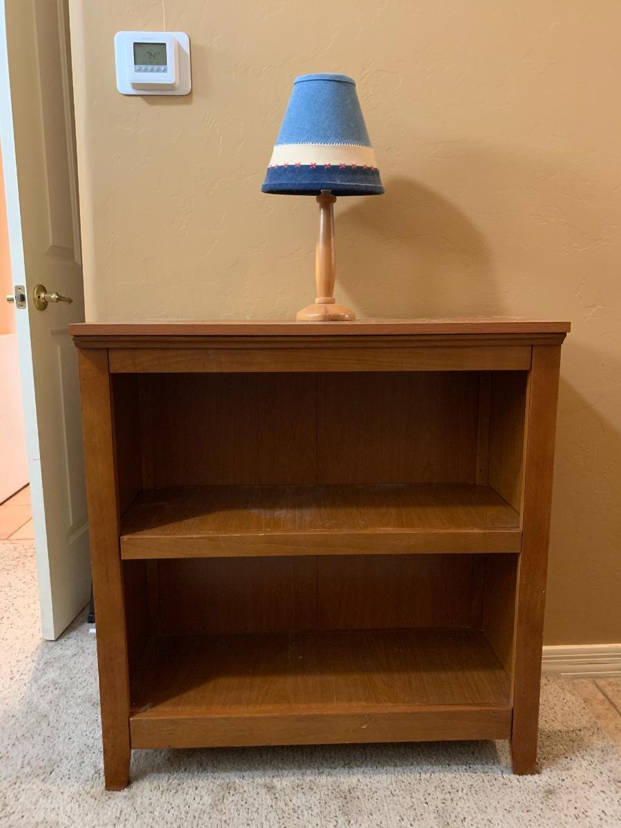 One wooden bookshelf in good condition with normal wear and one table lamp in good condition. Bookshelf has two shelves