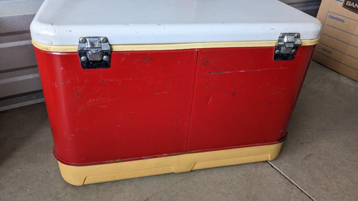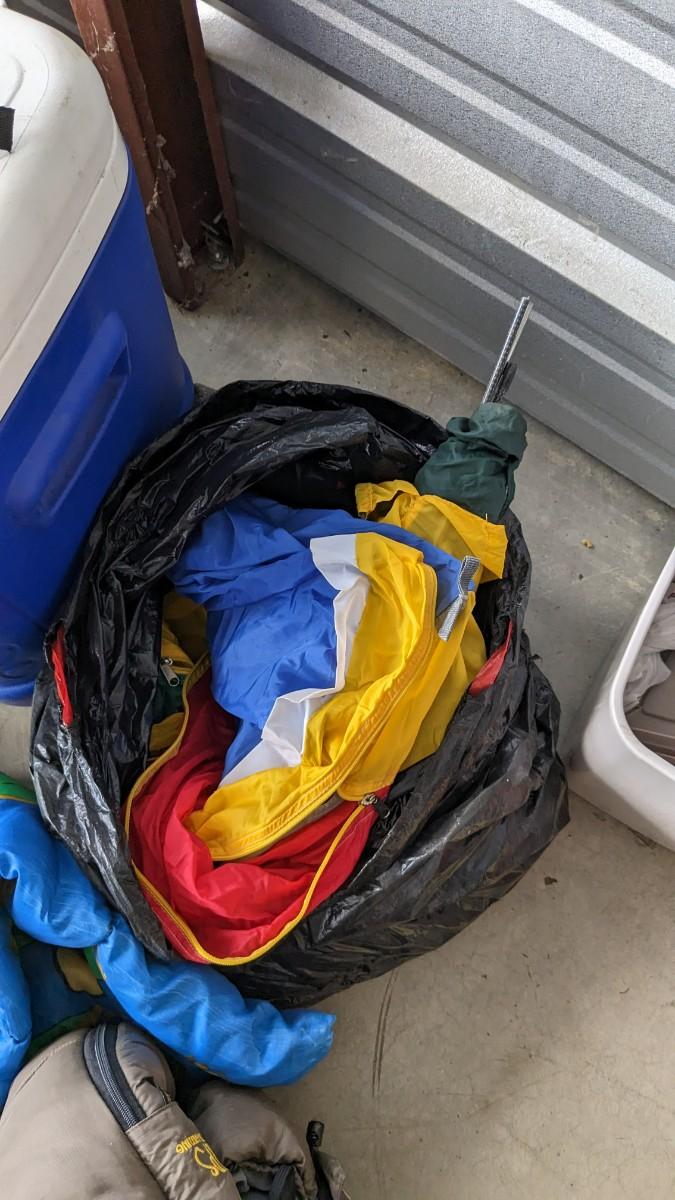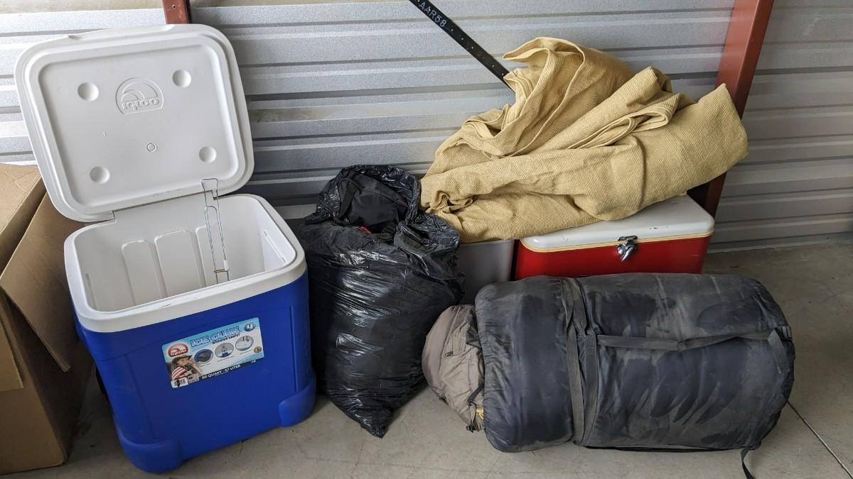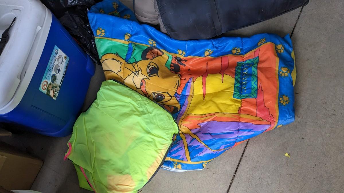 some great camping goods up for grabs. Includes presumed complete 2 person tent, vintage Lion King sleeping bag, adult sleeping bag, 2 coolers including vintage piece that's in great shape for age, camping chair, and more! No shipping. 2616
