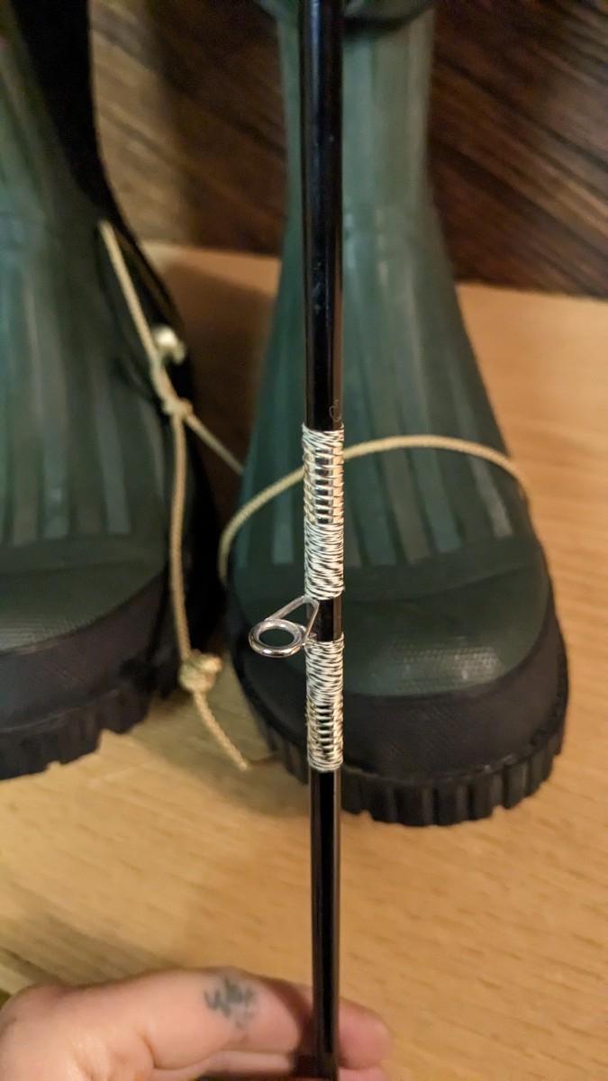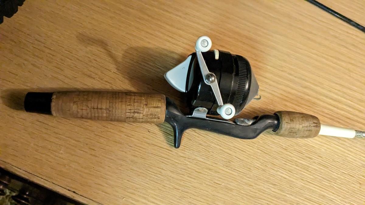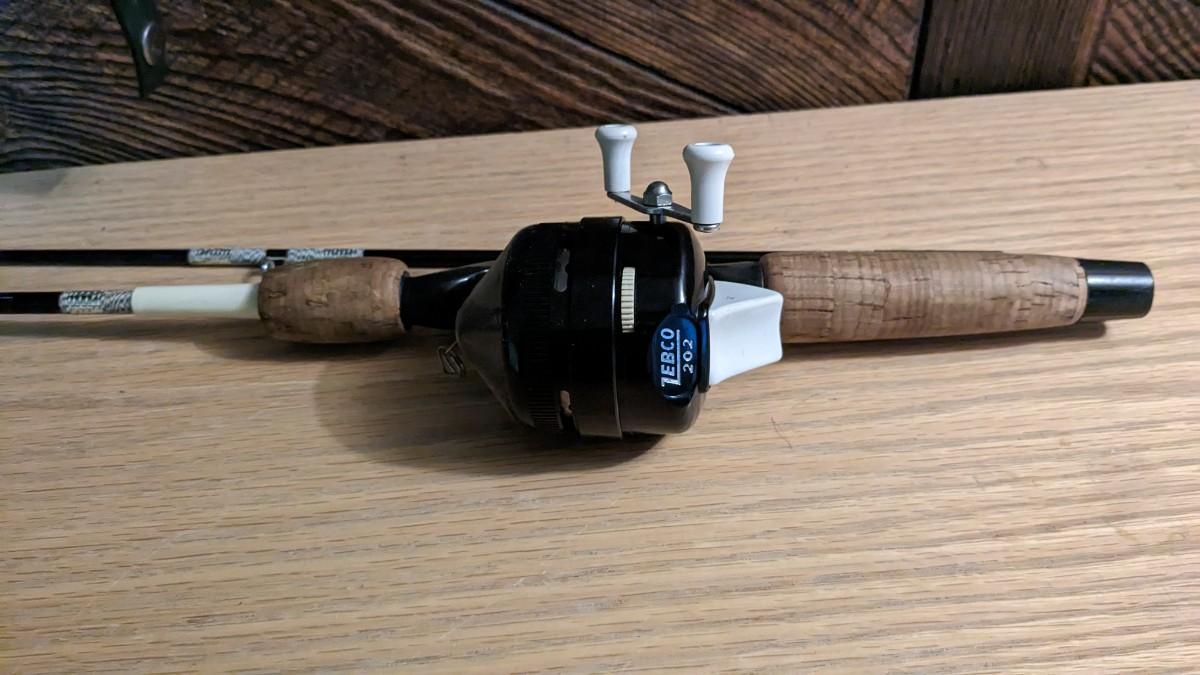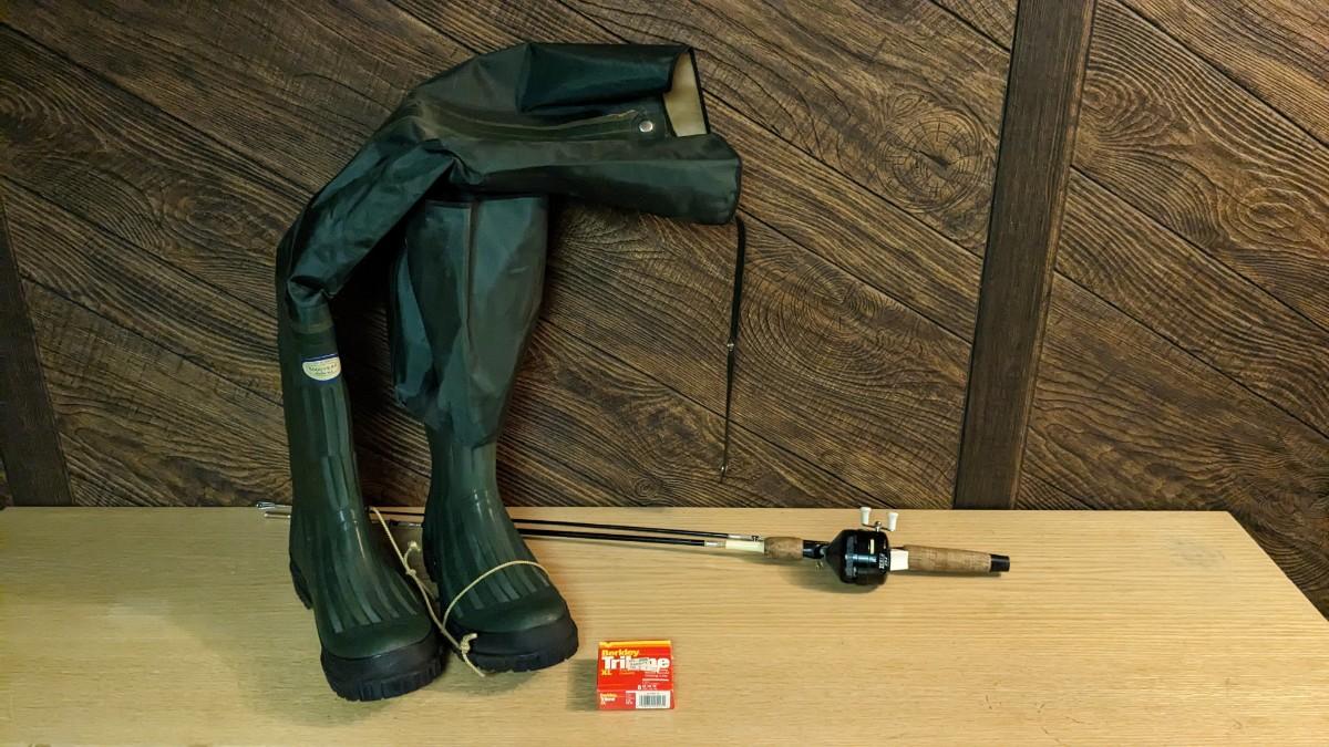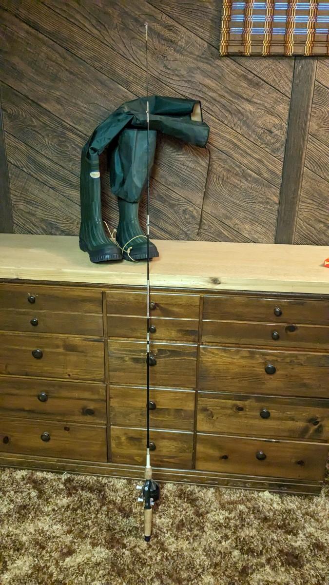 size 12 Goodyear waders that appear to have never been worn. Zebco 3300 cork handle rod with Zebco 202 reel, and a pack new fishing line. basement