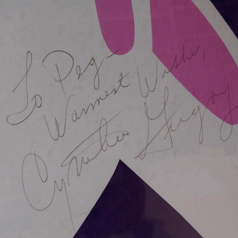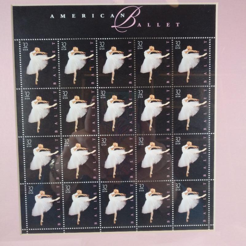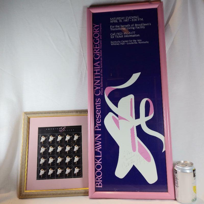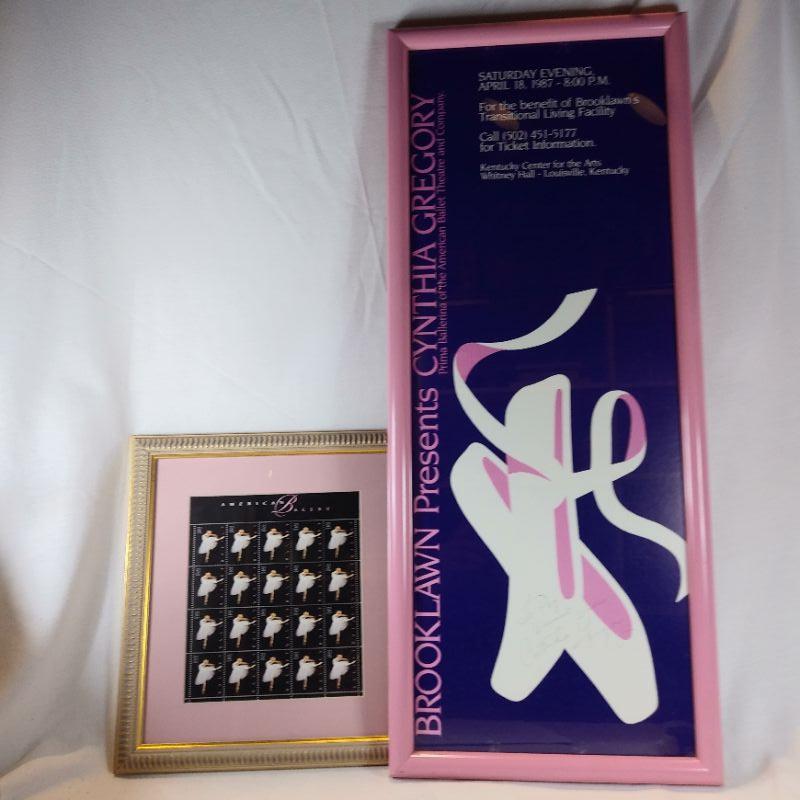 Ballet Stamps - 32 cents USA - 20 per sheet. Framed and matted to 11-inches wide X 12-inches tall. Also included is a framed poster of a Ballet Performance autographed by internationally known ballerina - Cynthia Gregory from 1987. Framed poster is 11 1/2-inches wide X 27 1/2-inches wide. Both are nicely framed and in very good condition. Ready to hang in your ballet star's bedroom.