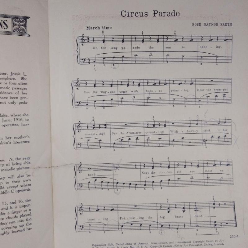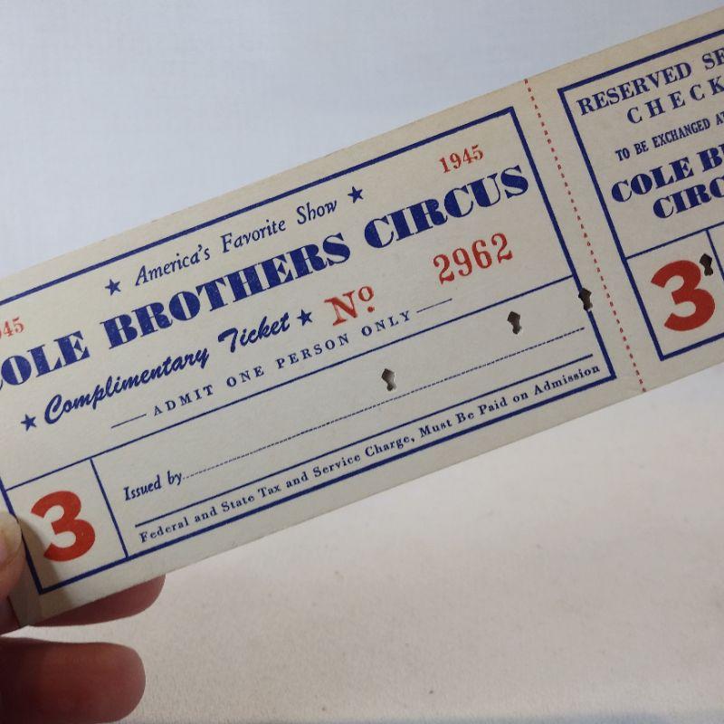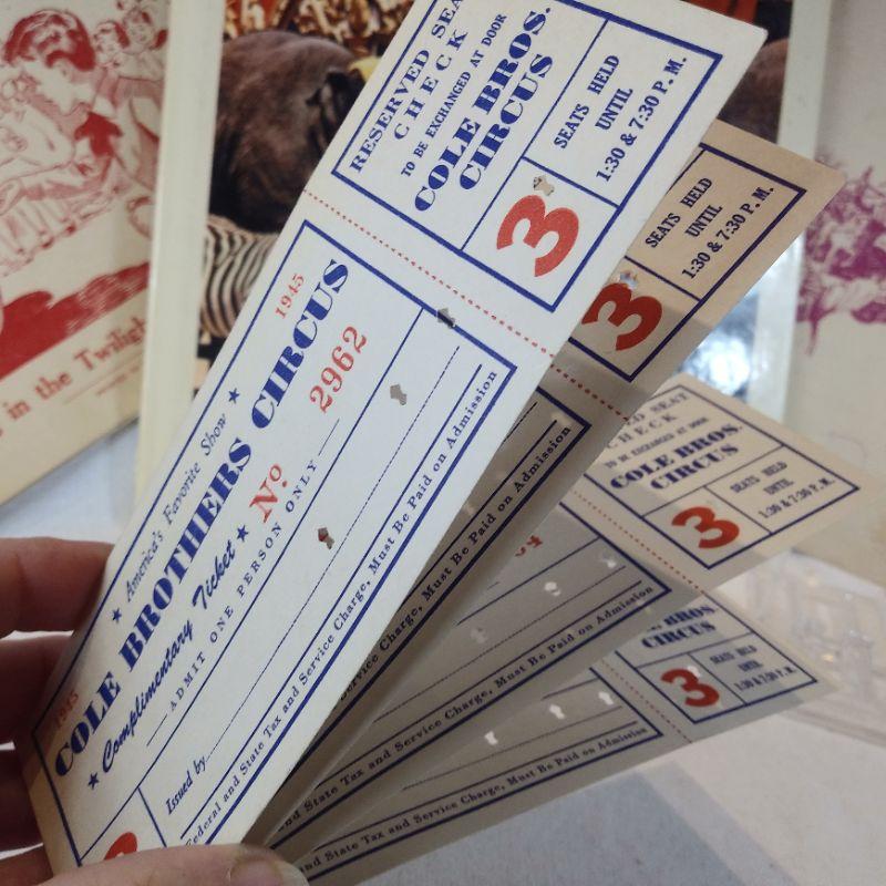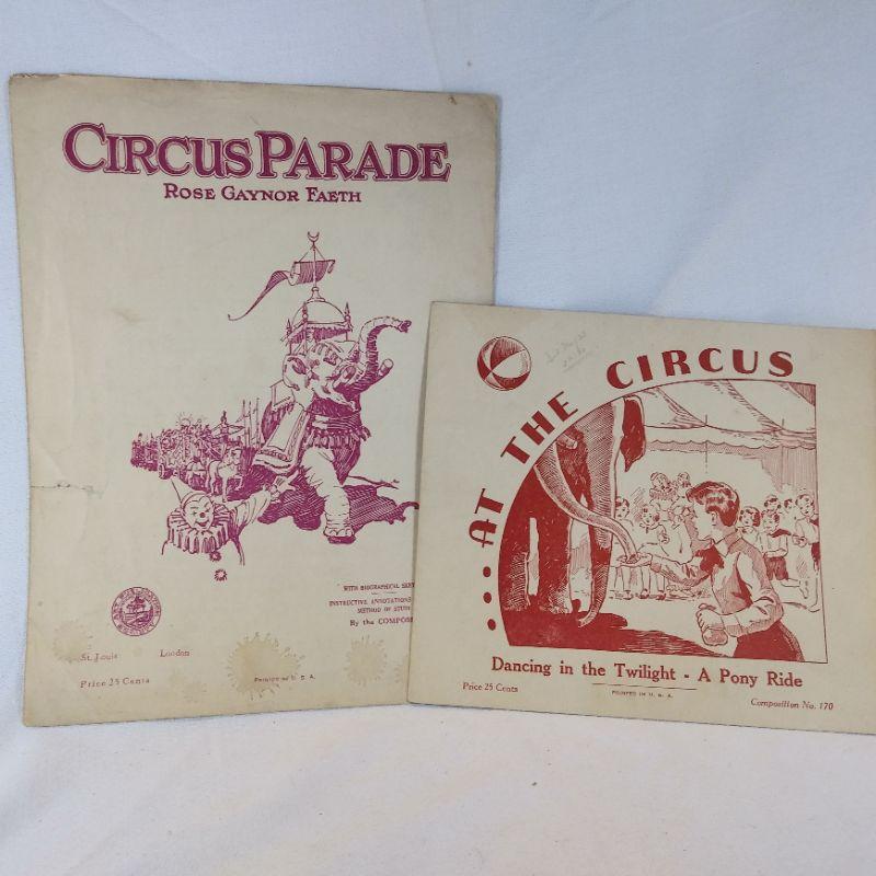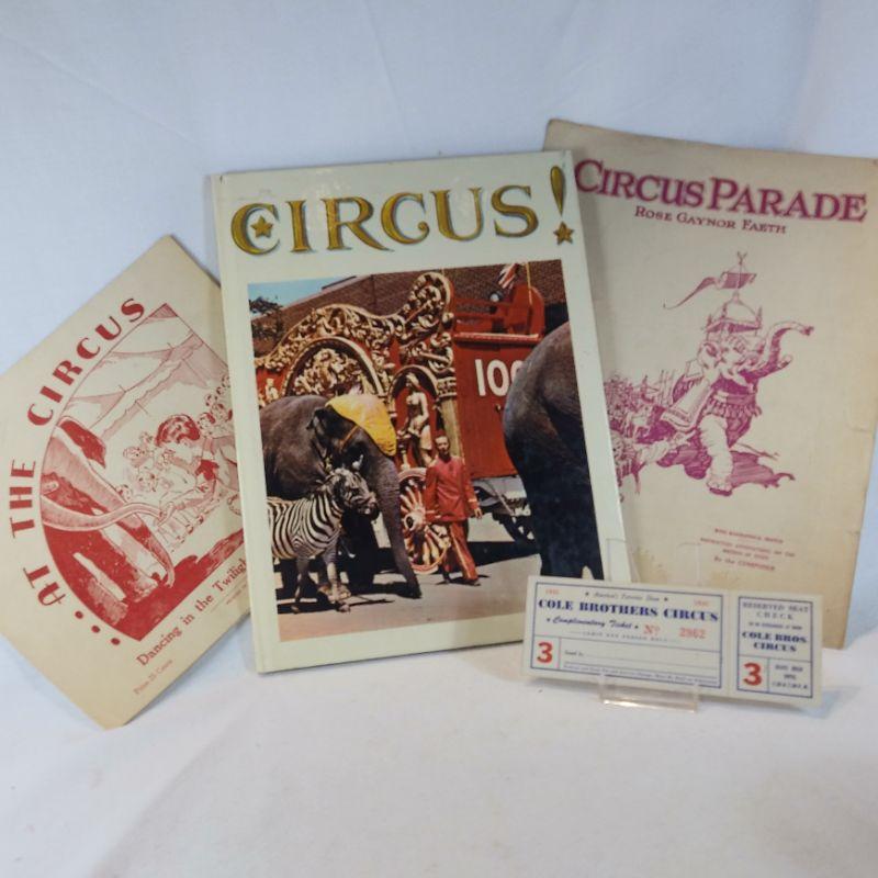 Circus collectibles that include a hard cover book - "Circus!" - full of pictures and has 64 pages - dated 1964: Two sets of sheet music - "Circus Parade" (cover has a few tears) and "...At the Circus" which contain 3 sets of music "At The Circus", "Dancing in the Twilight" and "Pony Ride"; small booklet of 4 unused circus tickets to Cole Bros Circus 1945. Nice collection for the circus enthusiast.