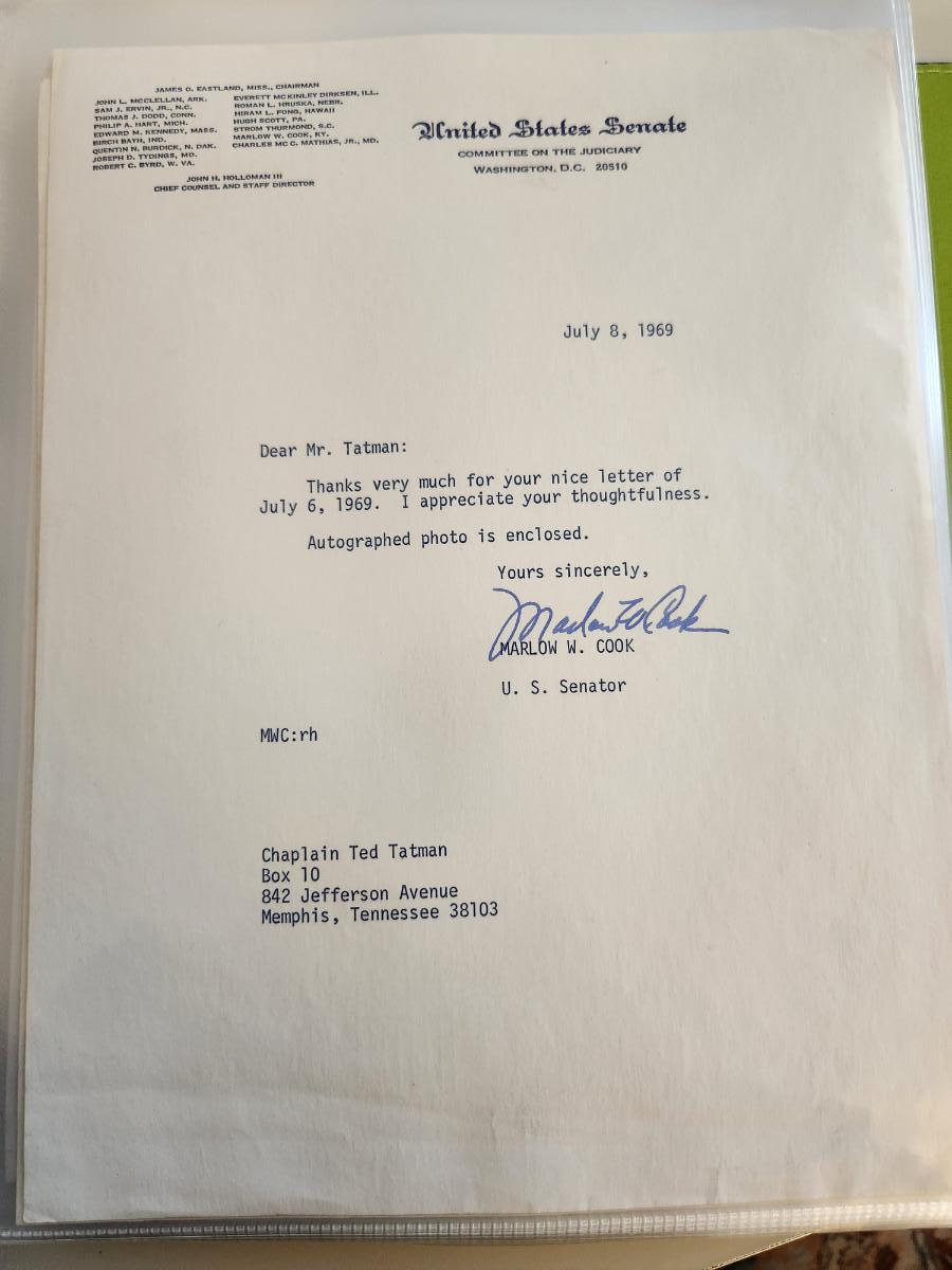 This auction lot is for a Letter and Autographed Photo of Kentucky Senator Marlow W. Cook. Senator Cook was in office when this letter was written on July 8, 1969. Marlow Cook was Jefferson County Judge-Executive for a time and was primarily responsible for the City's purchase of the Belle of Louisville historic river boat steamer.