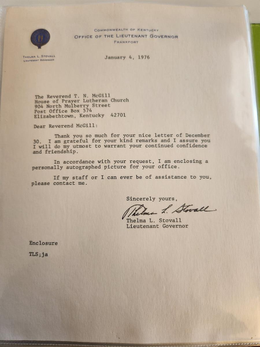 Letter and Autographed Photograph from Kentucky Lt. Governor Thelma Stovall