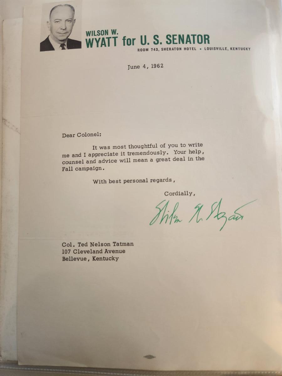 This auction lot is for a Letter and Autographed Photograph of Wilson Wyatt of Kentucky. Wilson W. Wyatt was a Mayor of Louisville and Lt. Governor of Kentucky. This letter is dated June 4, 1962 and is in reference to his unsuccessful bid for a US Senate seat.