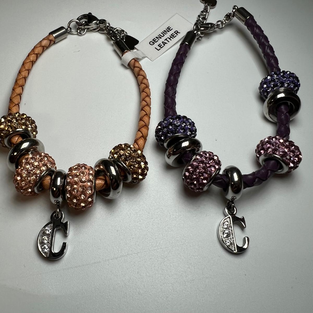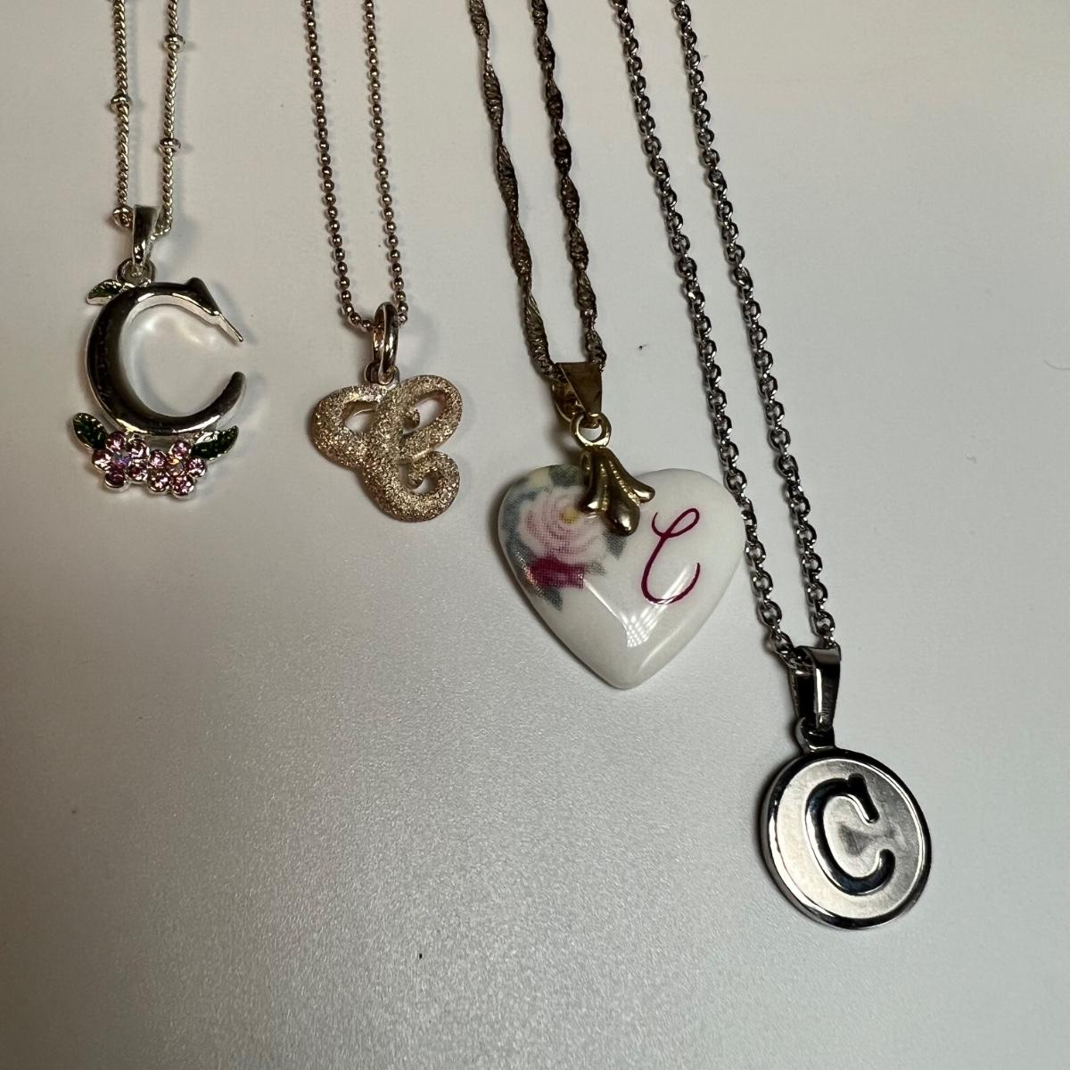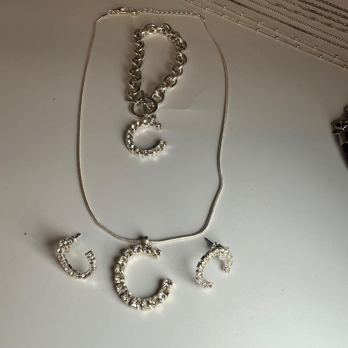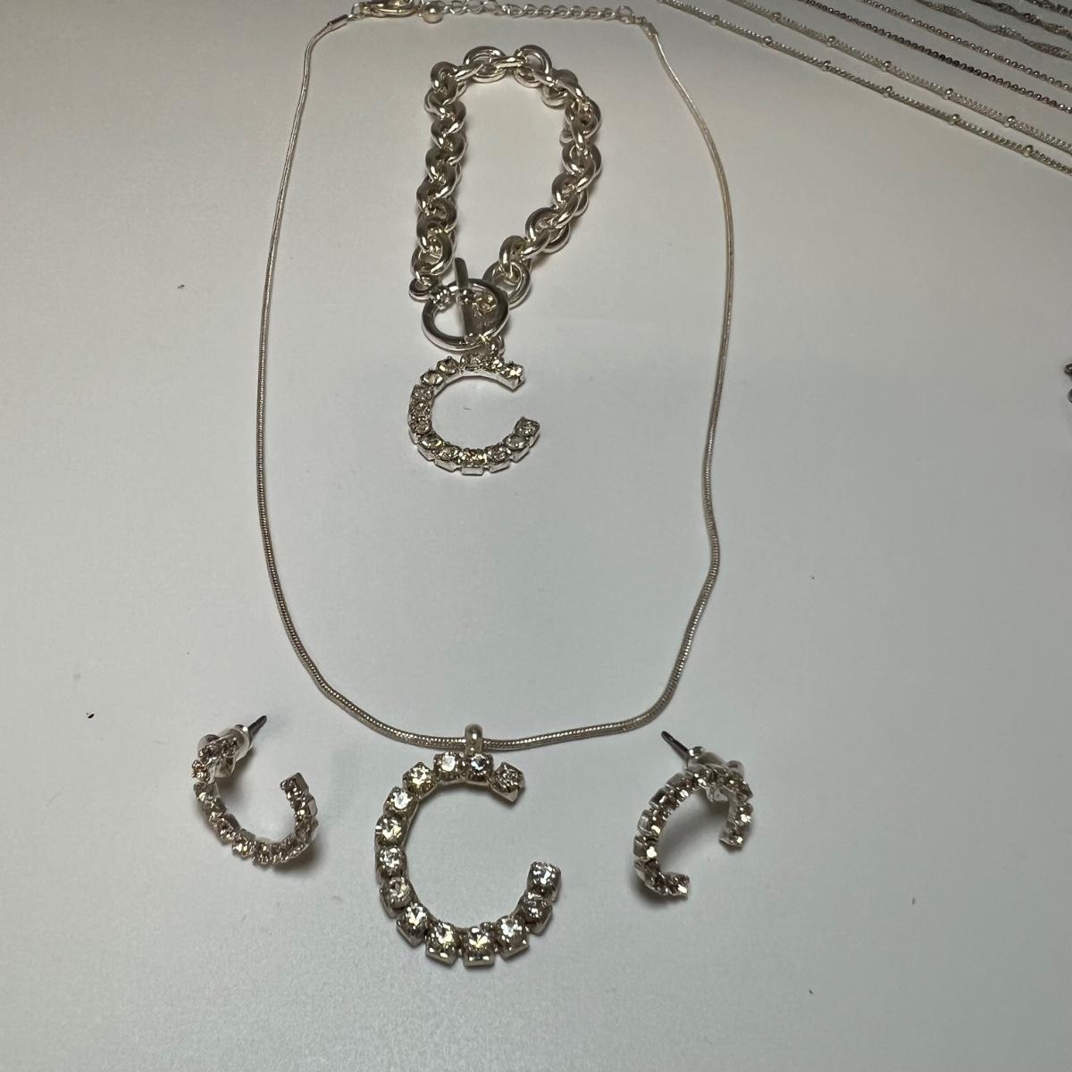 Five necklaces, three bracelets and numerous brooches, a pair of earrings and more all have the letter "C". One brooch has the name Charlotte. The shortest necklace is 16” with a knot pendant that is stamped 925. The longest necklace is the rhinestone C that measures 18”. The one pair of earrings which matches this necklace and bracelet are for pierced ears. The two braided bracelets have tags that say genuine leather. Please see photos for all markings found. We cannot guarantee the authenticity of the gemstones.