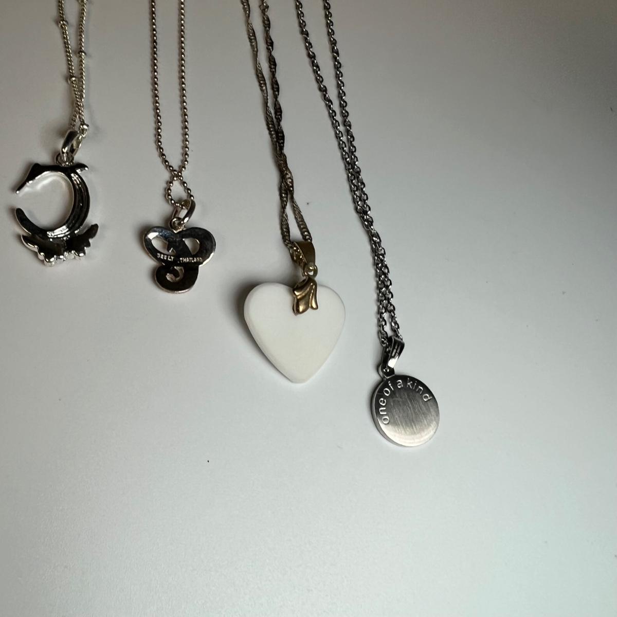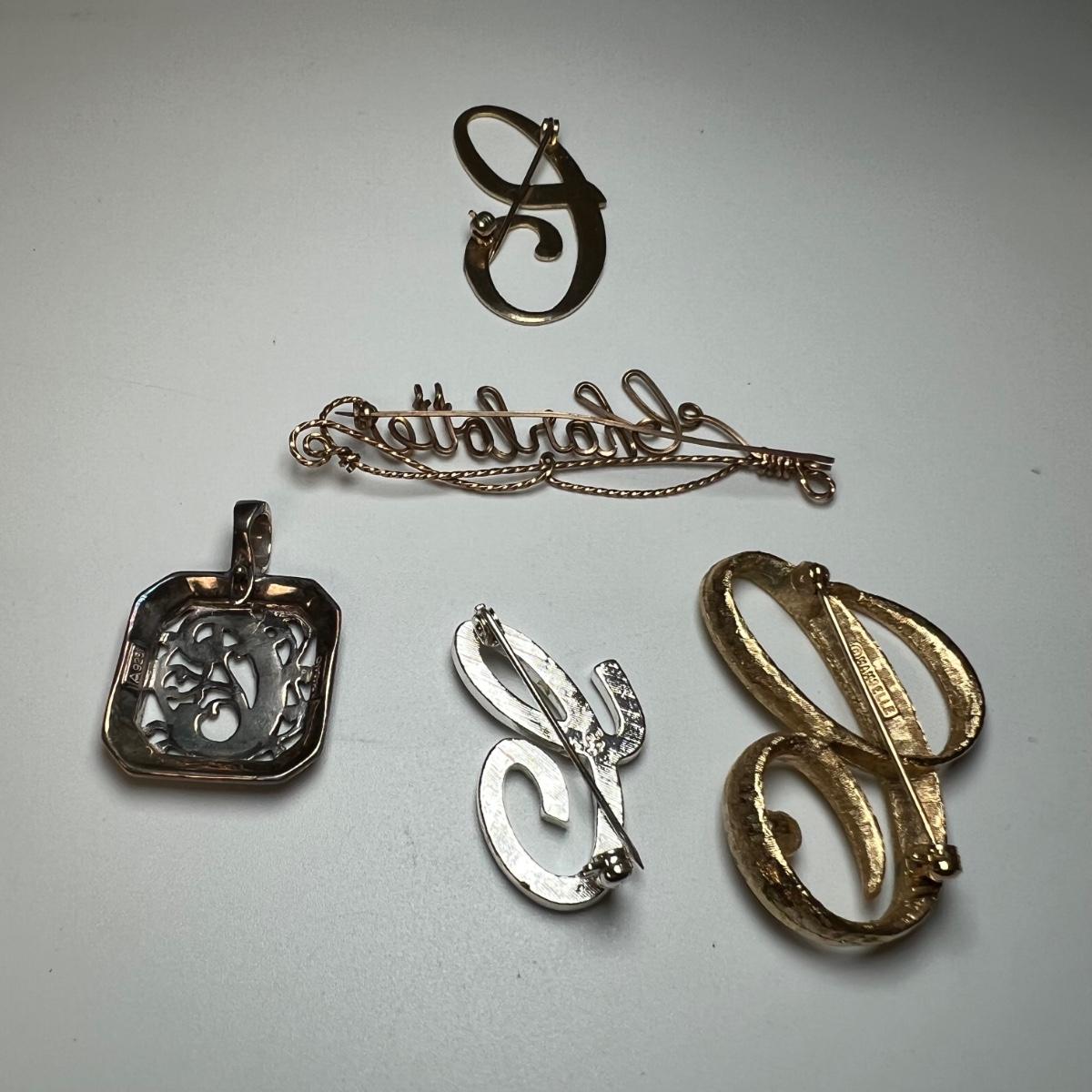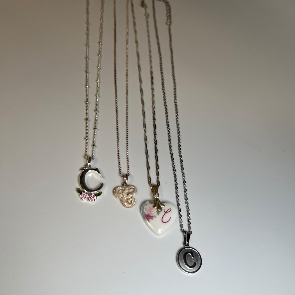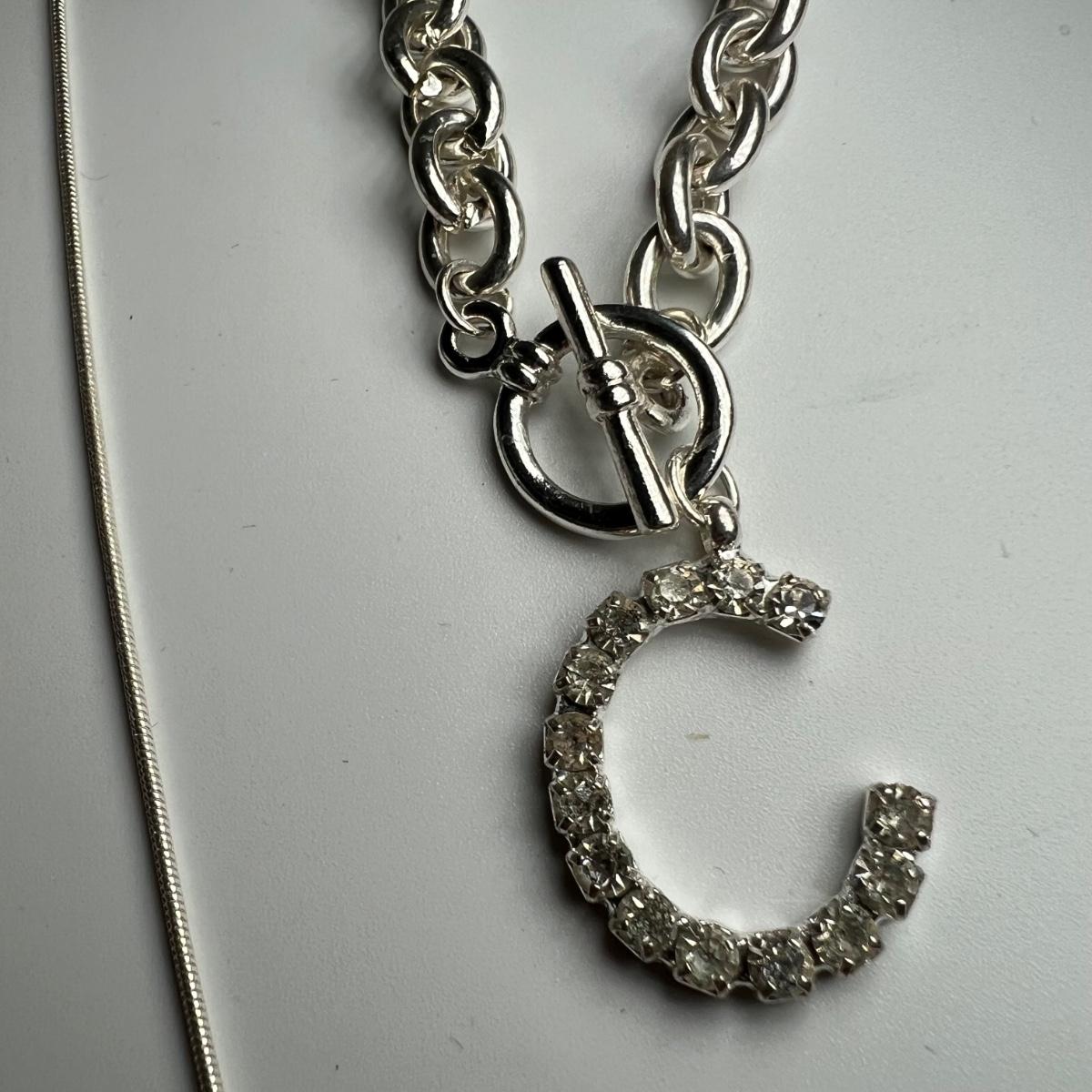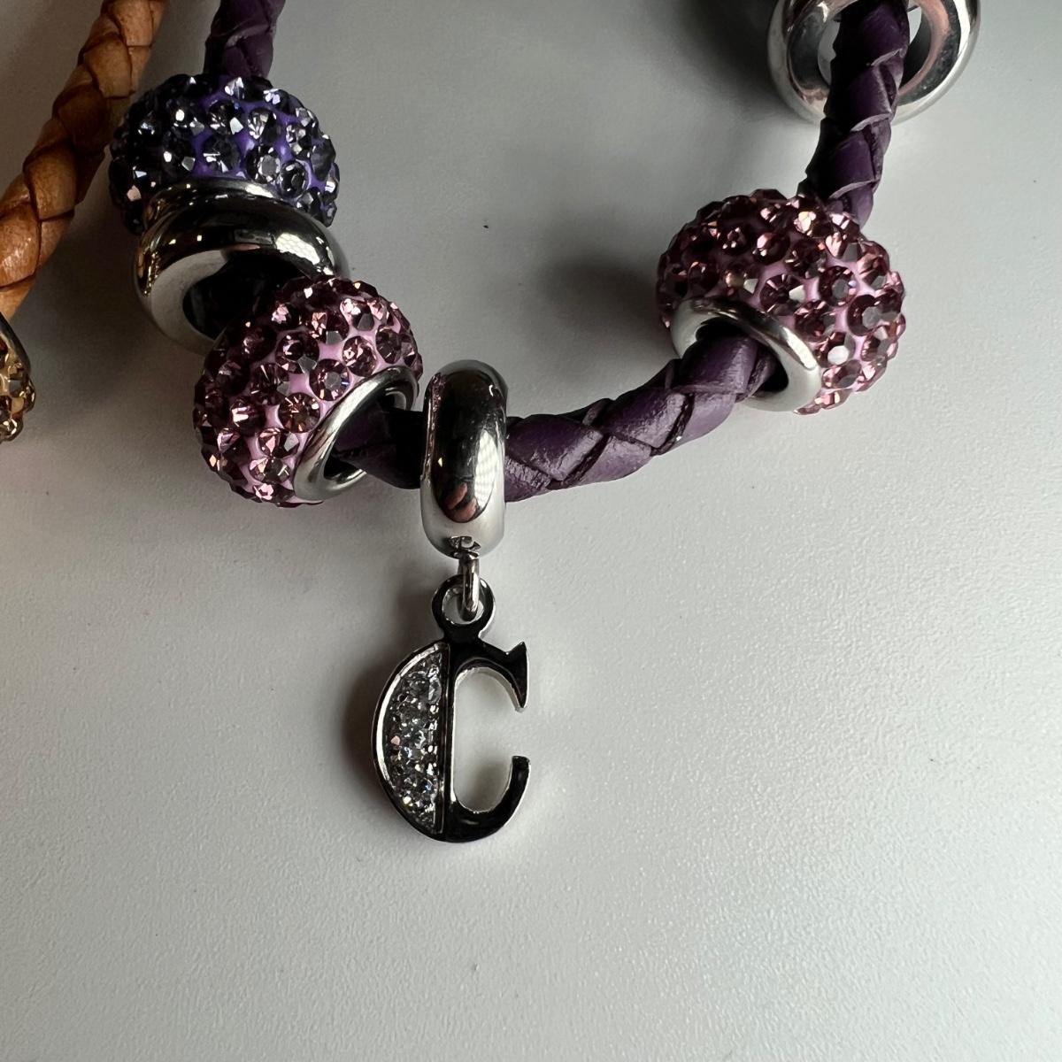 Five necklaces, three bracelets and numerous brooches, a pair of earrings and more all have the letter "C". One brooch has the name Charlotte. The shortest necklace is 16” with a knot pendant that is stamped 925. The longest necklace is the rhinestone C that measures 18”. The one pair of earrings which matches this necklace and bracelet are for pierced ears. The two braided bracelets have tags that say genuine leather. Please see photos for all markings found. We cannot guarantee the authenticity of the gemstones.