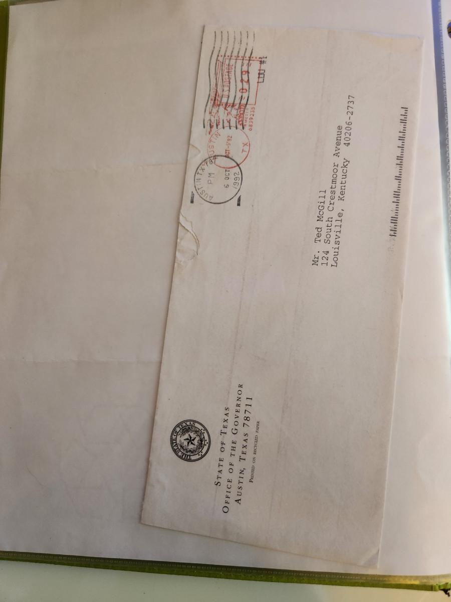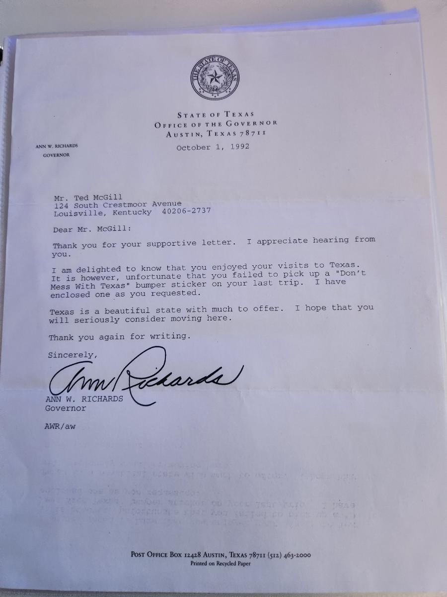 This auction lot is for a Letter from Ann Richards, Governor of Texas. The letter is acknowledging Fr, McGill's request for a bumper sticker. comes with envelope - signature appears to be authentic.