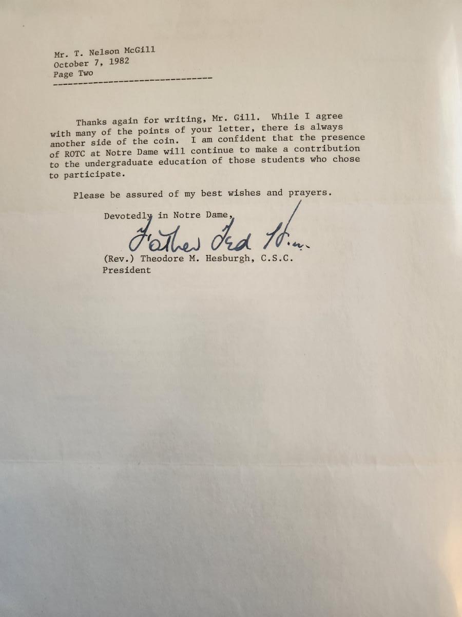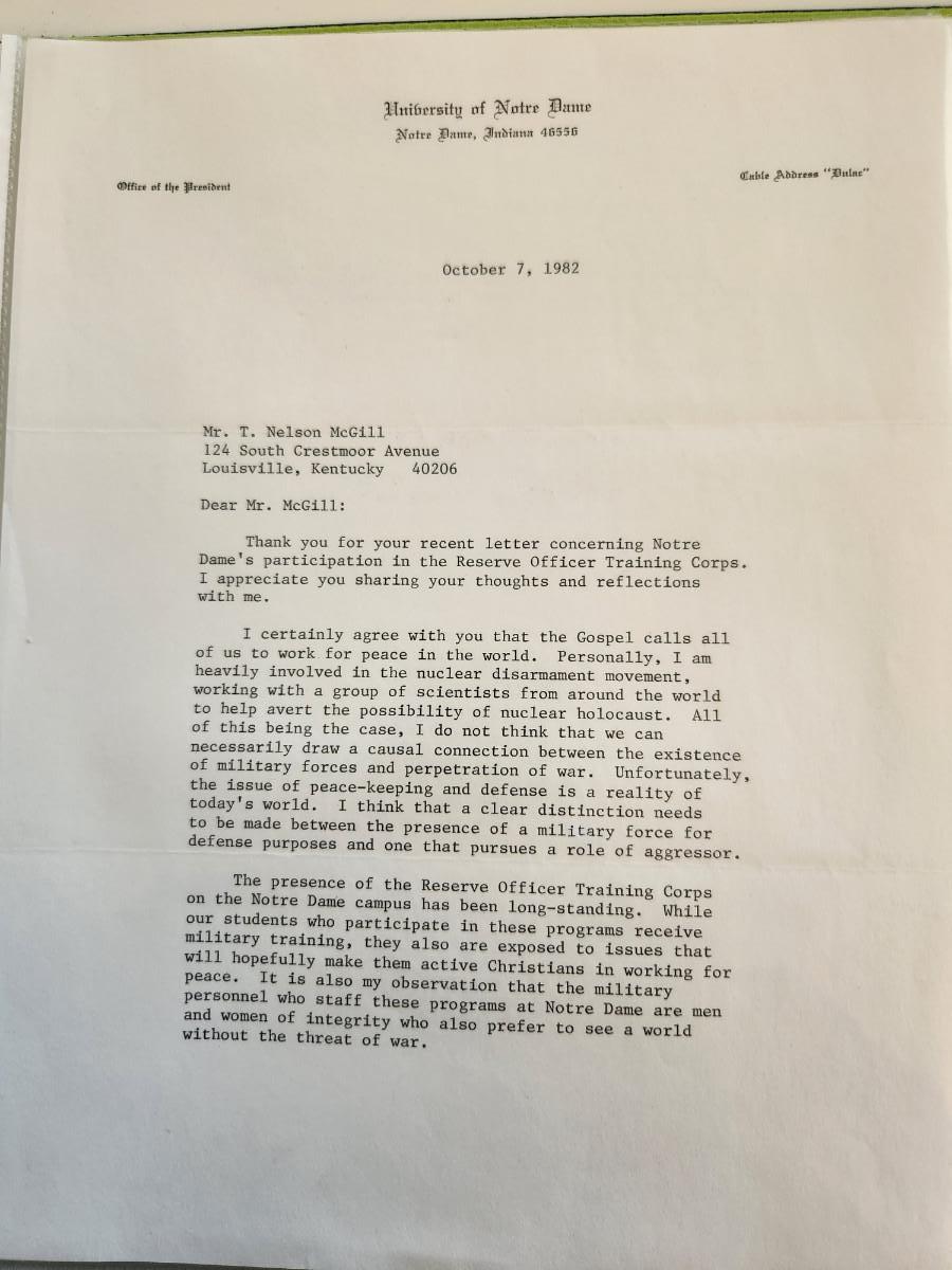 This auction lot is for a Letter from Fr. Hesburgh of Notre Dame University. The Rev. Fr. Theodore M. Hesburgh was President of the Univeristy of Notre Dame and a person of great notority. Interesting anti-war (?) content.