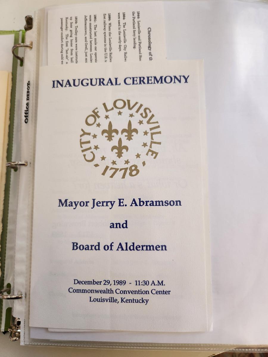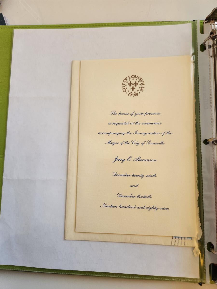 This auction lot is for a Letter from Louisville Mayor Jerry Abramson dated July 16 1987. Also included in this lot is a copy of the invitation to Mayor Abramson's Inauguration, a copy of the ceremony program and a Christmas card sent from the Mayor's office to Fr. McGill.