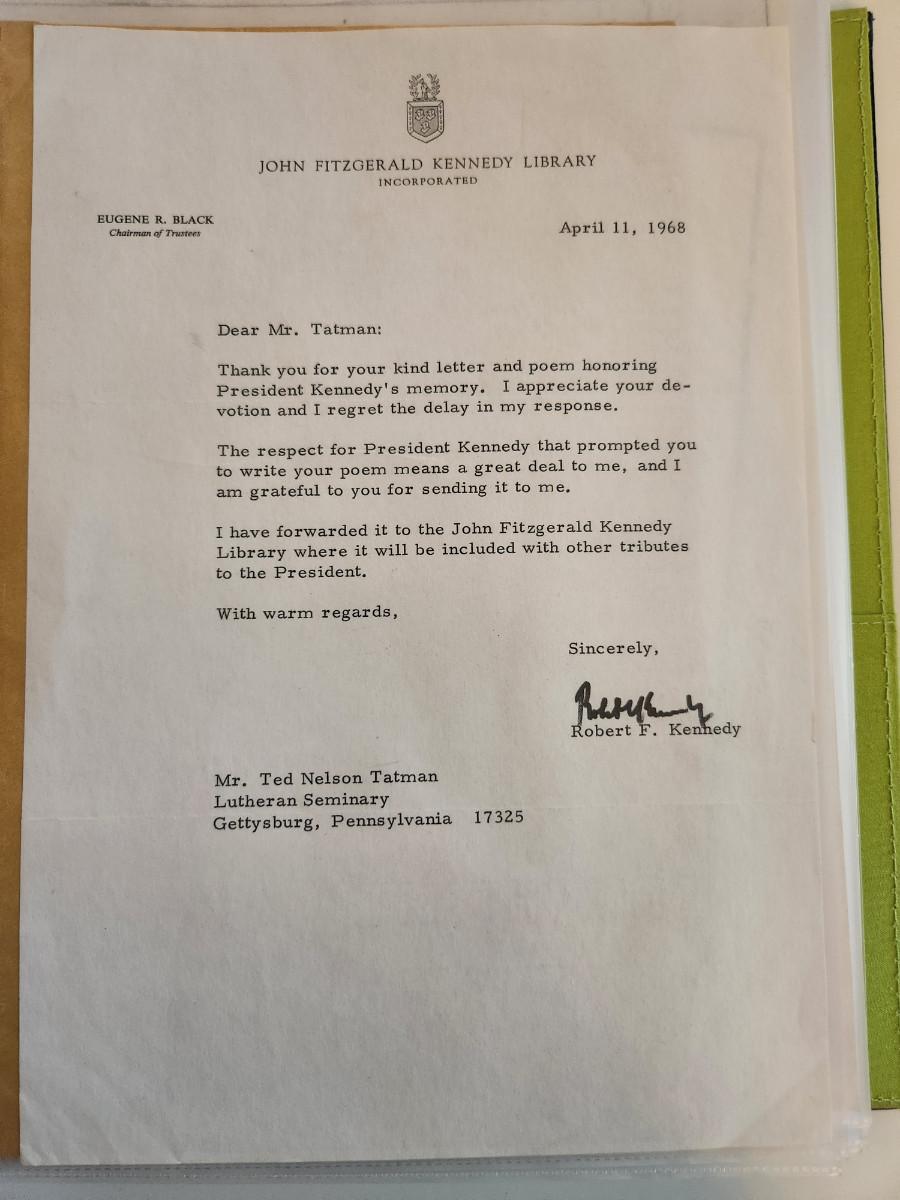 This auction lot is for a Letter from Robert Kennedy Representing the JFK Library. The letter is dated April 11, 1968 just 55 days before his own assassination in Los Angeles. Oddly this letter was found within an envelope mailed with a Senatorial frank from Edward Kennedy - that envelope is included in this lot.