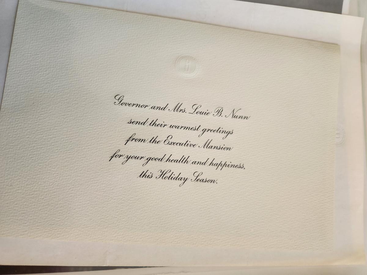 This auction lot is for Letters & Photograph from Kentucky Governor Louie B. Nunn. The first letter is dated February 1, 1968 while he was in office as was the second letter dated August 15, 1968. The photograph is unsigned. Also included is a Christmas card from the Governor's office. Auctioneer's note: During that time period my Dad always said "All the other states have Governor's but Kentucky has Nunn."