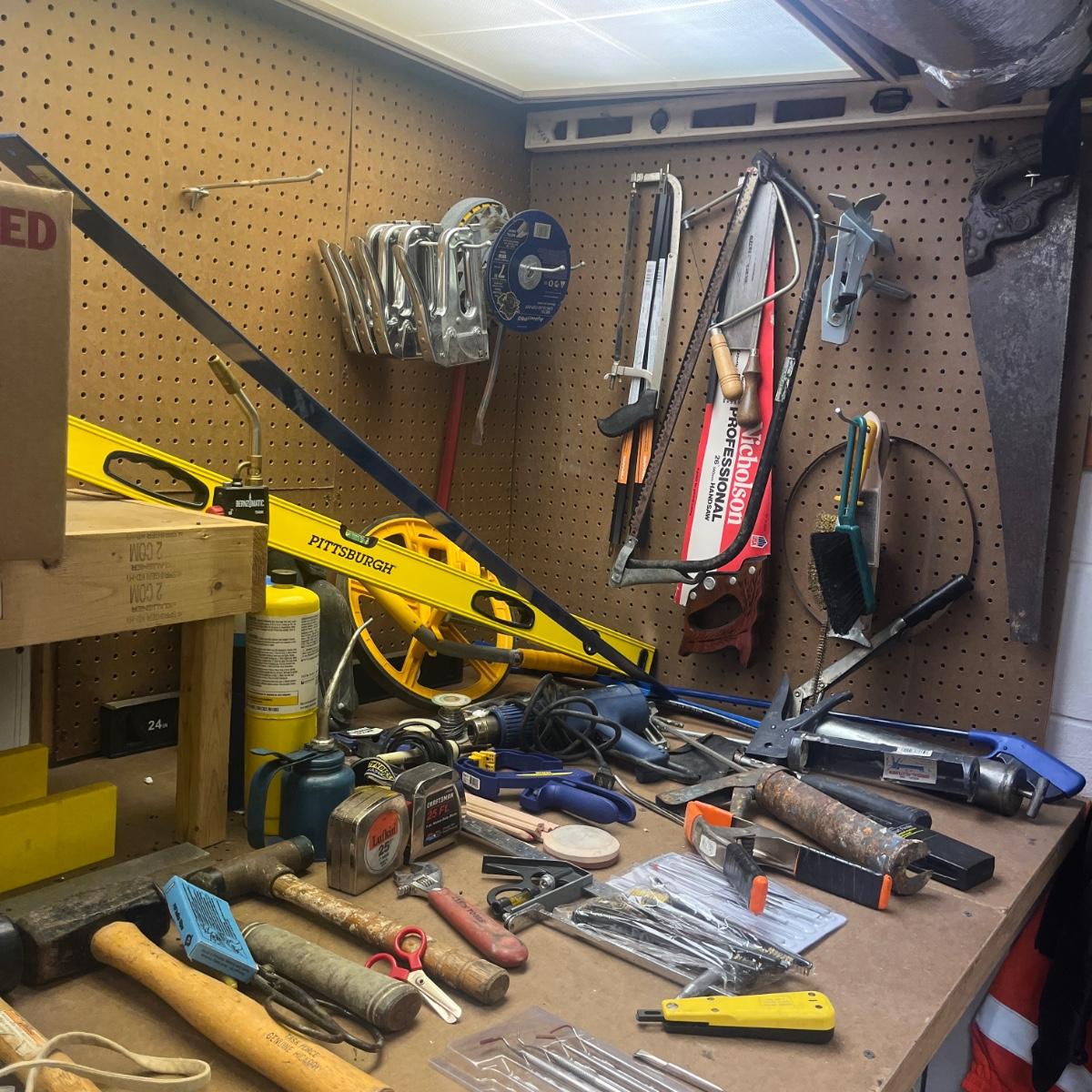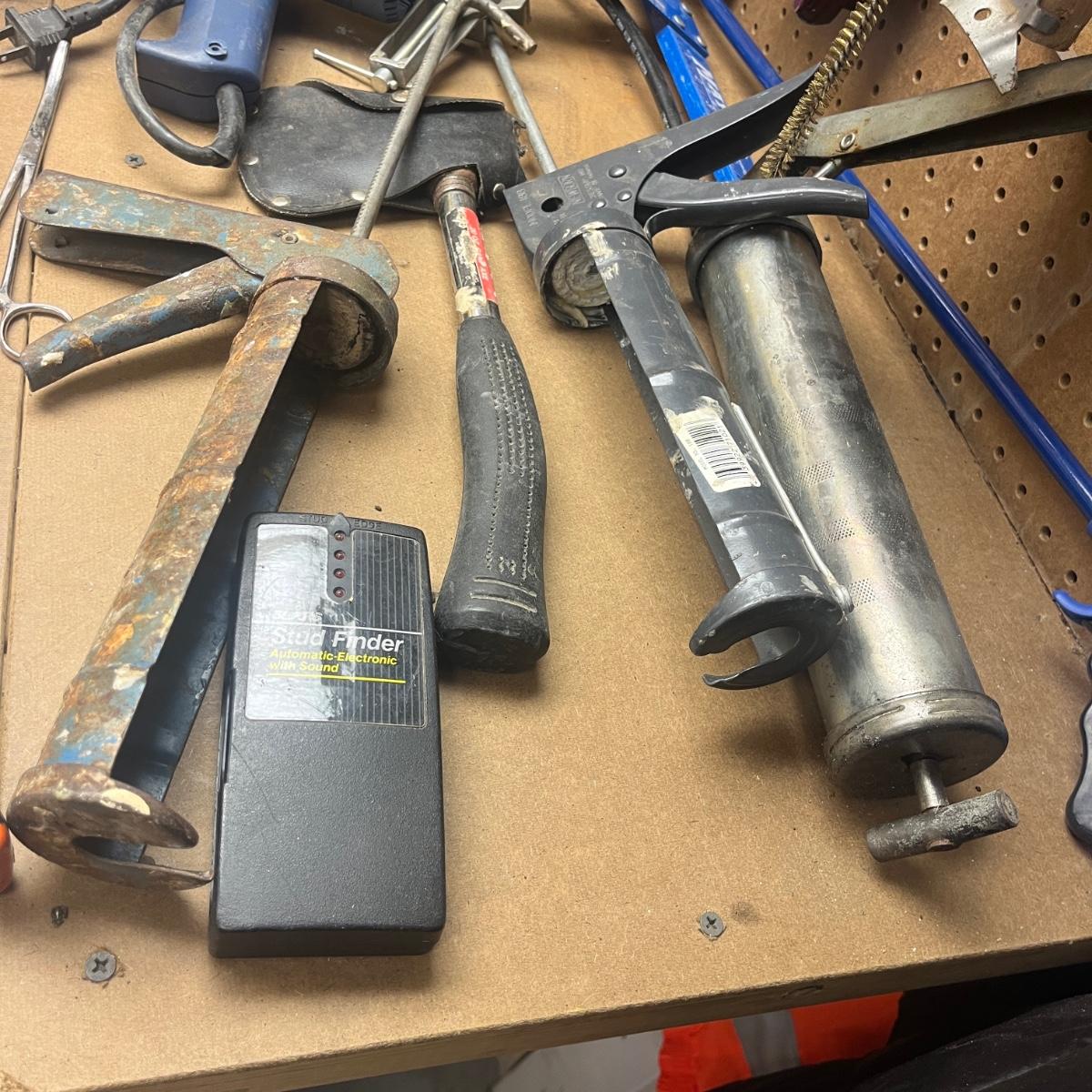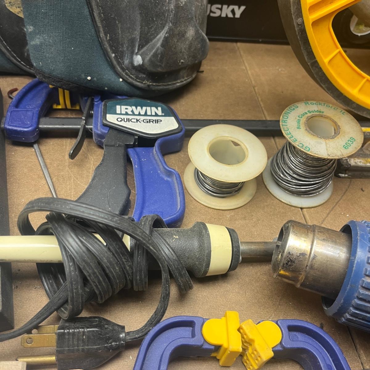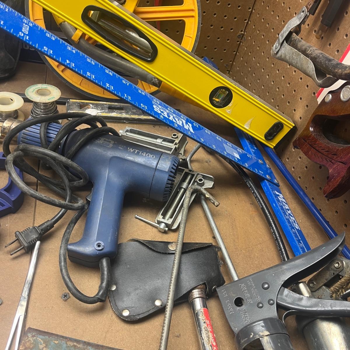 Lot includes 4 levels, mini sledge hammer, rubber hammer, hacksaw, handsaw, coping saw, measuring wheel, heat gun, soldering gun, tape measures, caulking guns, clamps and more. Longest level measures 48” long.