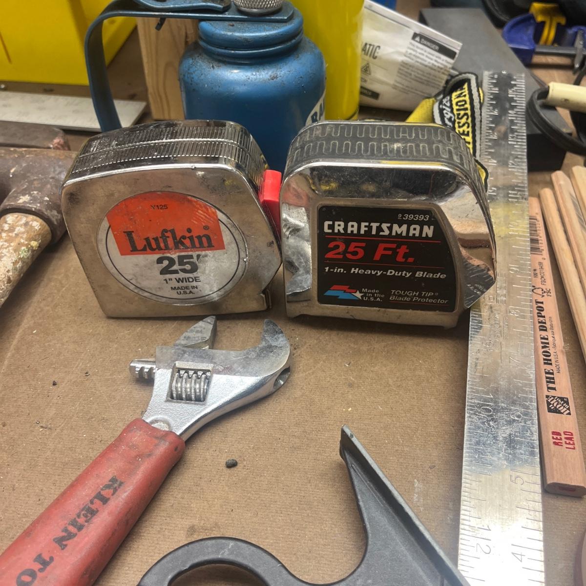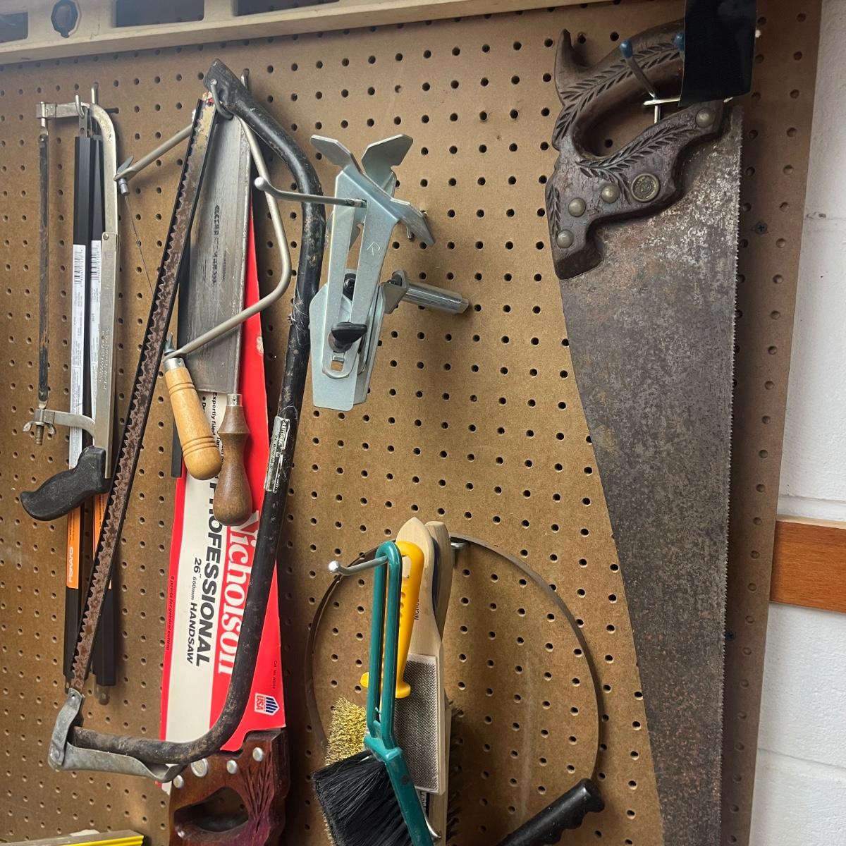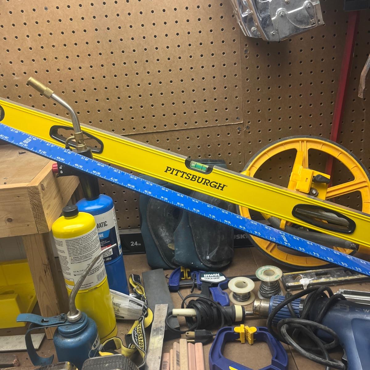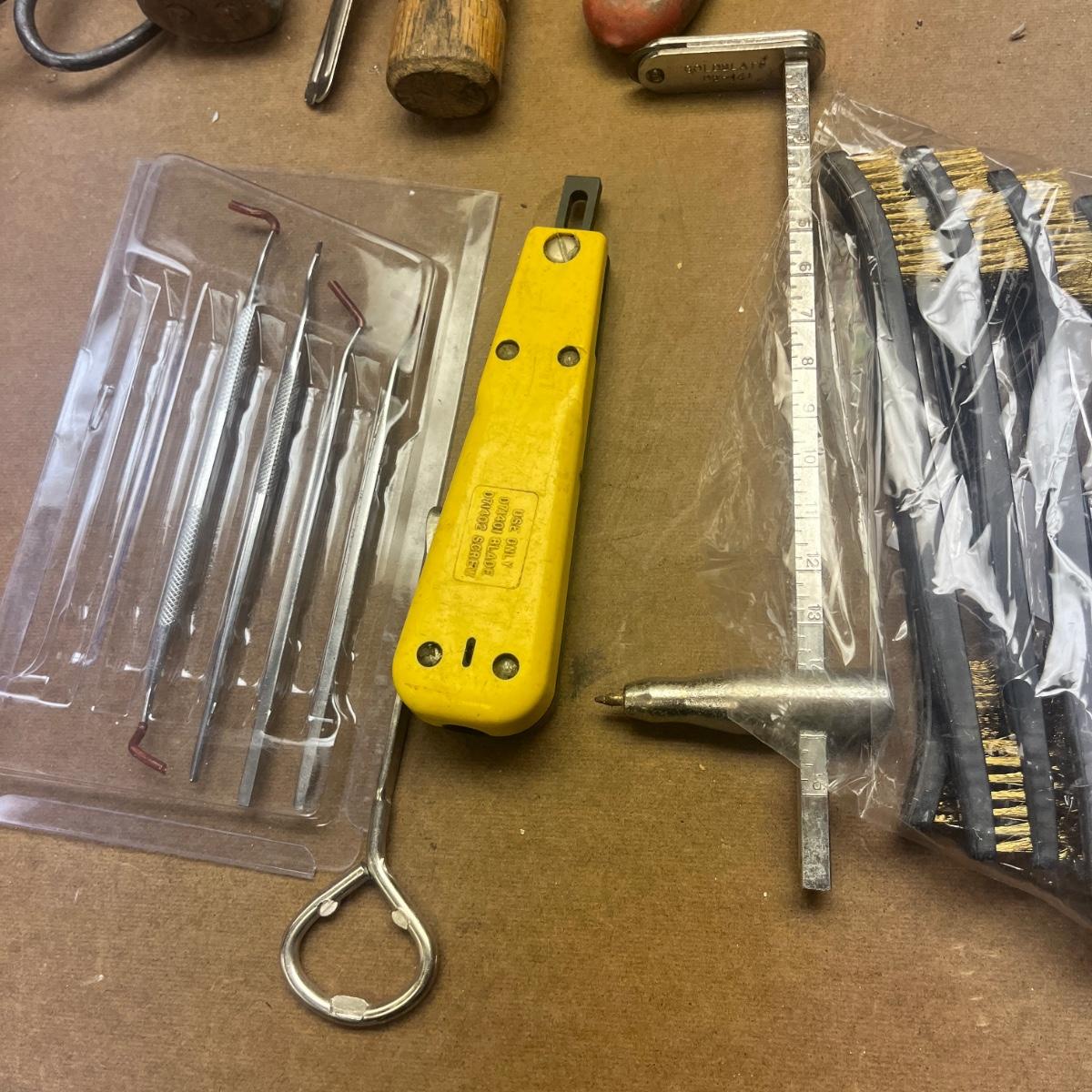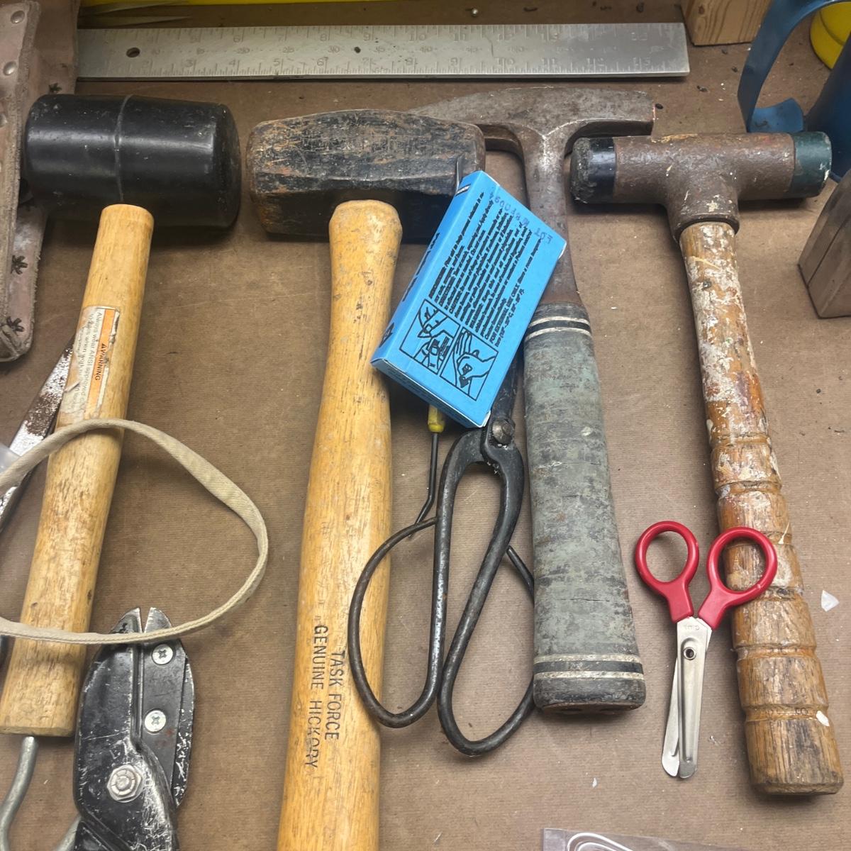 Lot includes 4 levels, mini sledge hammer, rubber hammer, hacksaw, handsaw, coping saw, measuring wheel, heat gun, soldering gun, tape measures, caulking guns, clamps and more. Longest level measures 48” long.