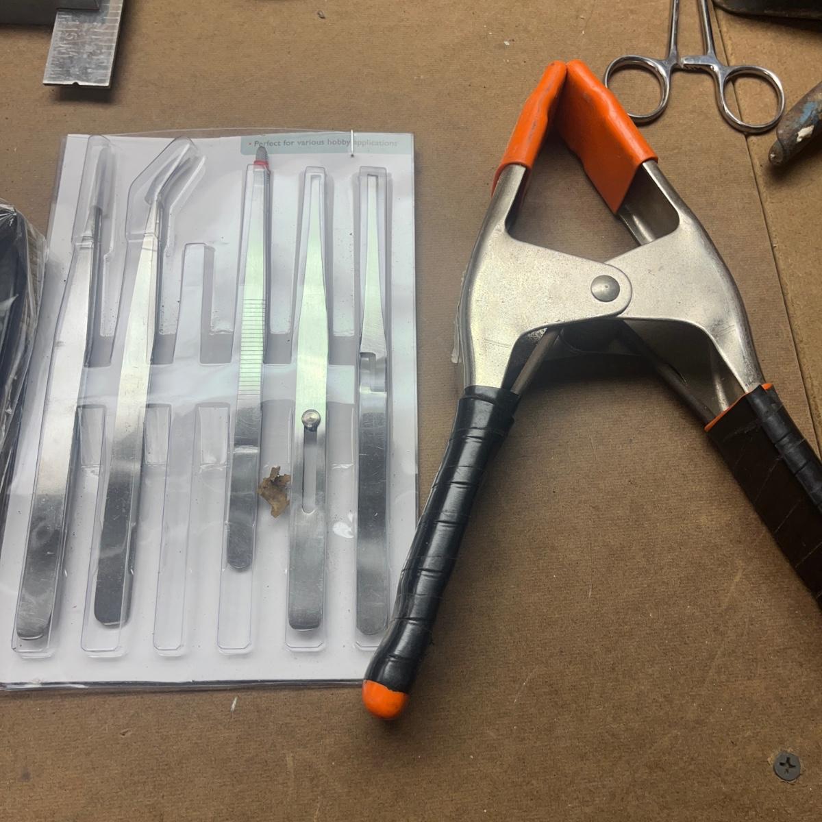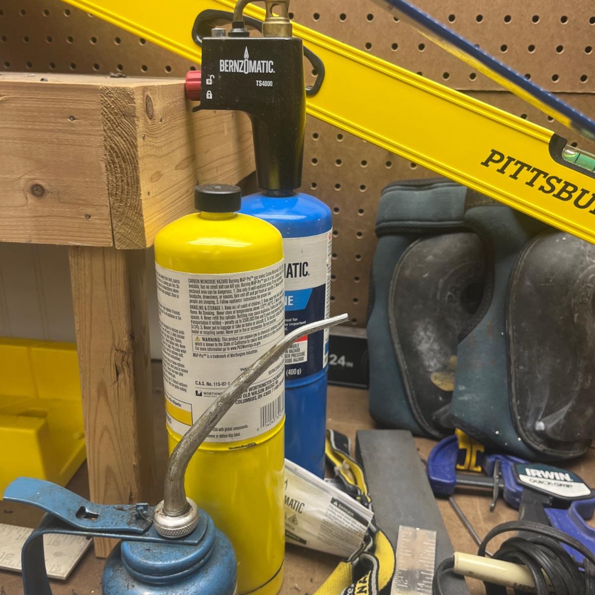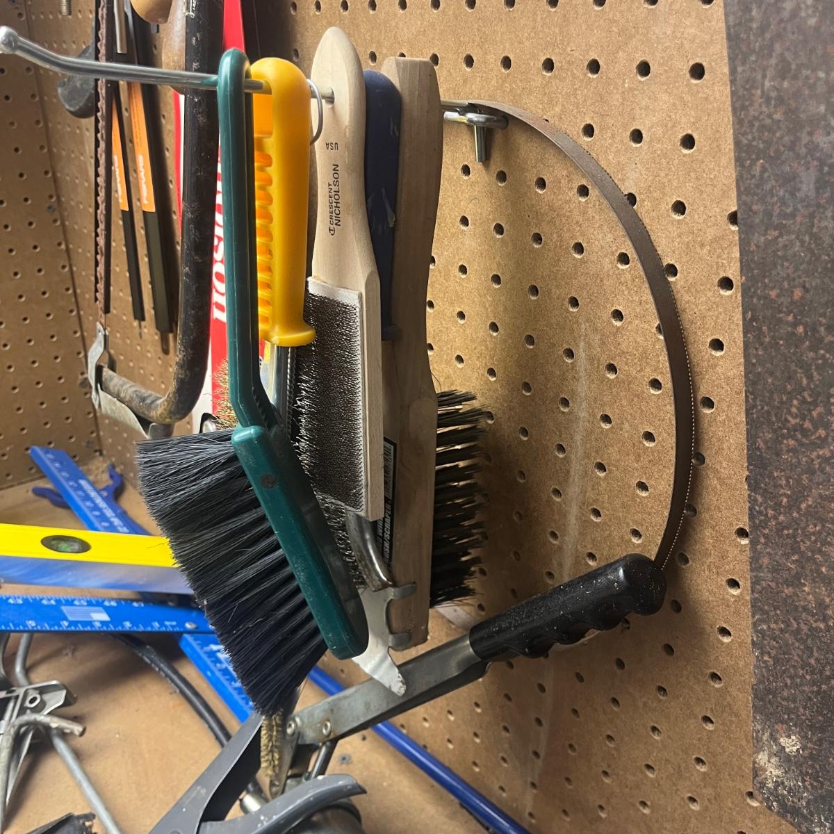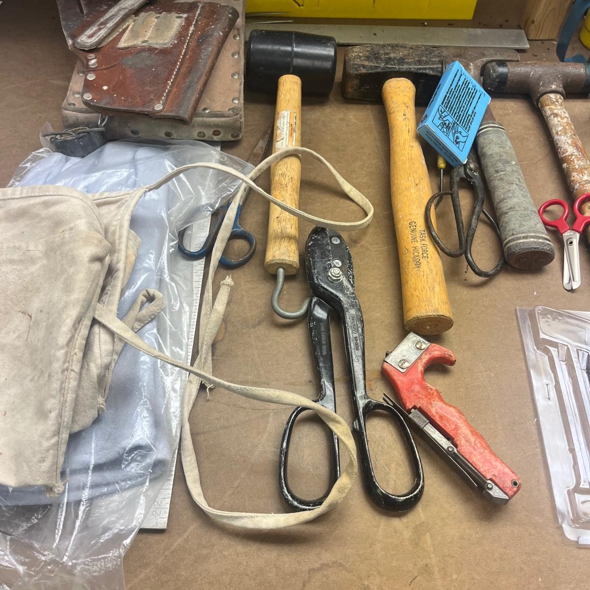 Lot includes 4 levels, mini sledge hammer, rubber hammer, hacksaw, handsaw, coping saw, measuring wheel, heat gun, soldering gun, tape measures, caulking guns, clamps and more. Longest level measures 48” long.