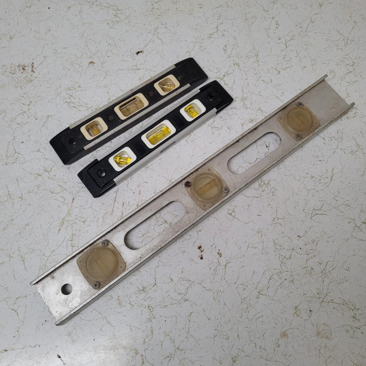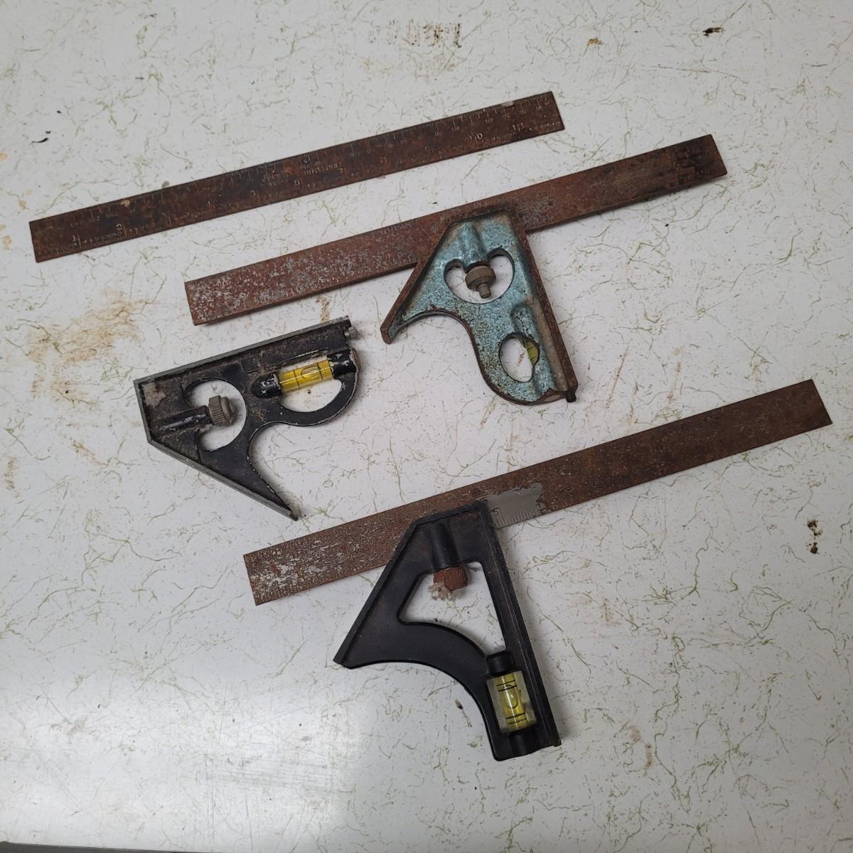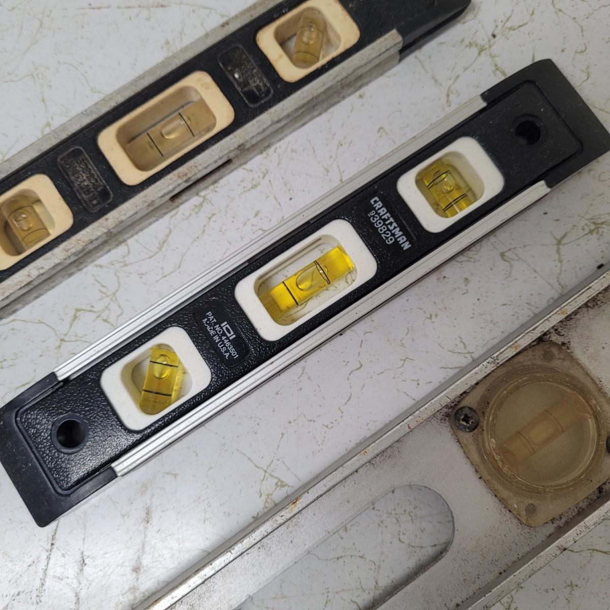This lot includes various levels, squares, and rulers. Two of the levels and one of the squares are Craftsman brand, while the rest are unmarked. There are five levels, four squares, and two rulers. Some of the items are newer while others are possibly vintage.