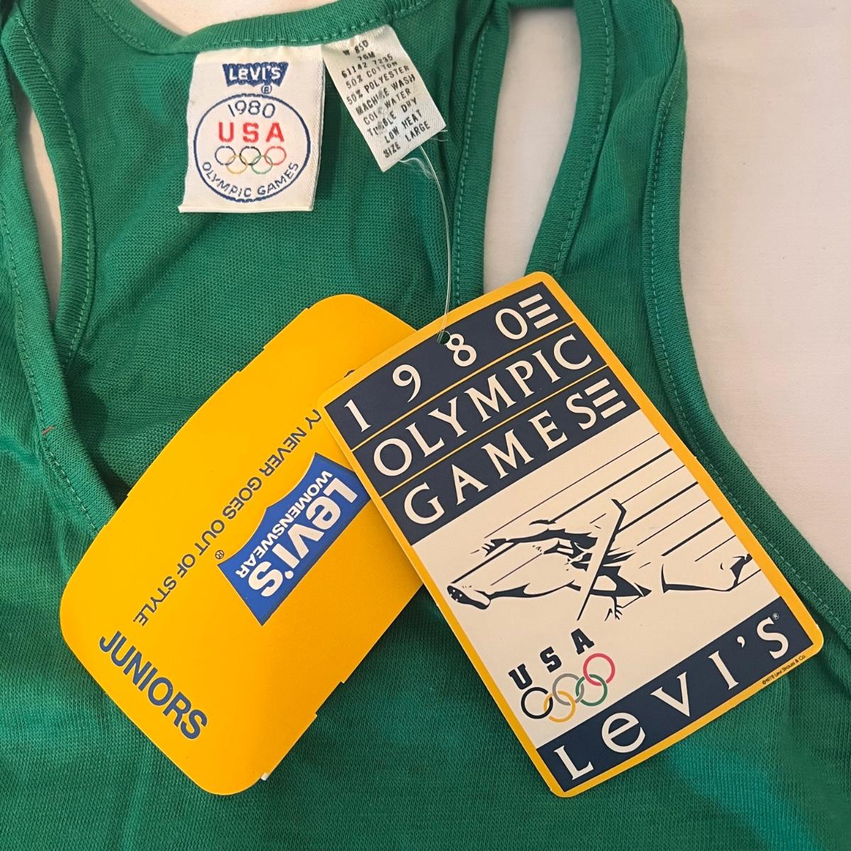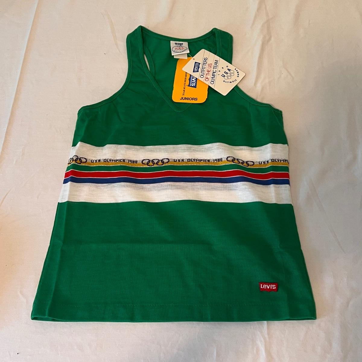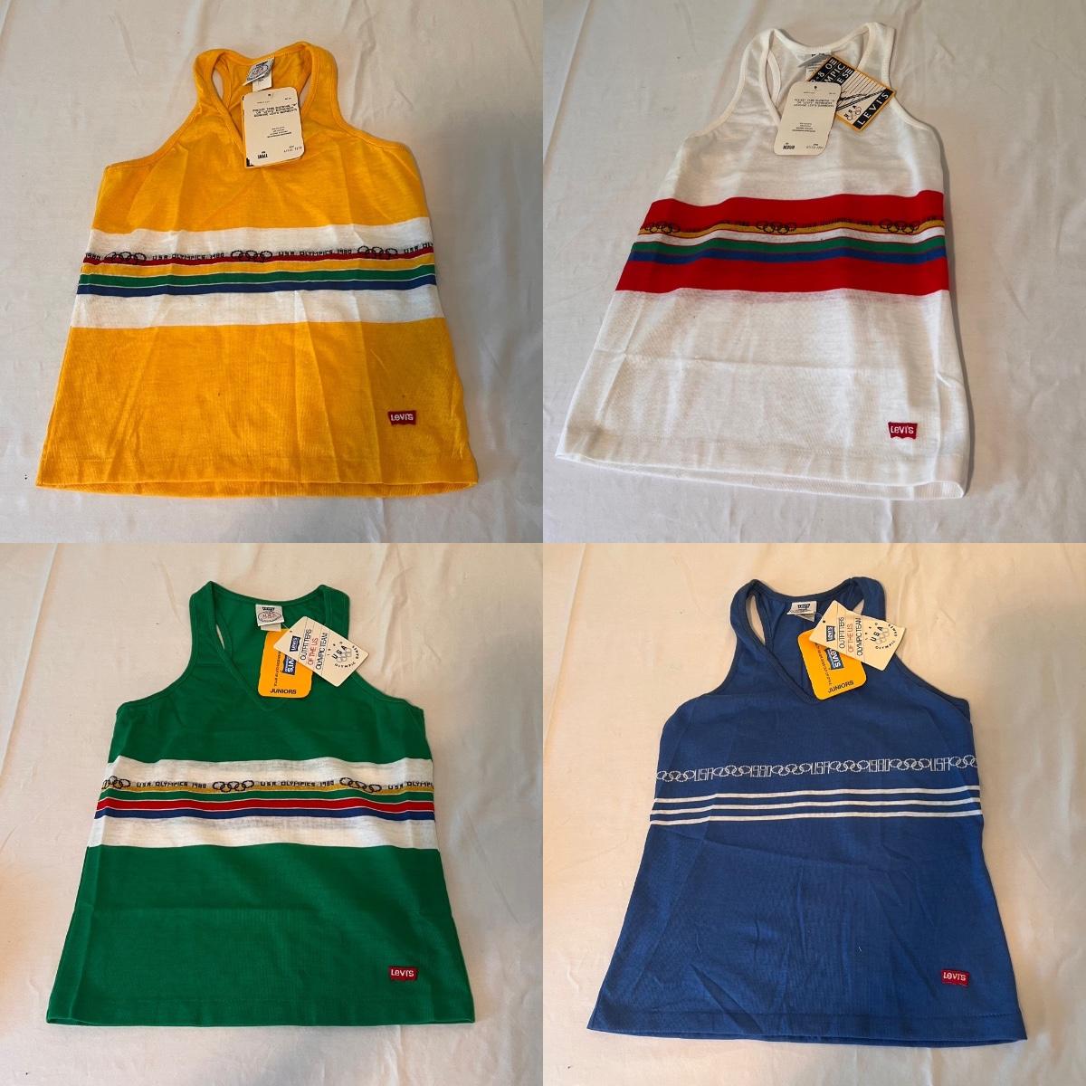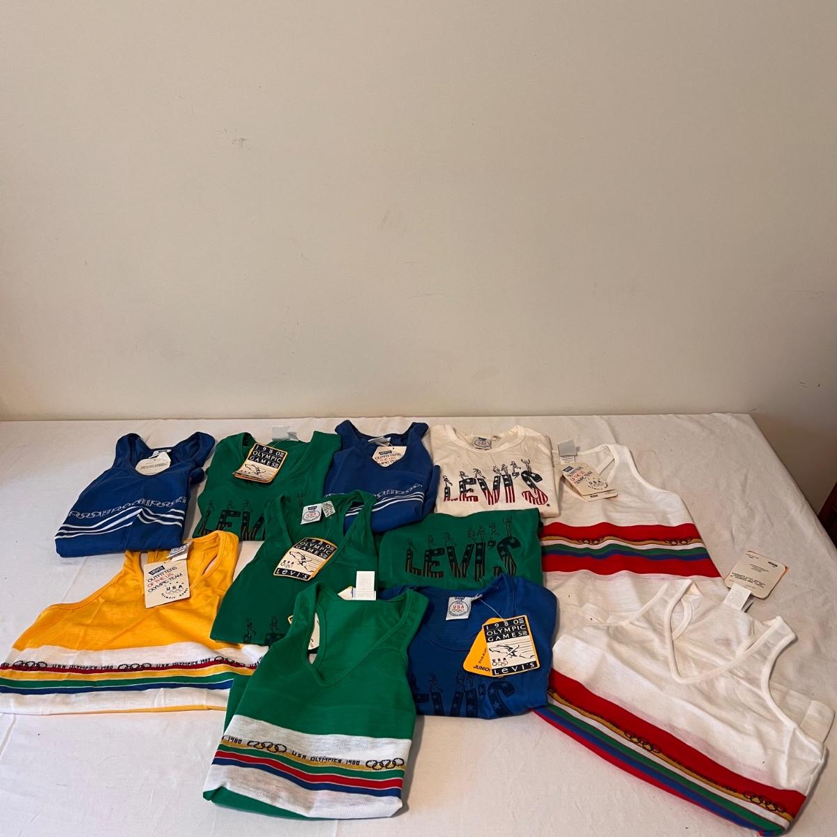 This lot includes ten pieces of Levi’s USA Olympic clothing from the 1980’s in junior sizes. There are tank tops and cropped shirts. They all appear to be unworn and several have their purchase tags attached. Sizes range from Junior Small to Junior Large. Shipping available.