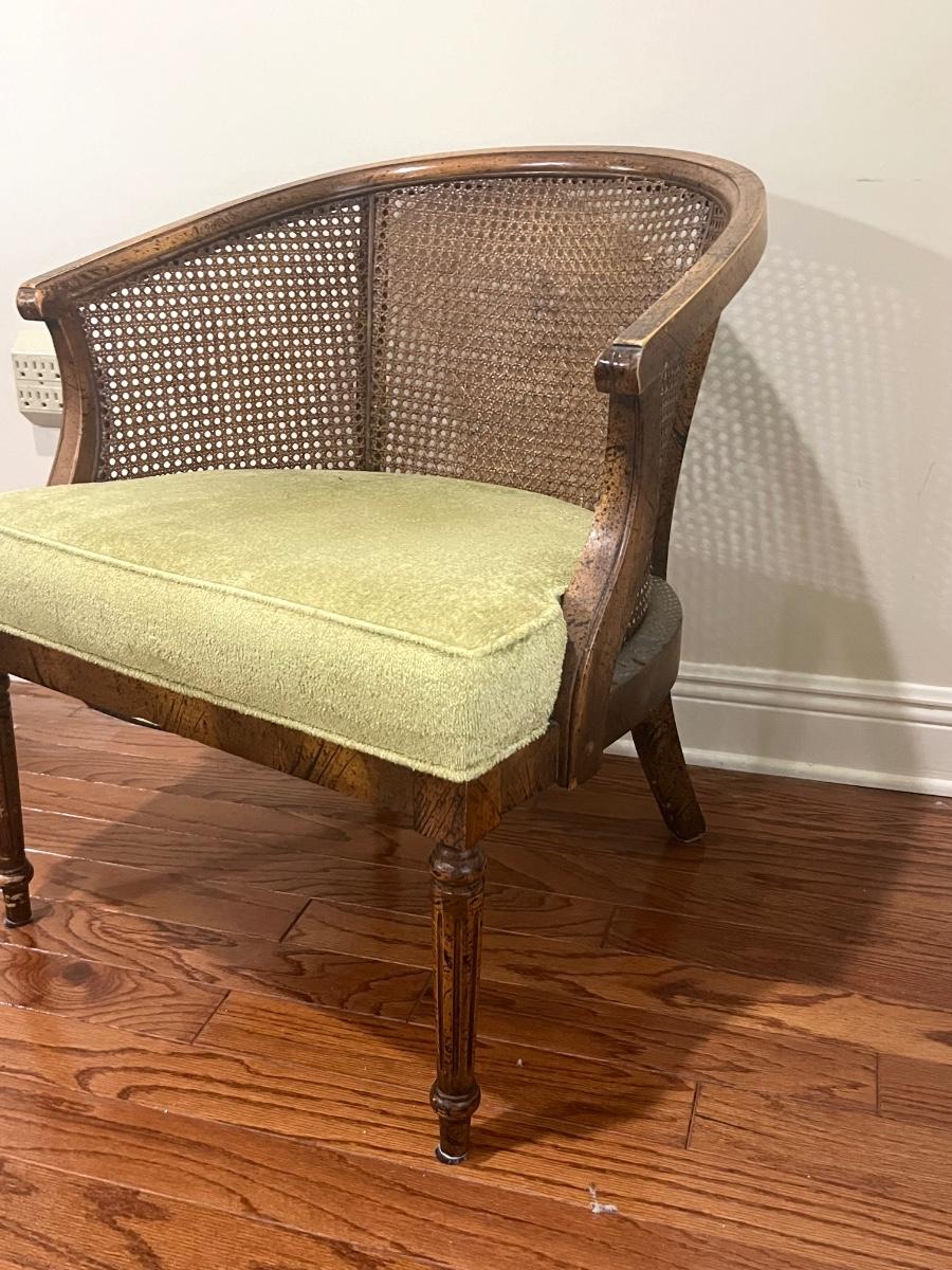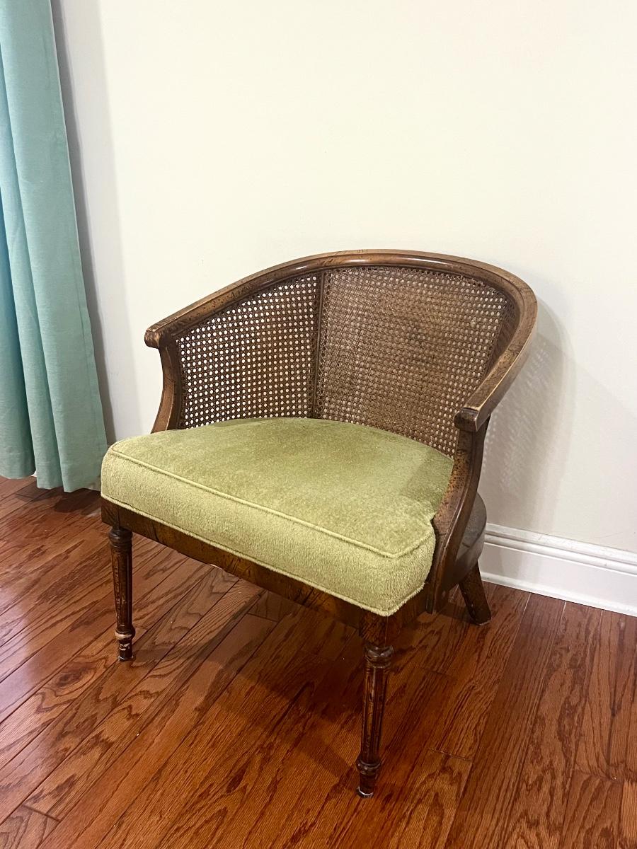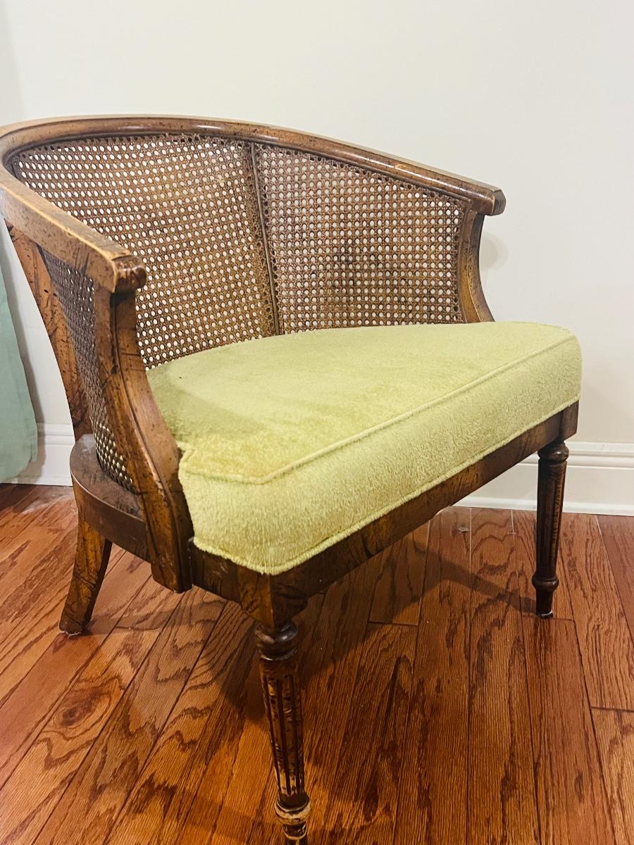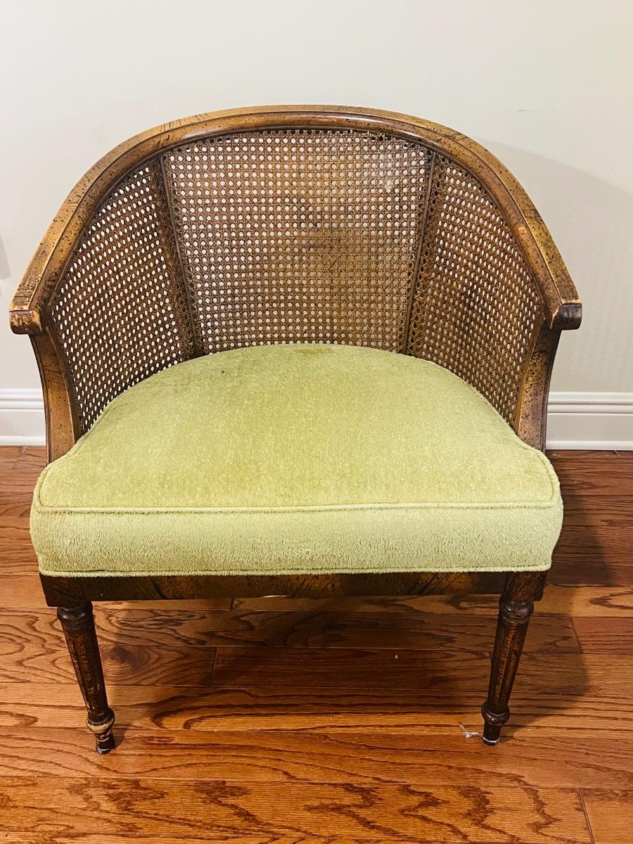 LEVITZ Furniture Cane Chair with green cushion Color name is Celery.. Measures 29 inches tall, 26 inches wide and 22 inches deep. Floor to seat measures at 17 1/2 inches. See circled spot on picture for a small imperfection noted.