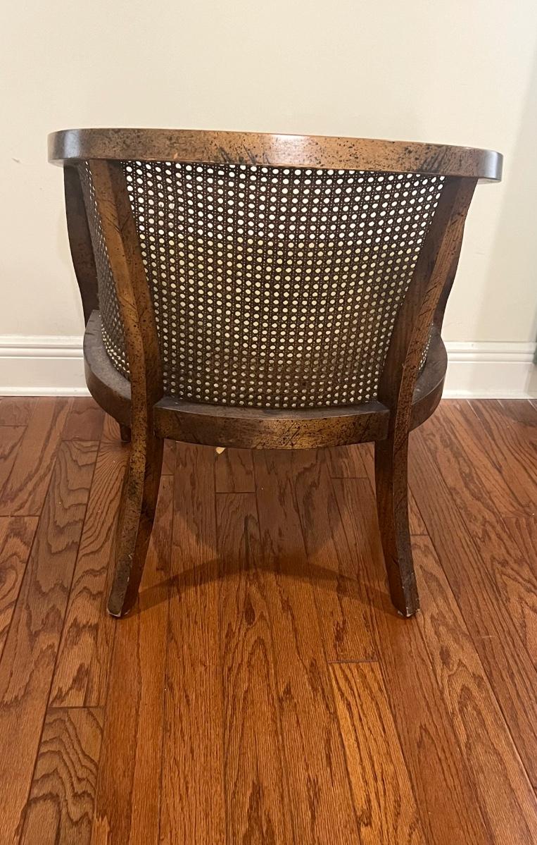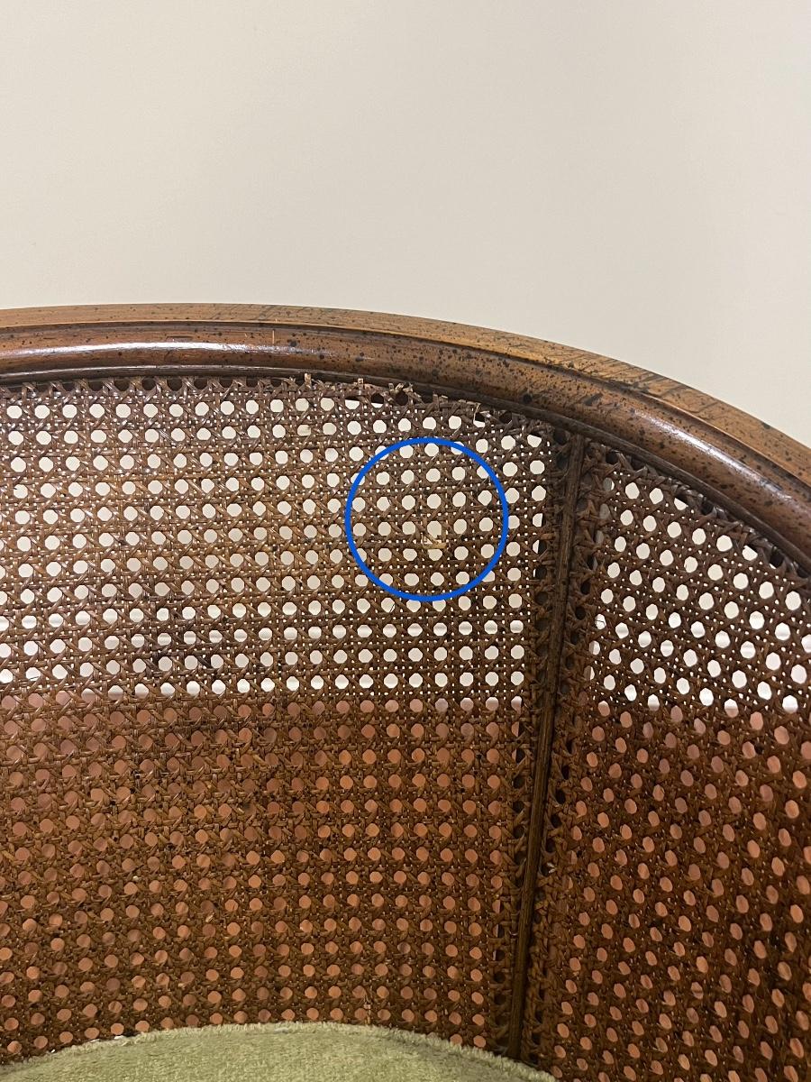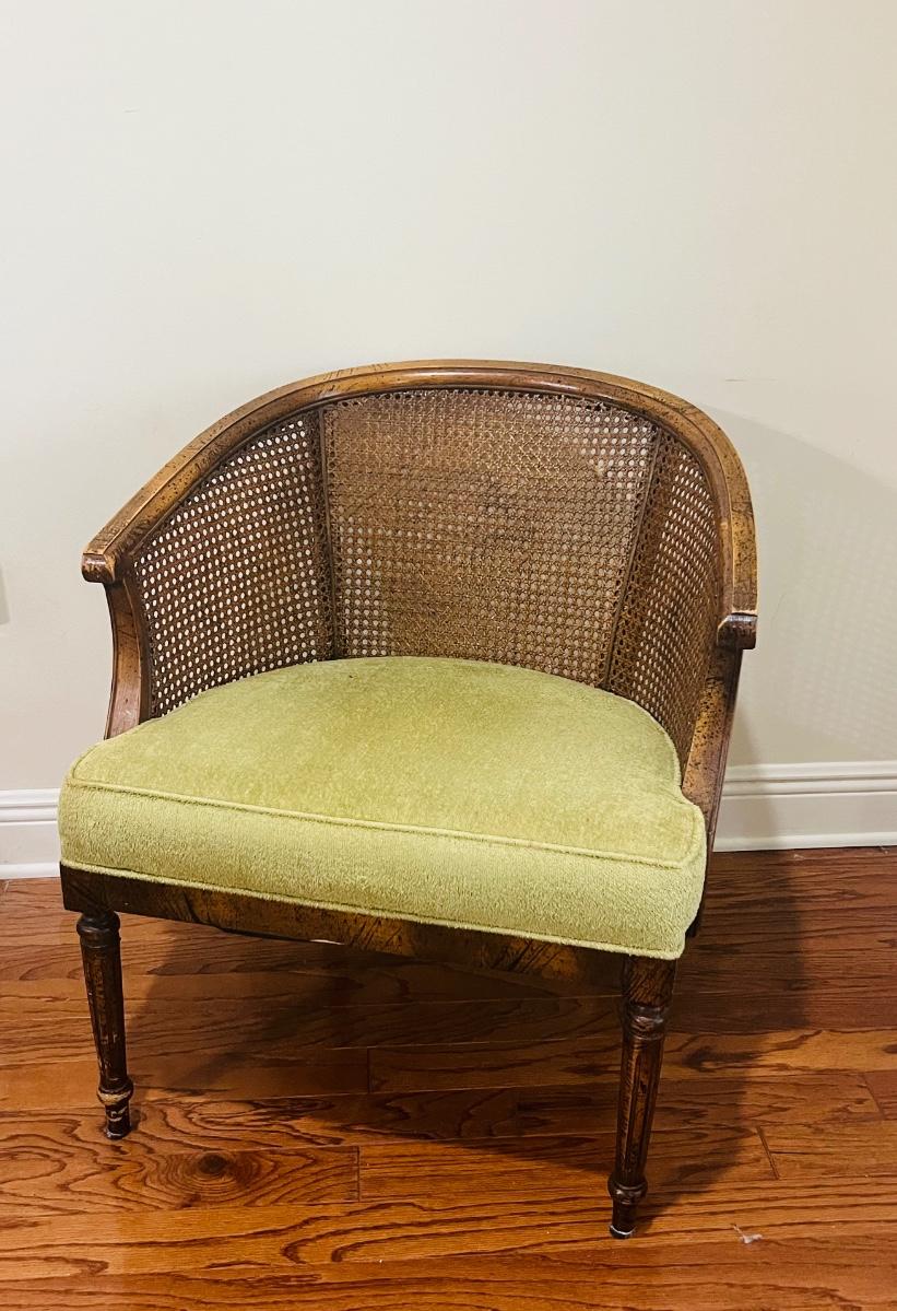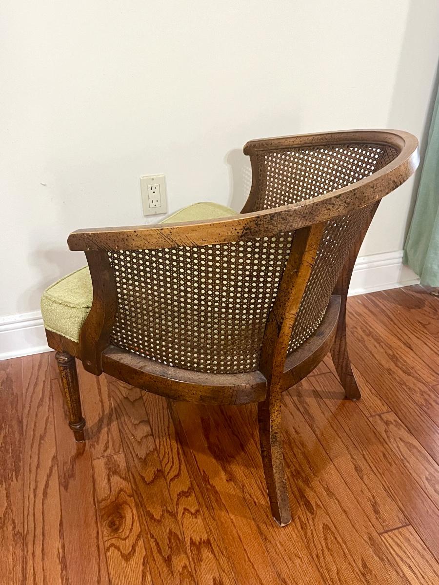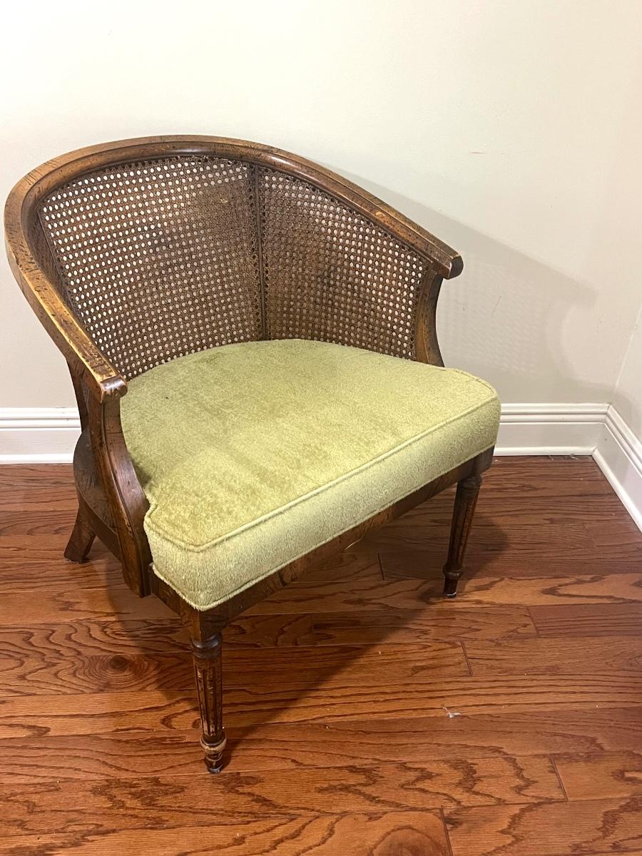 LEVITZ Furniture Cane Chair with green cushion Color name is Celery.. Measures 29 inches tall, 26 inches wide and 22 inches deep. Floor to seat measures at 17 1/2 inches. See circled spot on picture for a small imperfection noted.