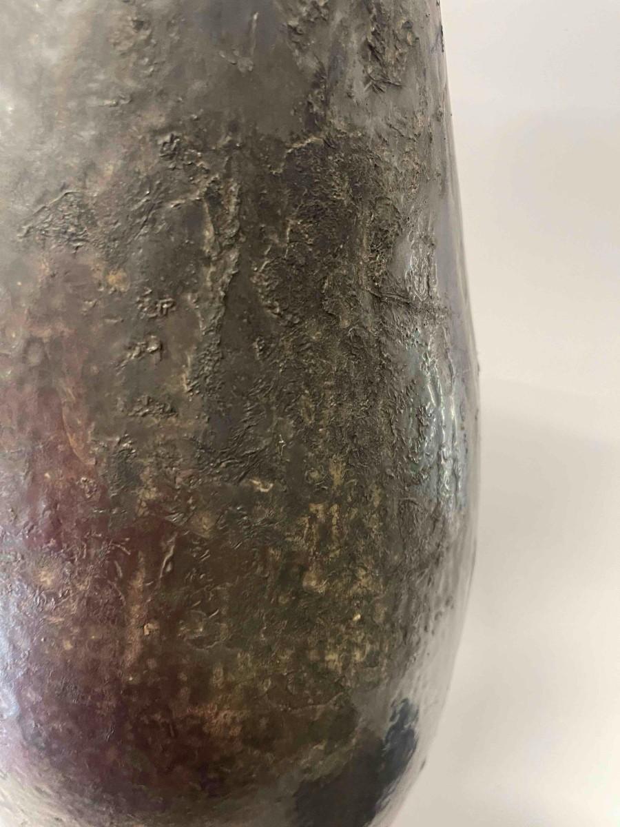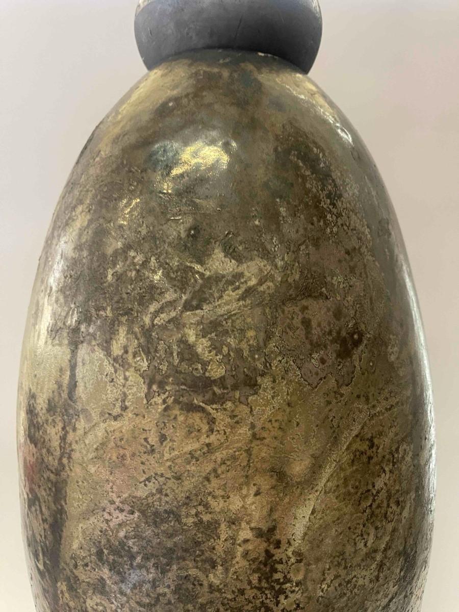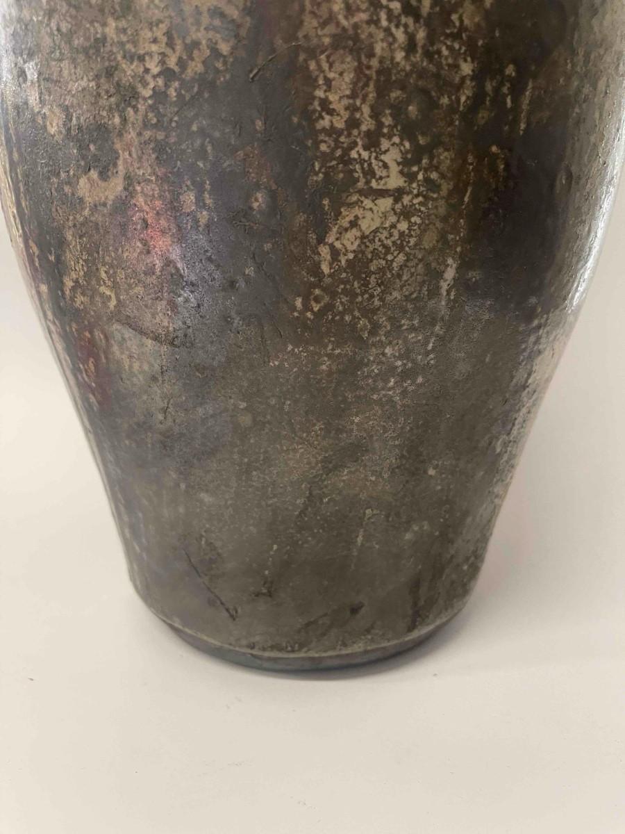 <p>Lew Ayres Raku Pottery Vessel With Lid #2. We have three pieces in total up for auction in varying sizes. All in very good condition. This one is the tallest at 24” to the top of the lid. Shows minor wear consistent with age and use. signed LA in the bottom, please not signature is faded but present. </p>