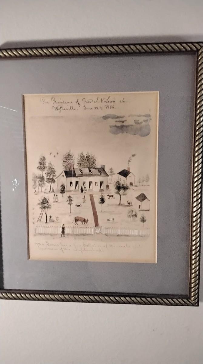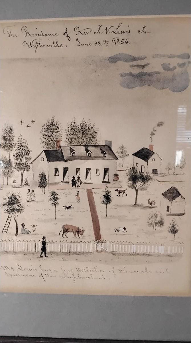 This is a page from Lewis Miller's sketchbook dated June 28th 1856. A depiction of "The Residence of Rev. J.N. Lewis of Wytheville, June 28, 1856" Lewis Miller further notes that "Mr. Lewis has a fine collection of minerals with specimens of this neighborhood." Upon researching Reverend James Nelson Lewis is found on the 1860 census of Wytheville, VA, married, with several children. He was born in PA about 1809 and died in Florida in 1887 (you can view his headstone on FindAGrave). He married Jane McClanahan in Roanoke, VA in 1847. He was a minister of the Gospel. The area he lived in is coal-mining country and there are many geological specimens to be had in the area.