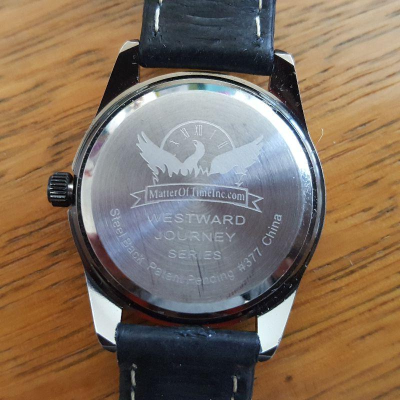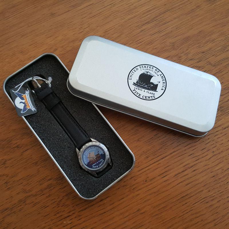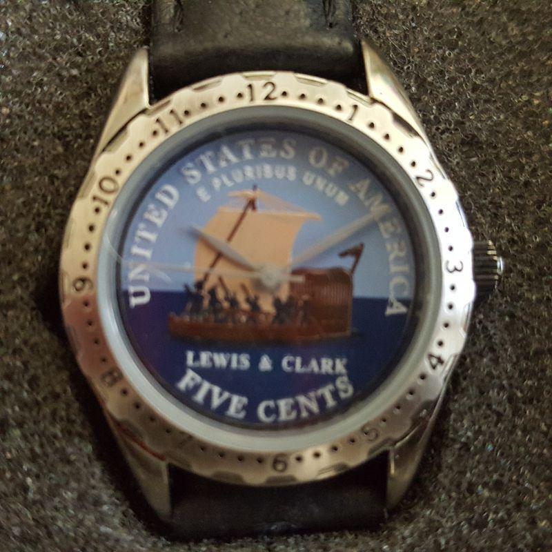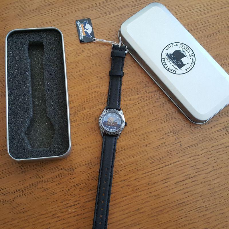 This auction lot is for a new, unused Lewis & Clark Westward Journey Wrist Watch. The watch face is a recreation of the 5 cent coin designed and produced by the US Mint to commemorate the 2004-2005 celebration around the travels of discovery by Lewis & Clark. Nice collectible for history buffs or watch collectors.