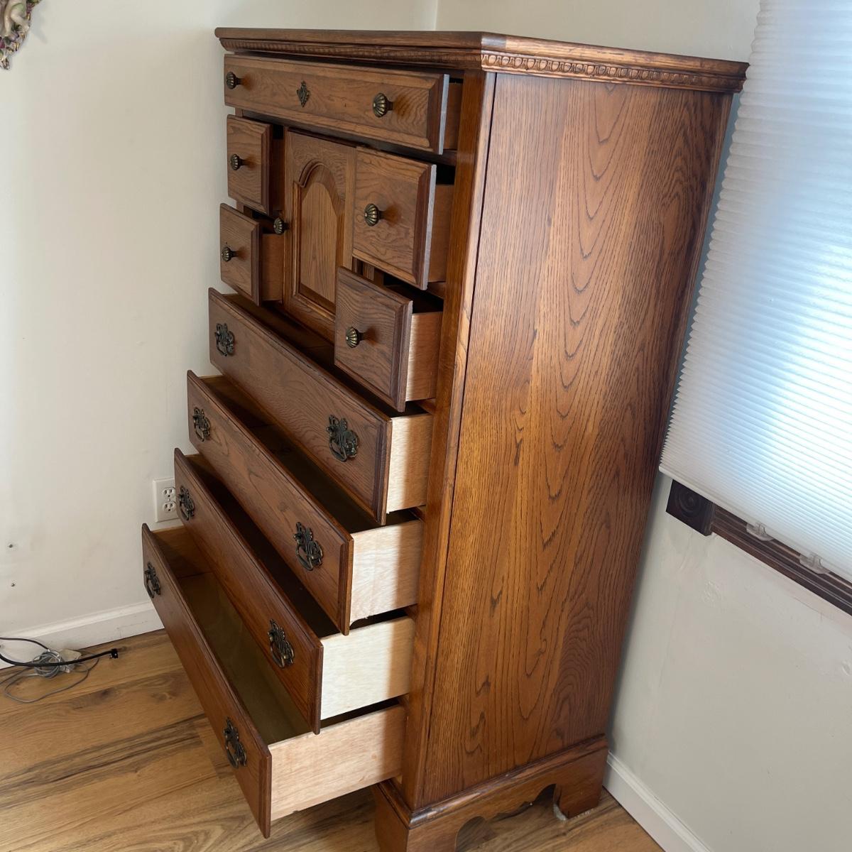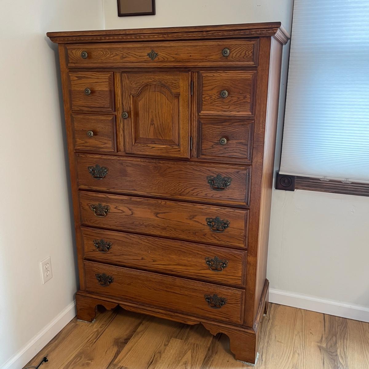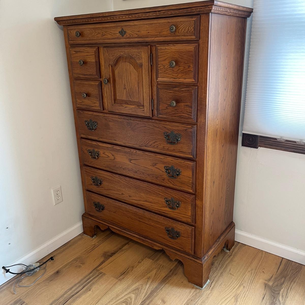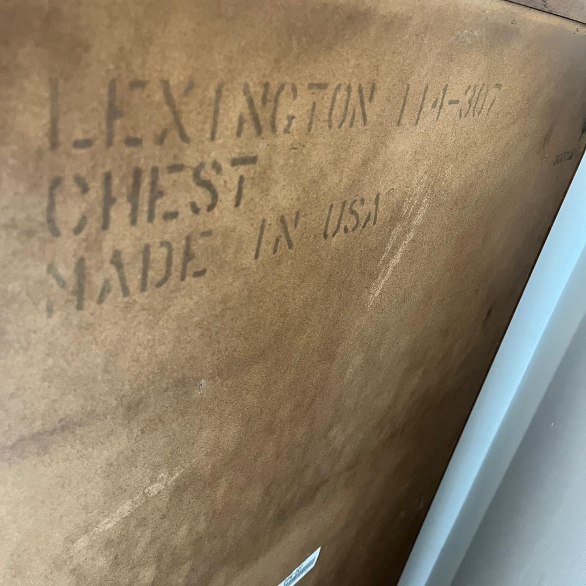 This Lexington chest of drawers has nine drawers and one cabinet. Chest measures 19” x 38” x 56”H. More matching bedroom suite items are in other lots in this sale.