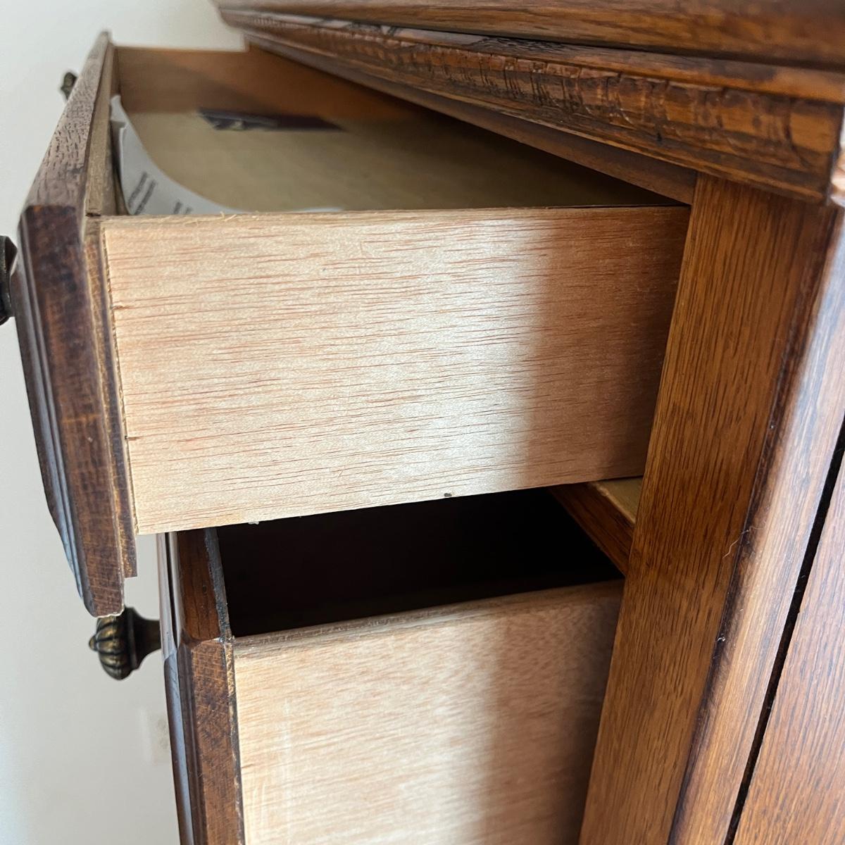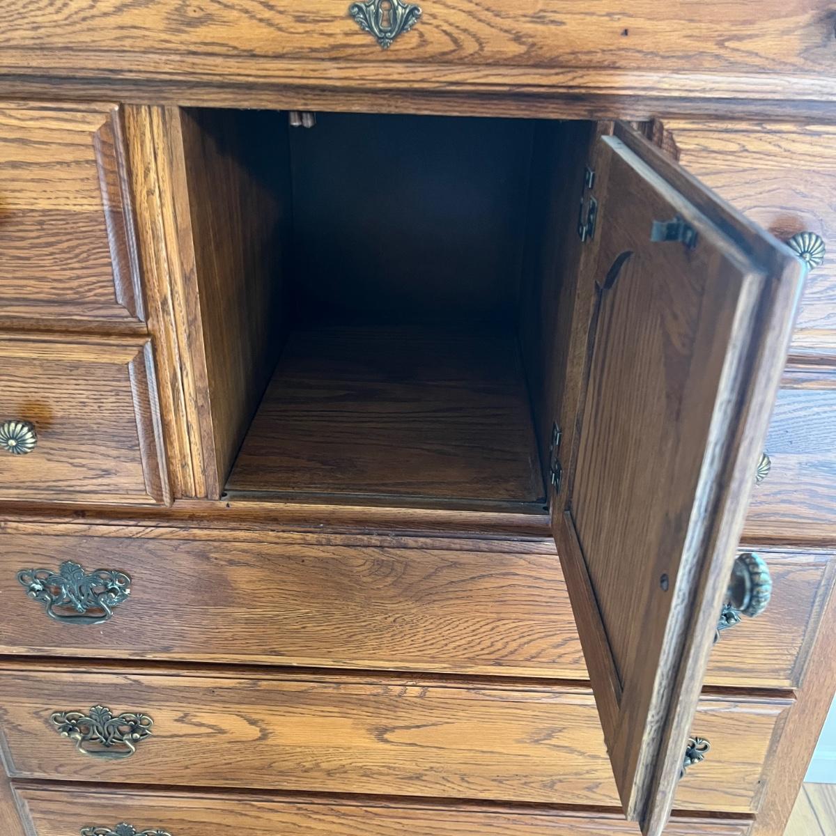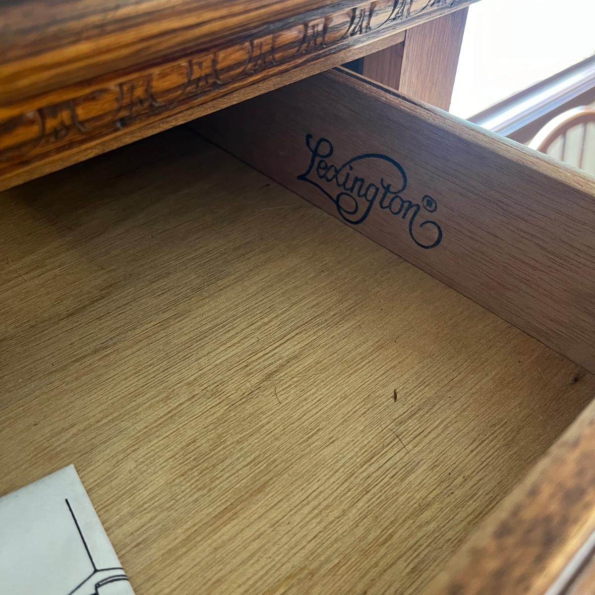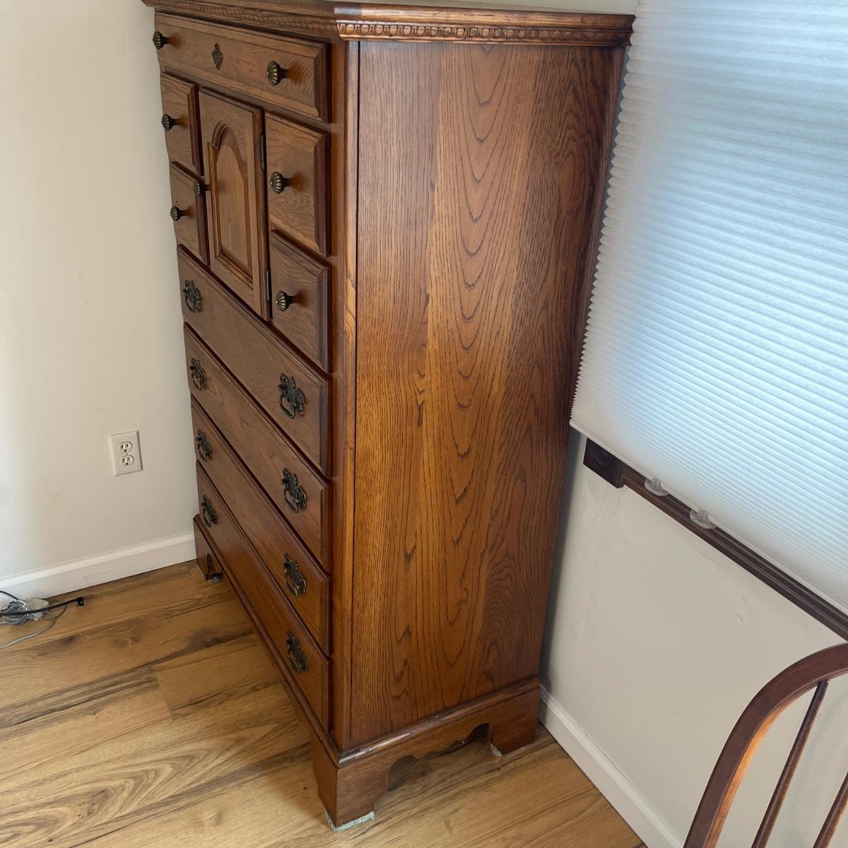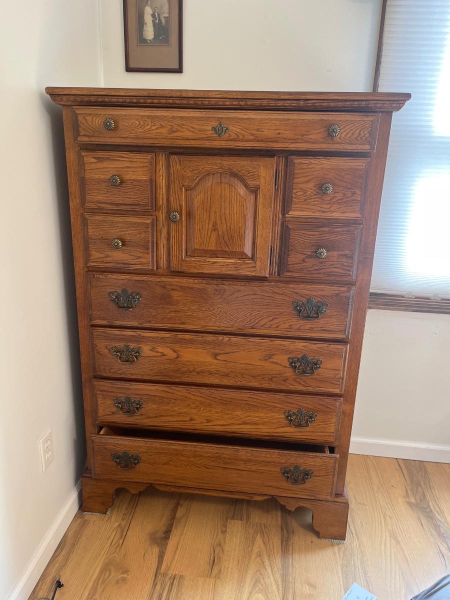 This Lexington chest of drawers has nine drawers and one cabinet. Chest measures 19” x 38” x 56”H. More matching bedroom suite items are in other lots in this sale.