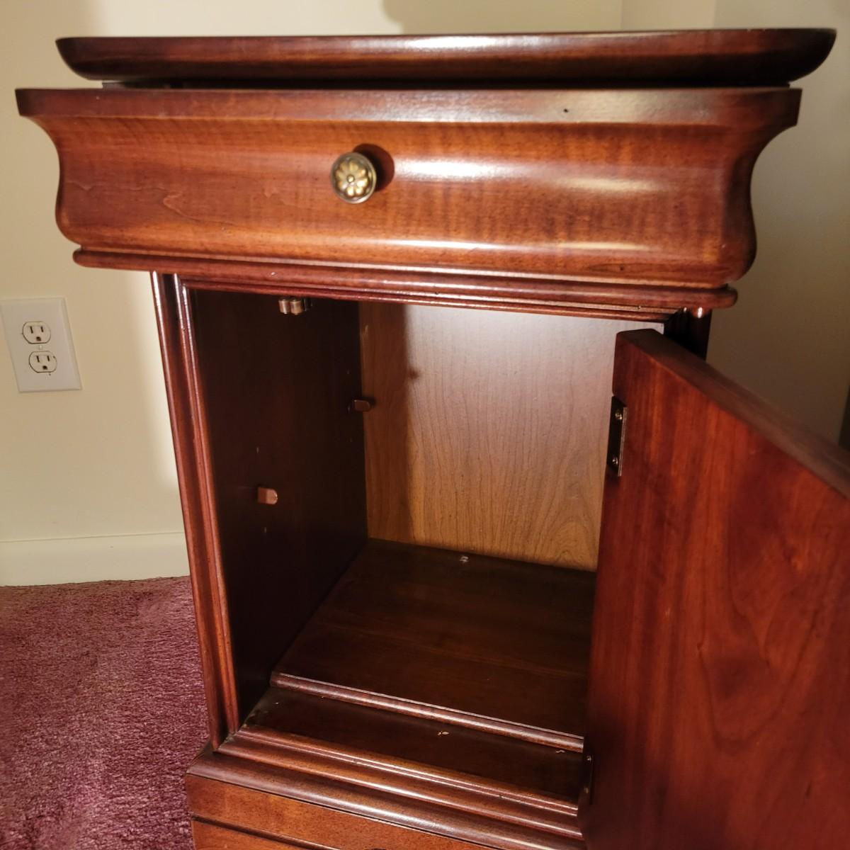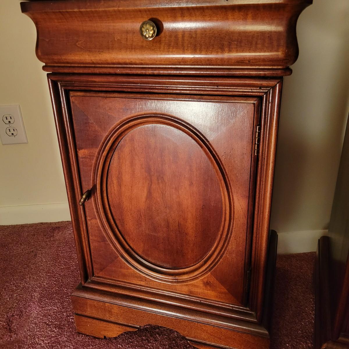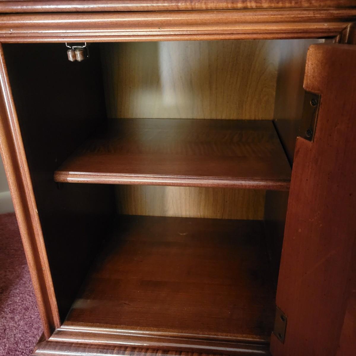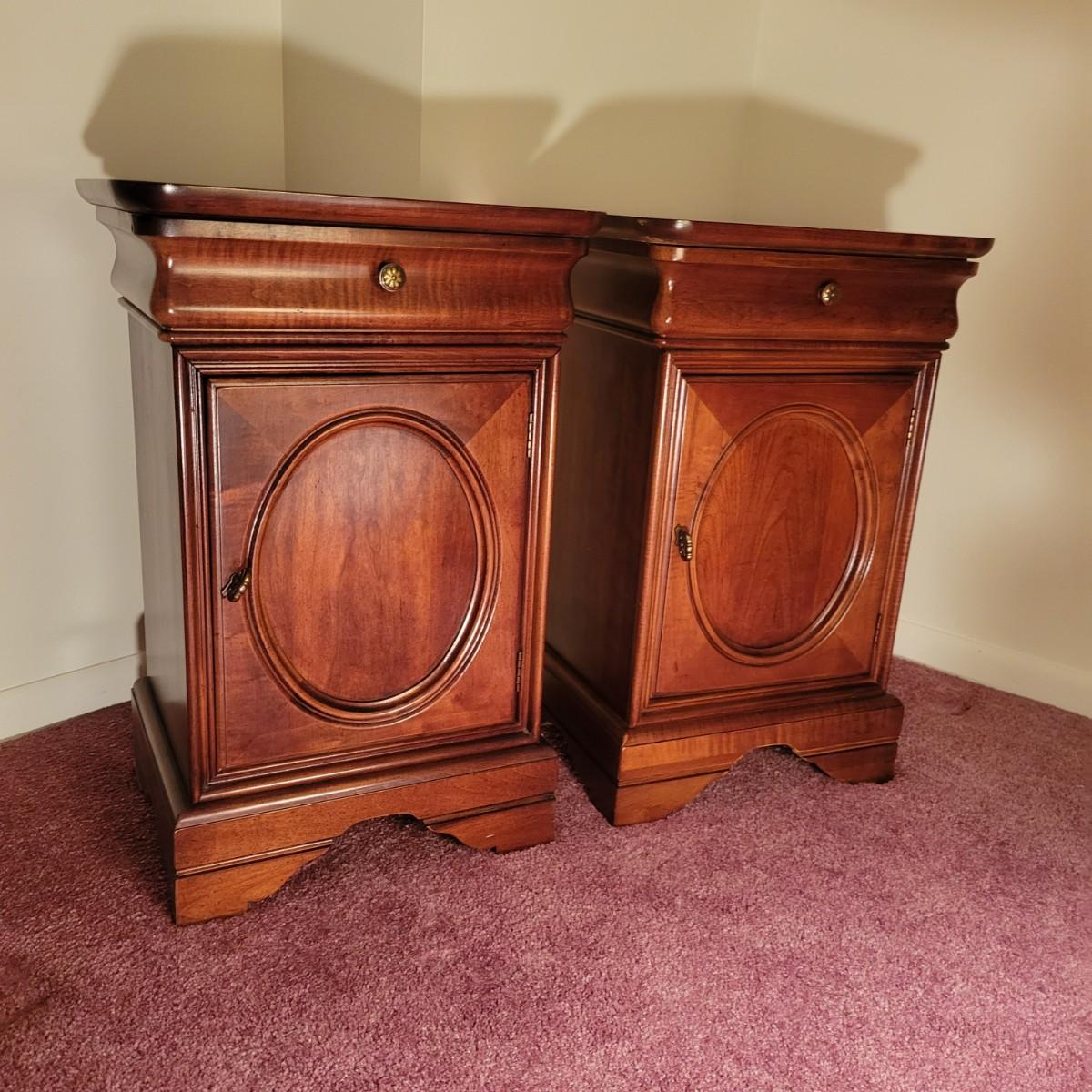 A pair of Lexington bed side tables in good condition with some minor blemishes. While not stamped, this piece matches the Lexington bedroom set in this auction. It features a drawer and cabinet with one adjustable shelf. These are solid wood with a rich brown stain and brass hardware. Measures approximately 18" x 14" x 29". Local pickup only