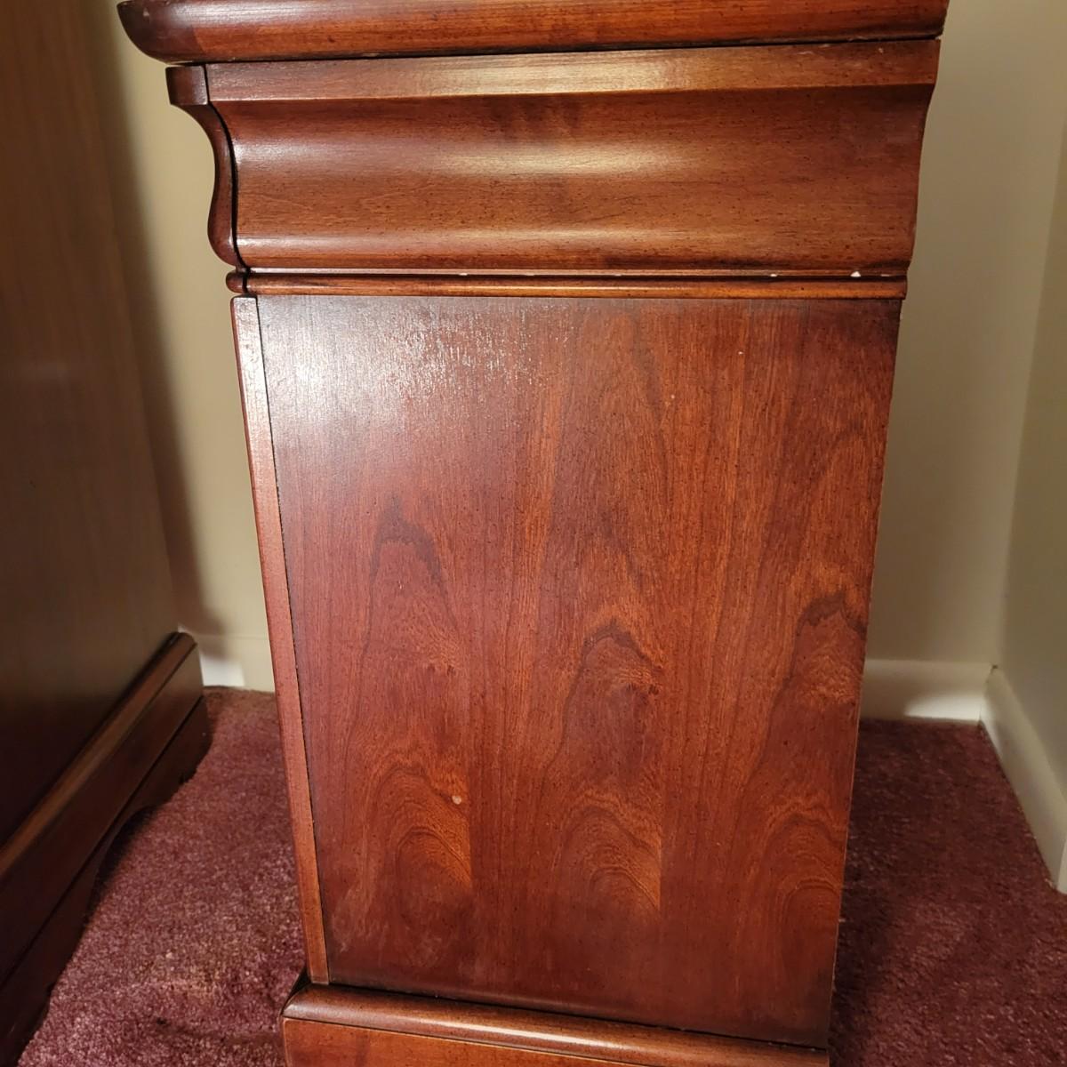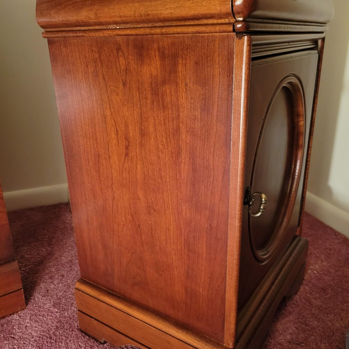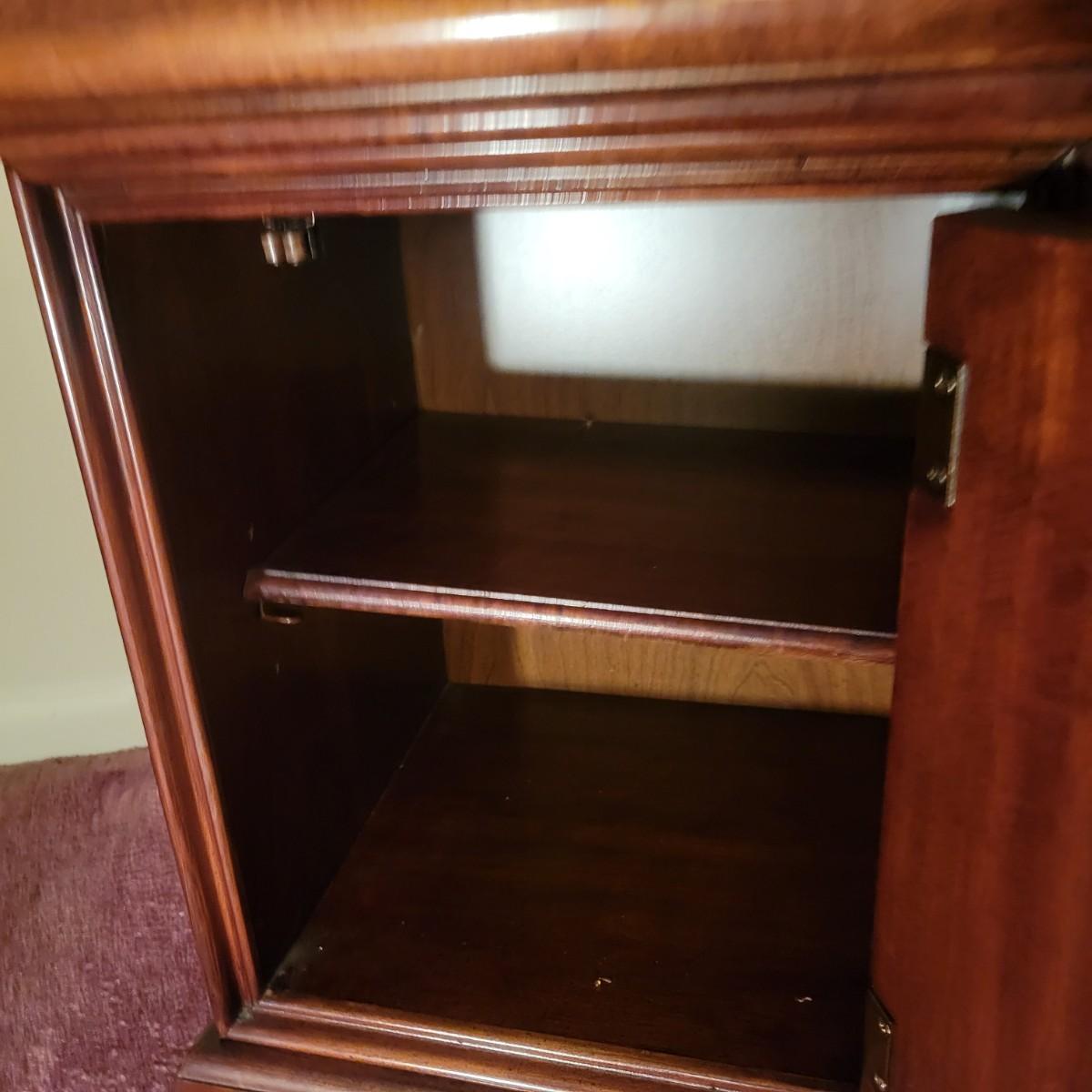 A pair of Lexington bed side tables in good condition with some minor blemishes. While not stamped, this piece matches the Lexington bedroom set in this auction. It features a drawer and cabinet with one adjustable shelf. These are solid wood with a rich brown stain and brass hardware. Measures approximately 18" x 14" x 29". Local pickup only