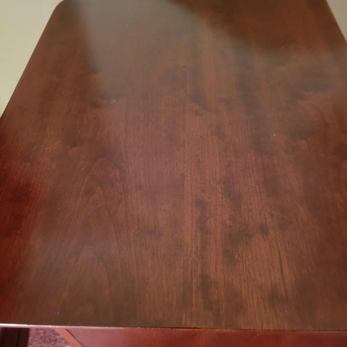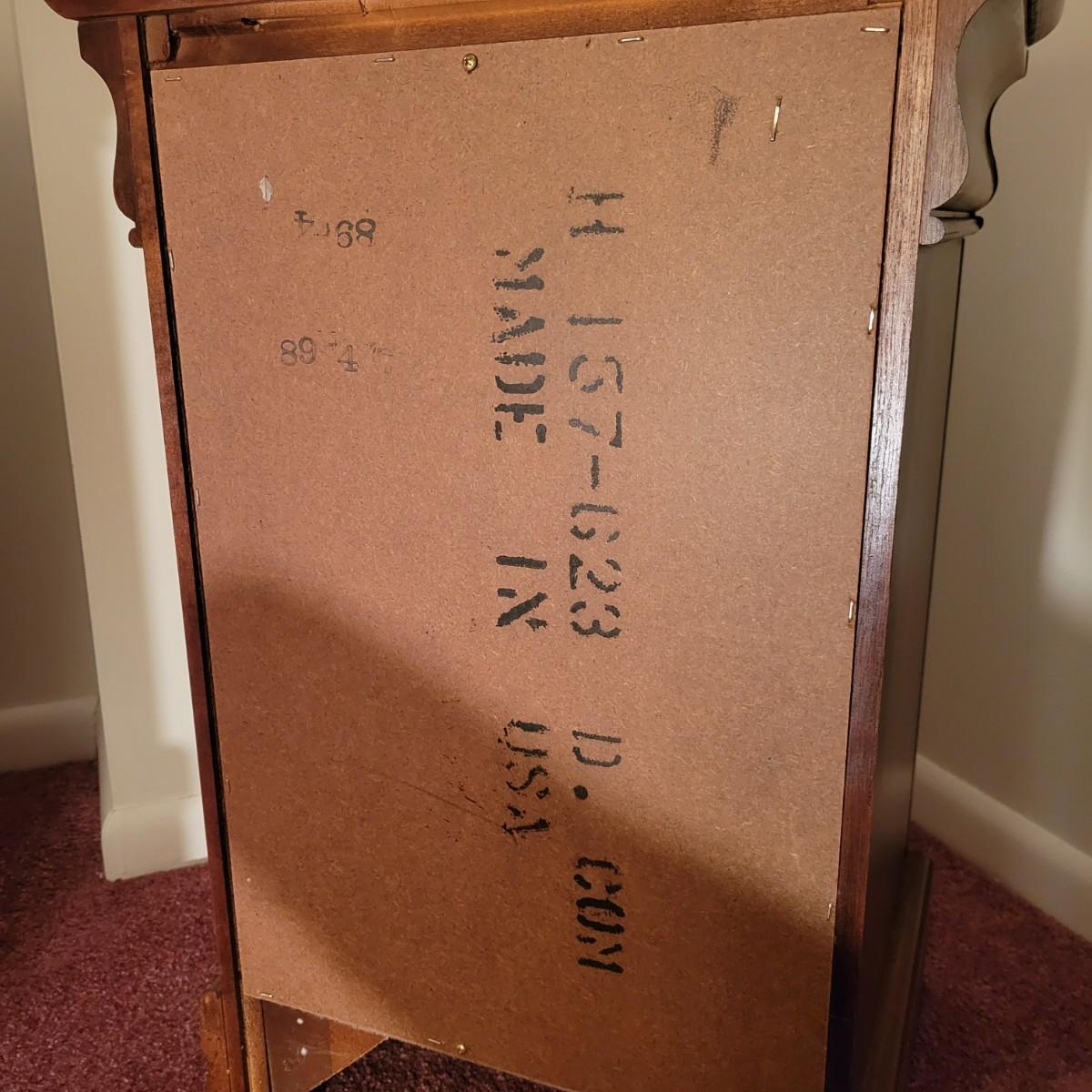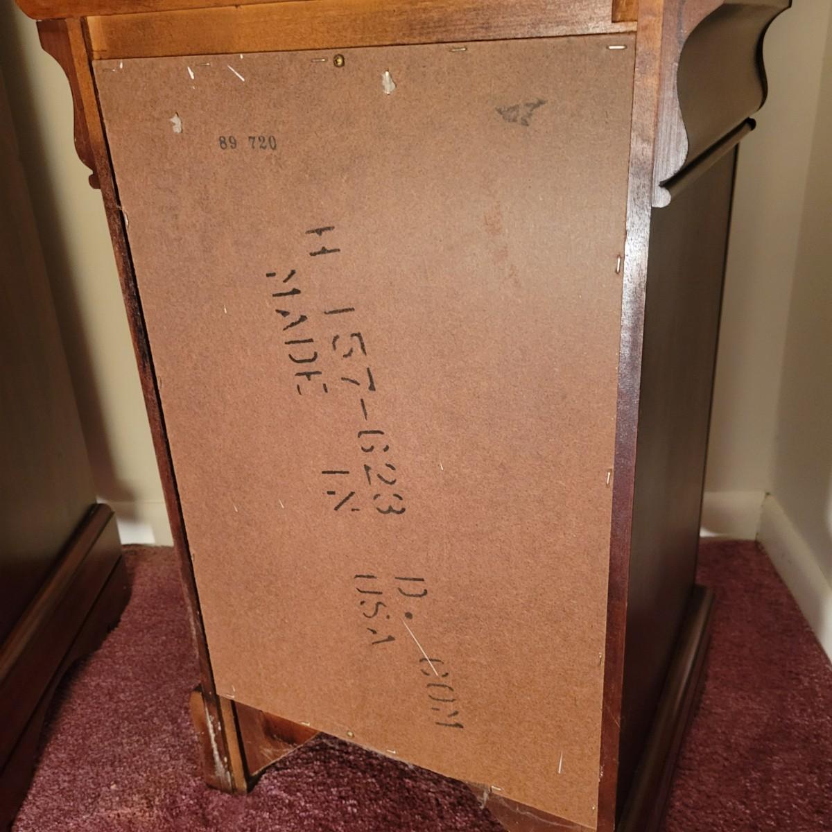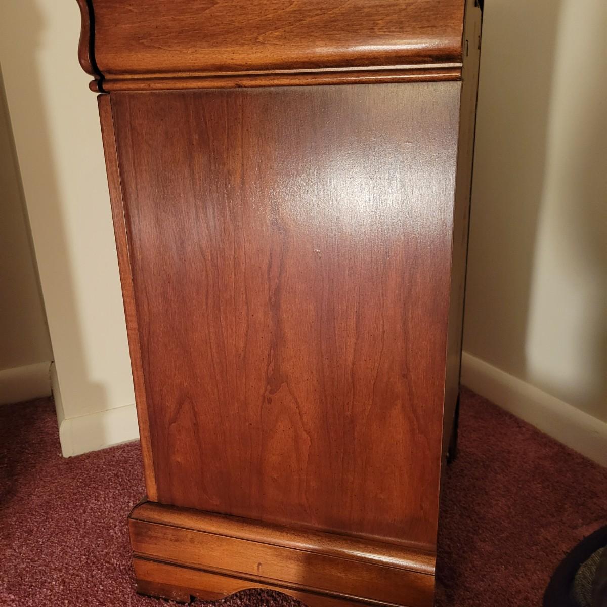 A pair of Lexington bed side tables in good condition with some minor blemishes. While not stamped, this piece matches the Lexington bedroom set in this auction. It features a drawer and cabinet with one adjustable shelf. These are solid wood with a rich brown stain and brass hardware. Measures approximately 18" x 14" x 29". Local pickup only