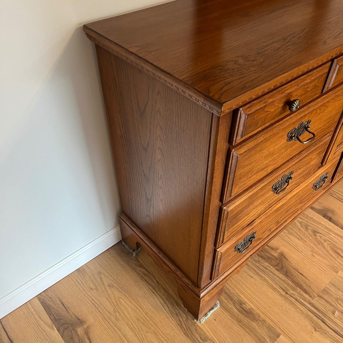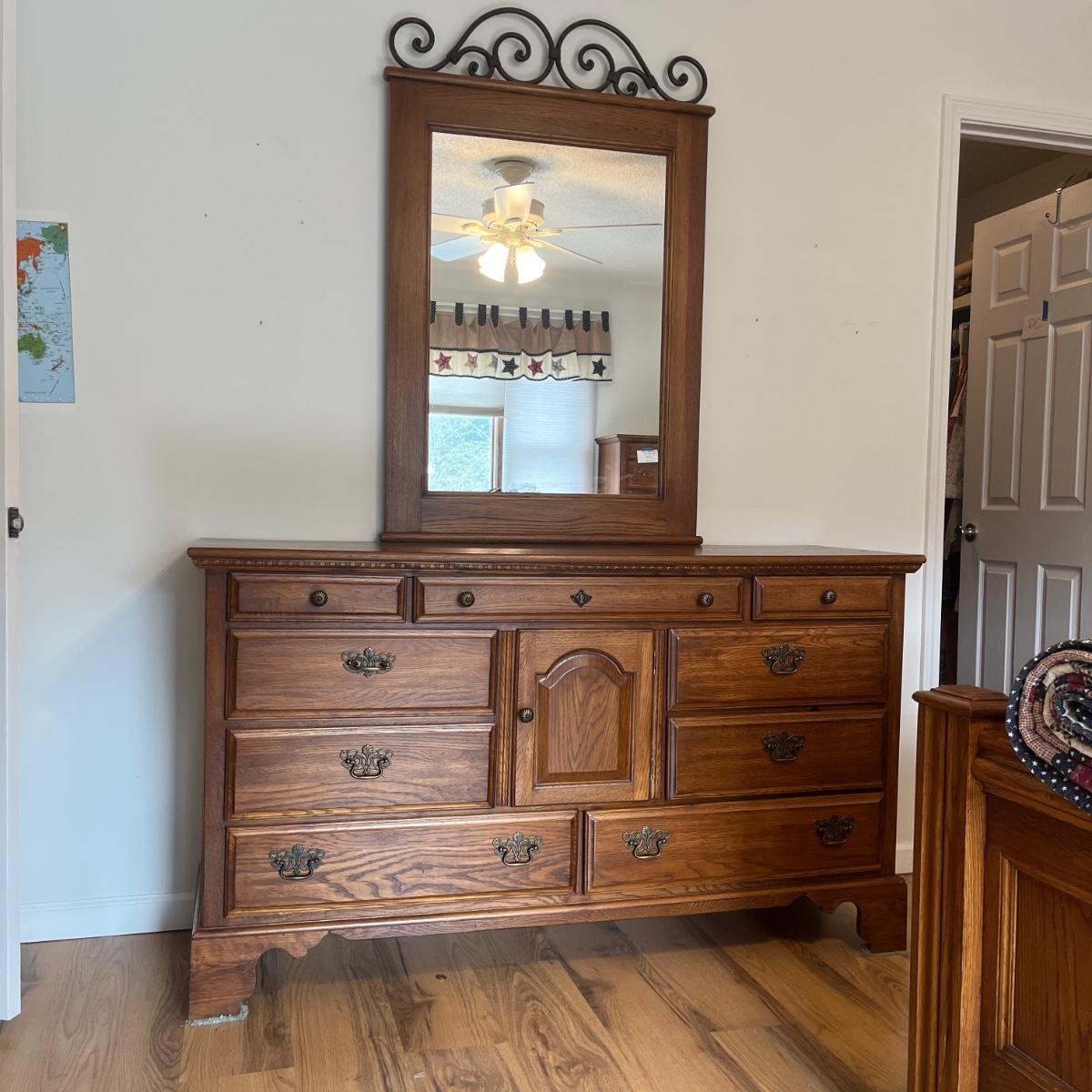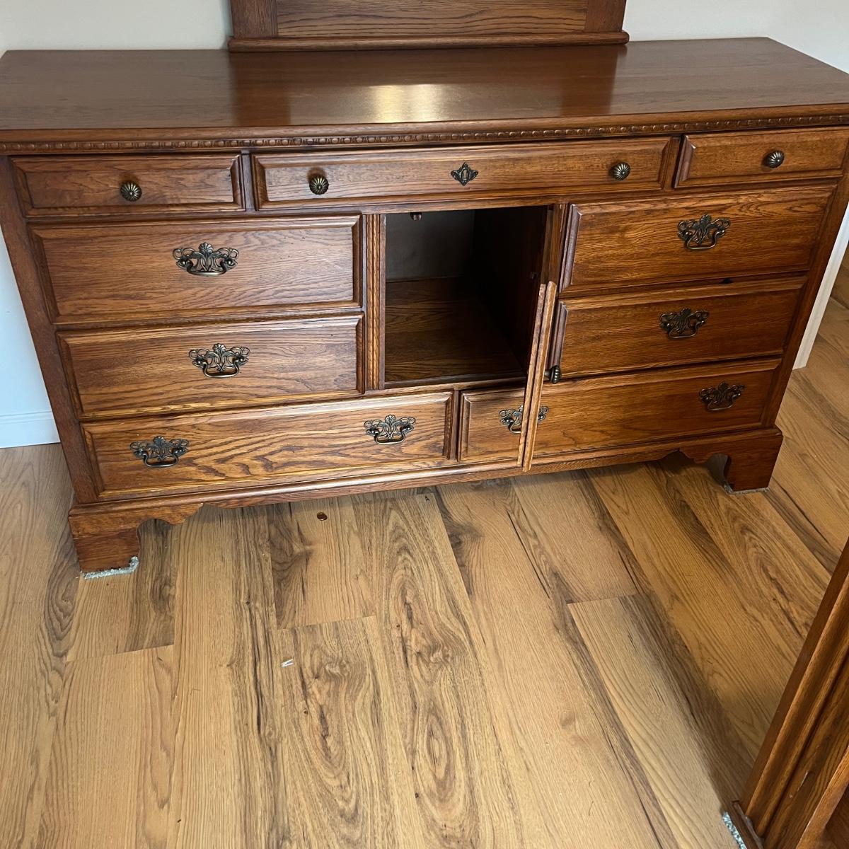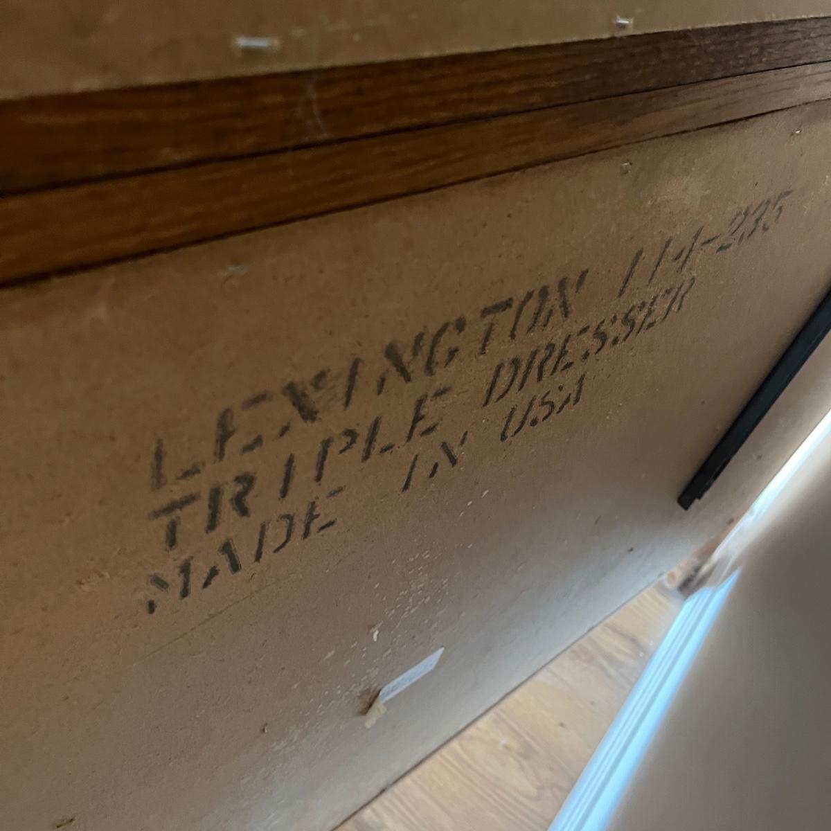This Lexington dresser has nine drawers with one cabinet and detachable mirror. Dresser measures 19” x 62” x 35.5”H and mirror frame measures 32” x 59.5”H. Height of dresser with mirror attached is approximately 86”. More matching bedroom suite items available in this sale. Mirror is attached with Phillips screws. Top has what appears to be water spots and a few nicks, see pictures.