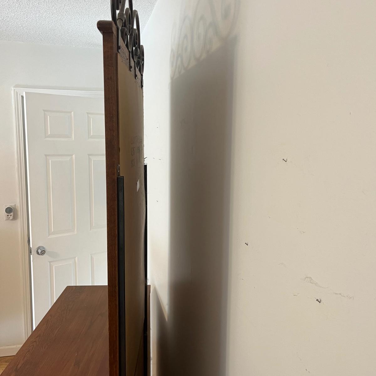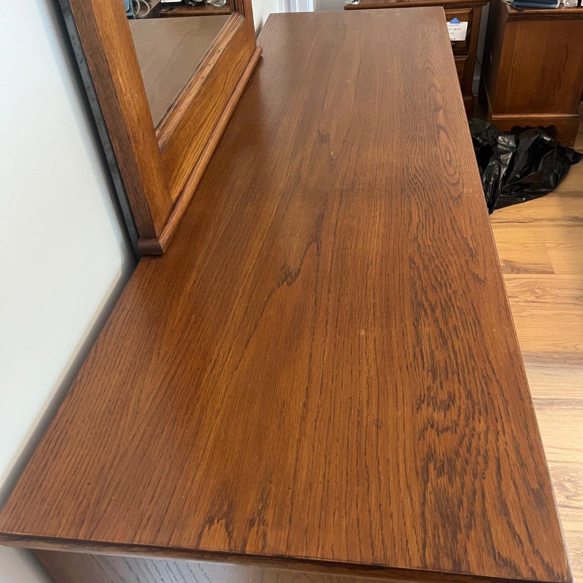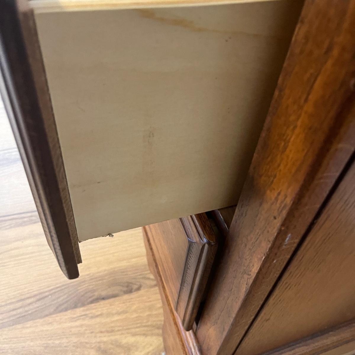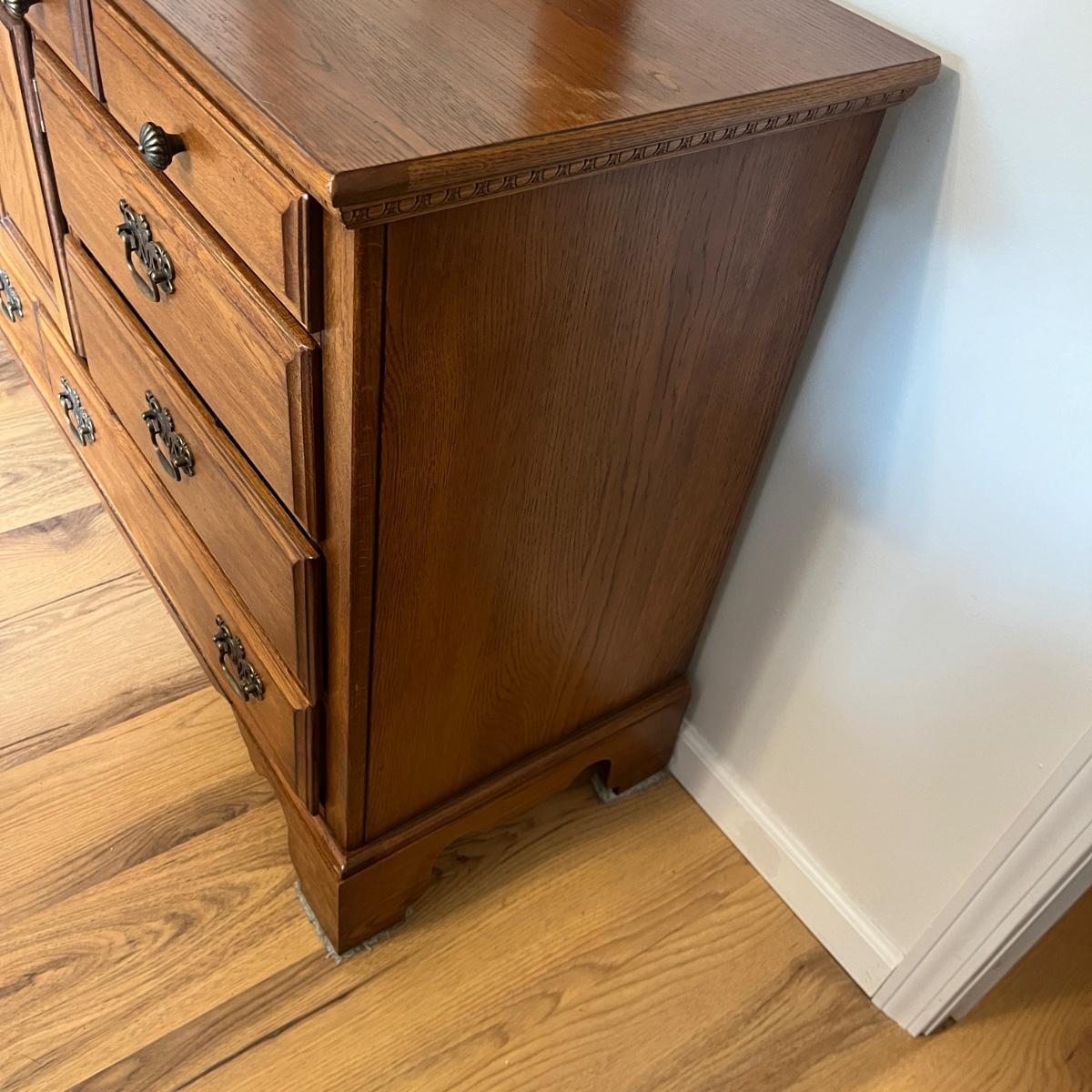 This Lexington dresser has nine drawers with one cabinet and detachable mirror. Dresser measures 19” x 62” x 35.5”H and mirror frame measures 32” x 59.5”H. Height of dresser with mirror attached is approximately 86”. More matching bedroom suite items available in this sale. Mirror is attached with Phillips screws. Top has what appears to be water spots and a few nicks, see pictures.