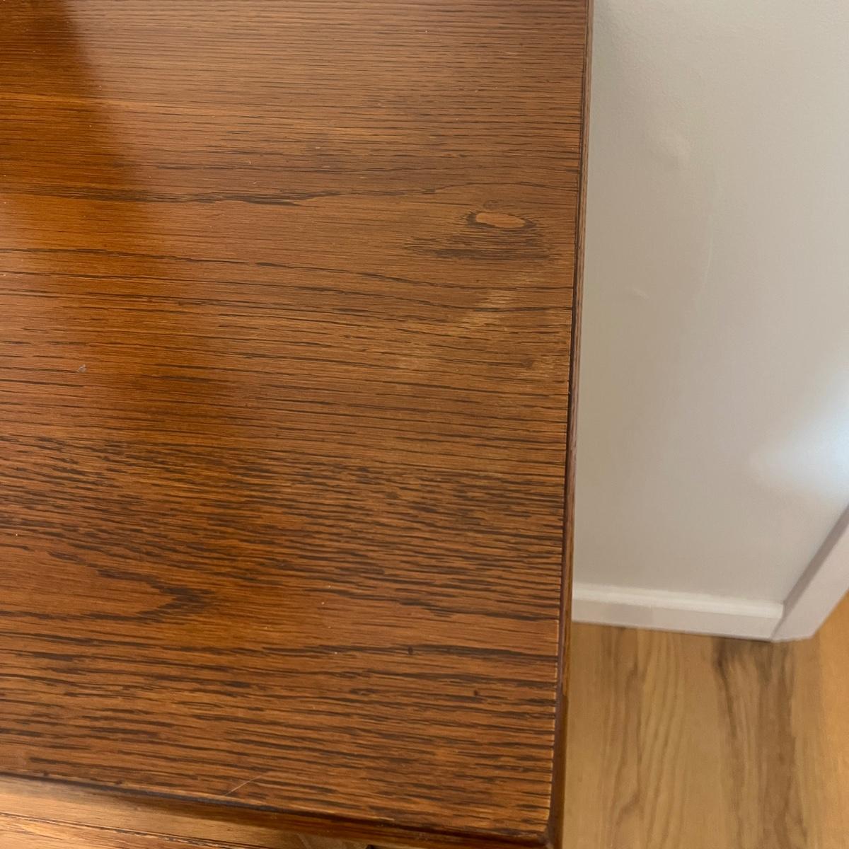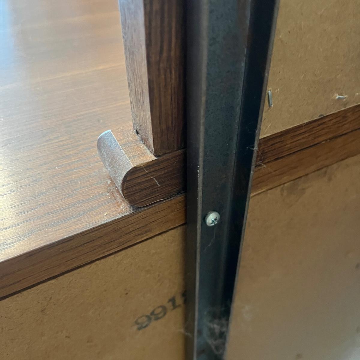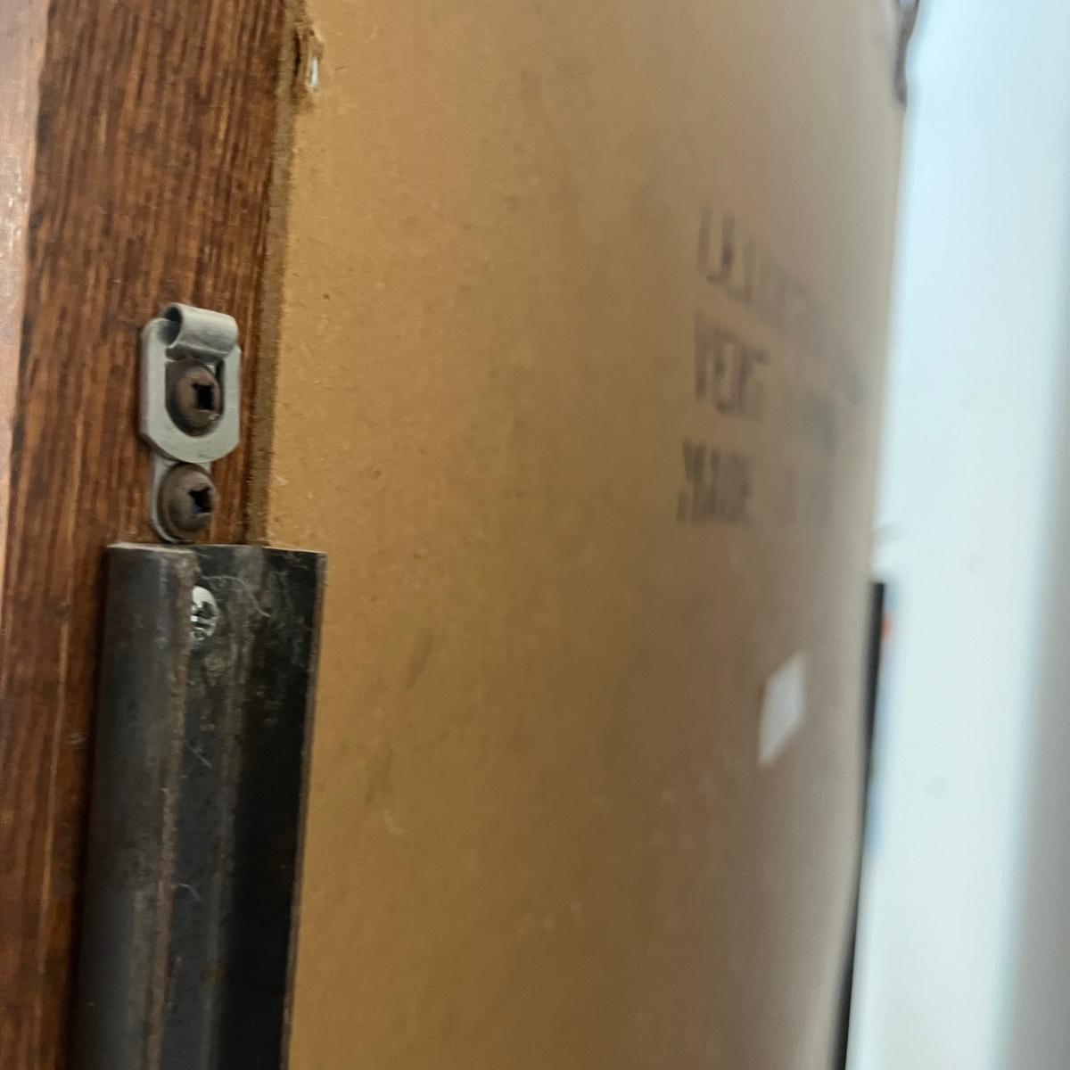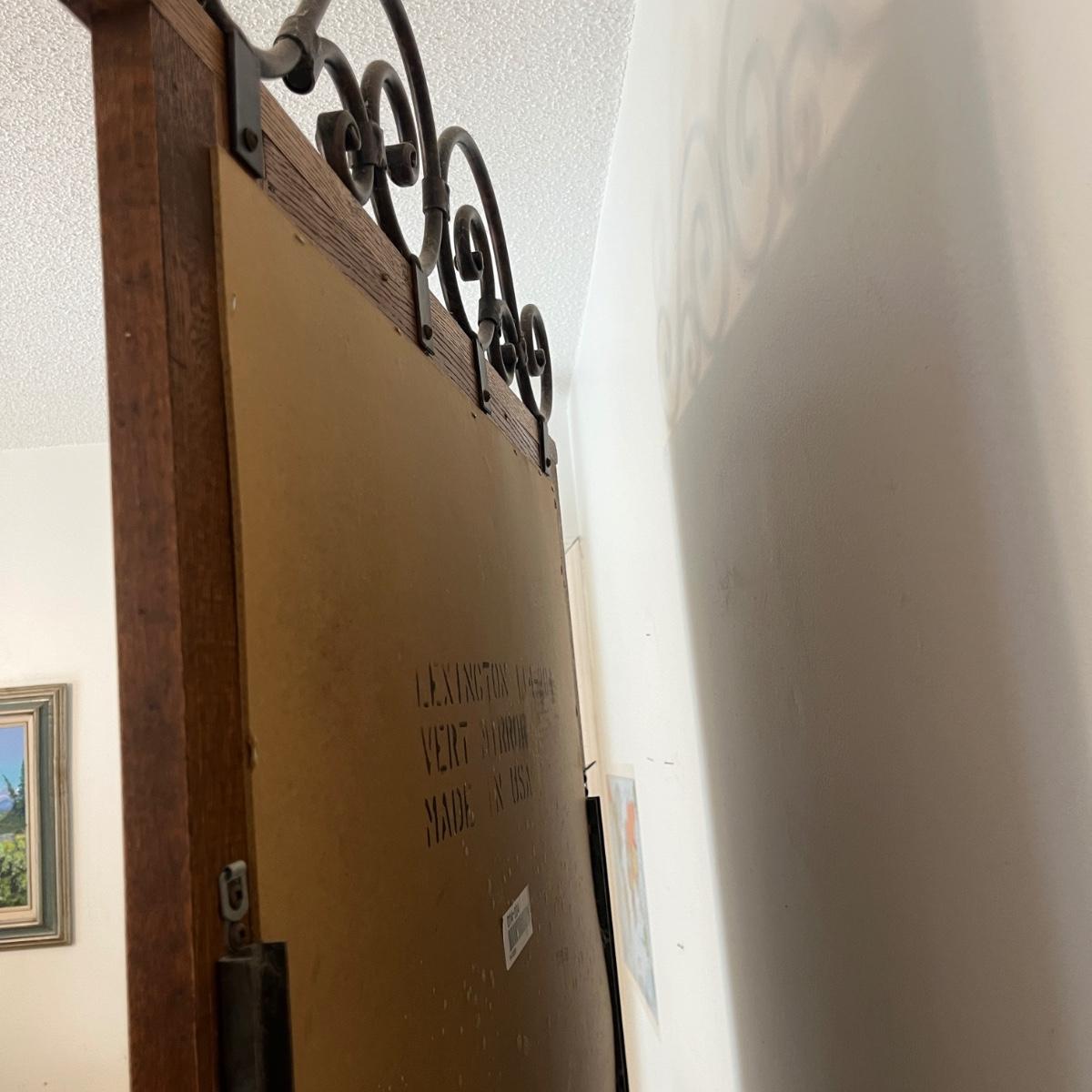 This Lexington dresser has nine drawers with one cabinet and detachable mirror. Dresser measures 19” x 62” x 35.5”H and mirror frame measures 32” x 59.5”H. Height of dresser with mirror attached is approximately 86”. More matching bedroom suite items available in this sale. Mirror is attached with Phillips screws. Top has what appears to be water spots and a few nicks, see pictures.