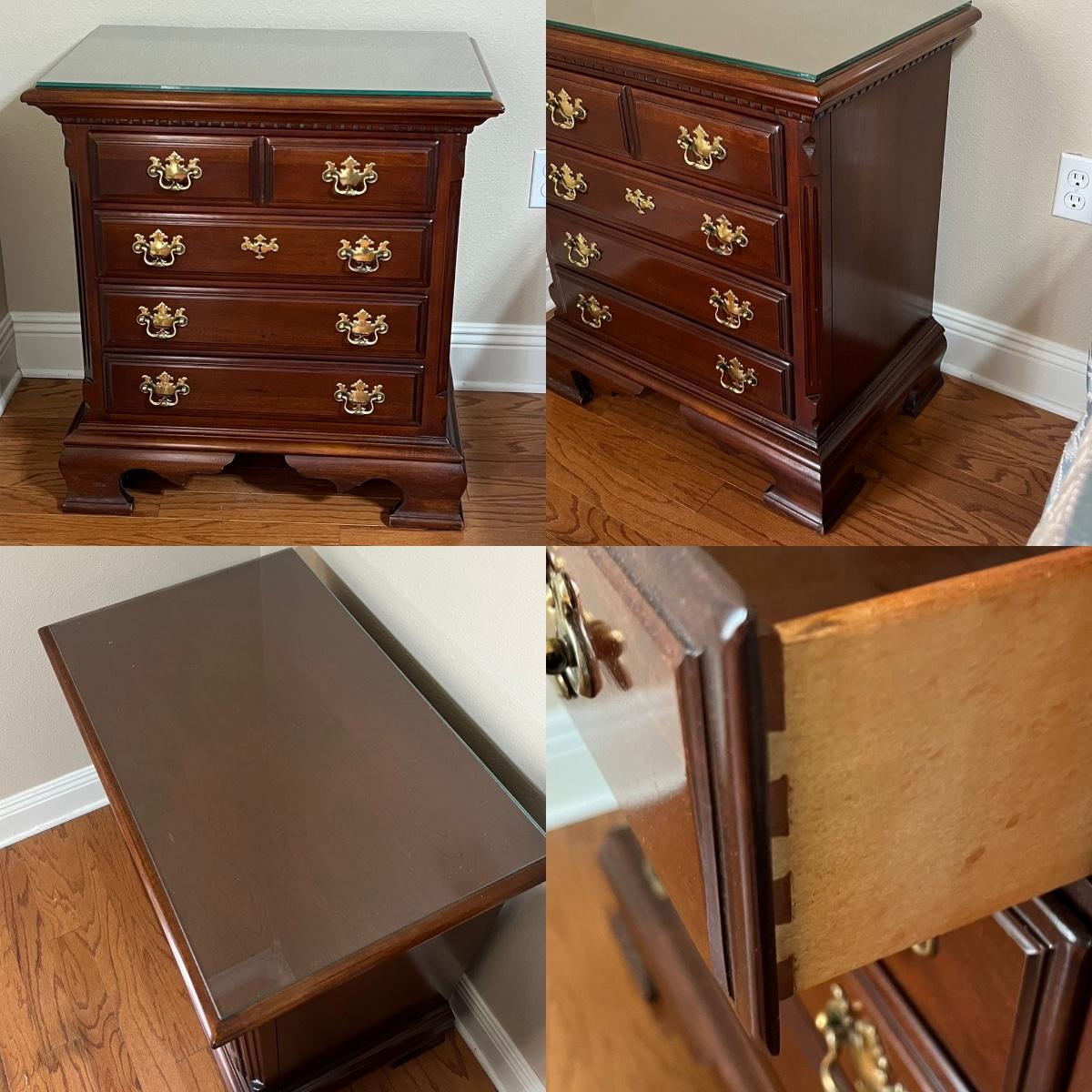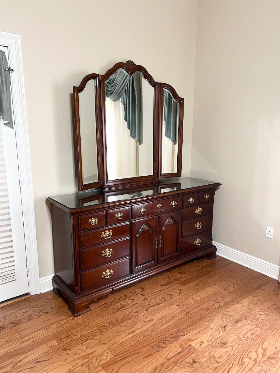 Includes: 1 Tri~fold beveled mirror glass top 12 drawer dresser, 2 glass top 4 drawer nightstands, & 1 glass top 9 drawer tall boy~ dresser with mirror = 35” H x 70” W x 19” D ~ Mirror = 48” H ~ Both nightstands = 29” H x 27” W x 17” D ~ Tall boy = 60” H x 38” W x 20” D