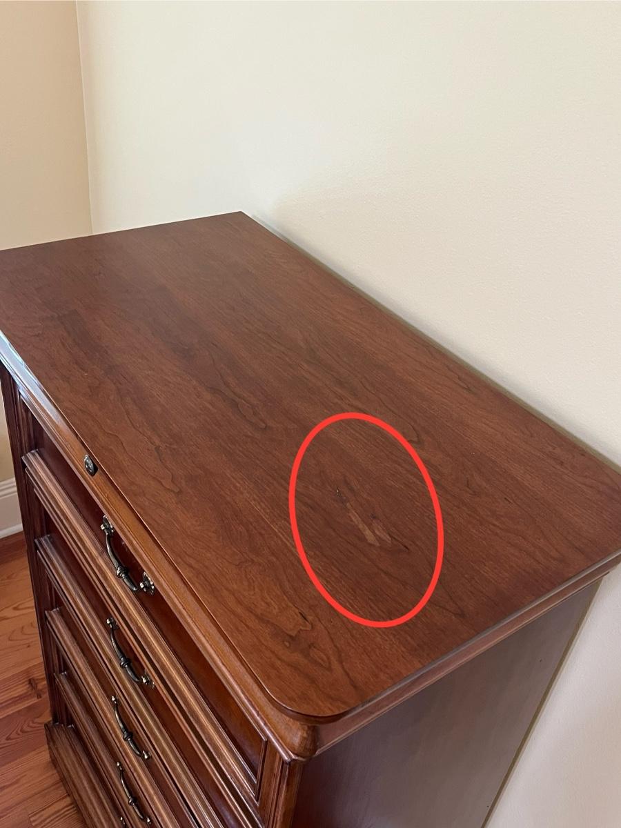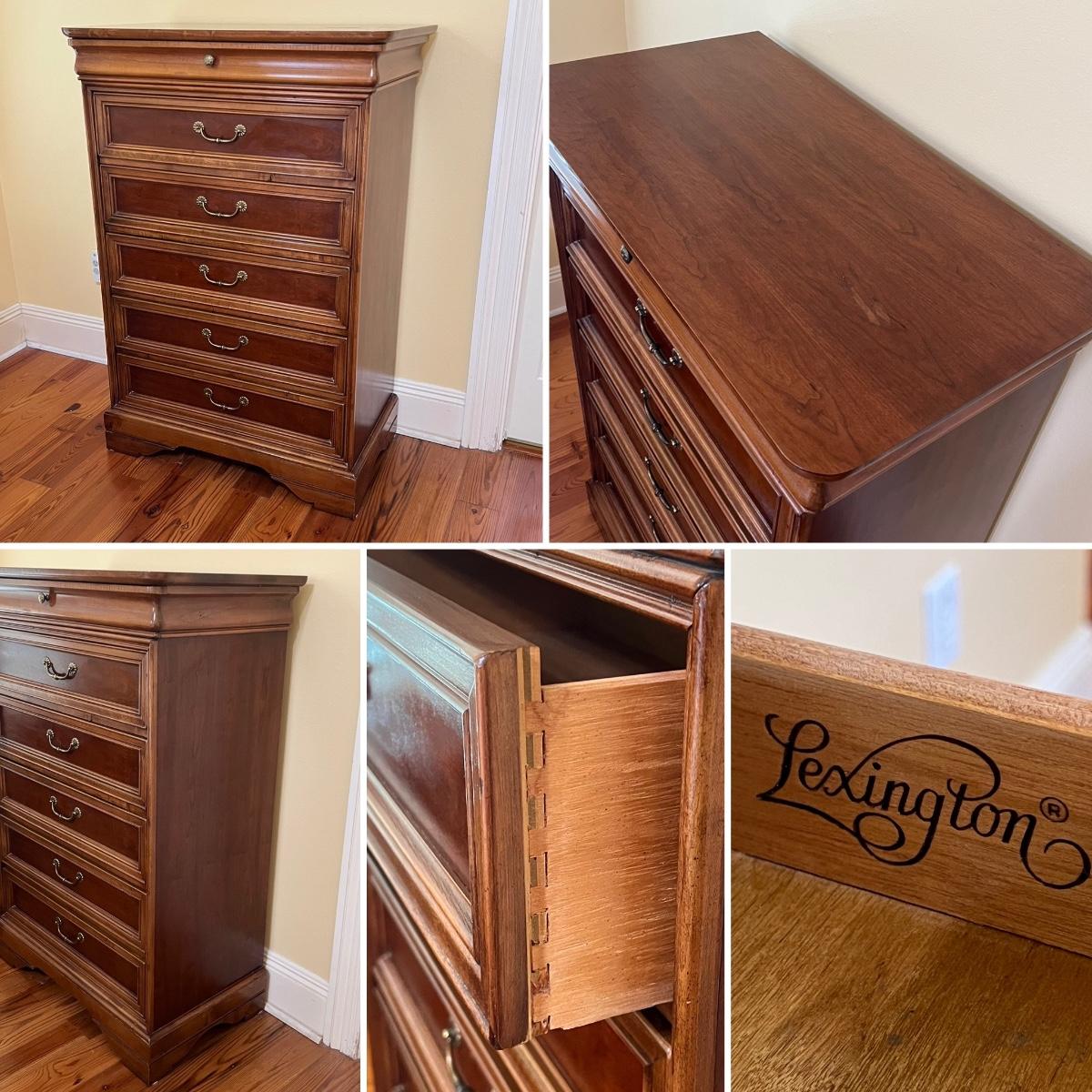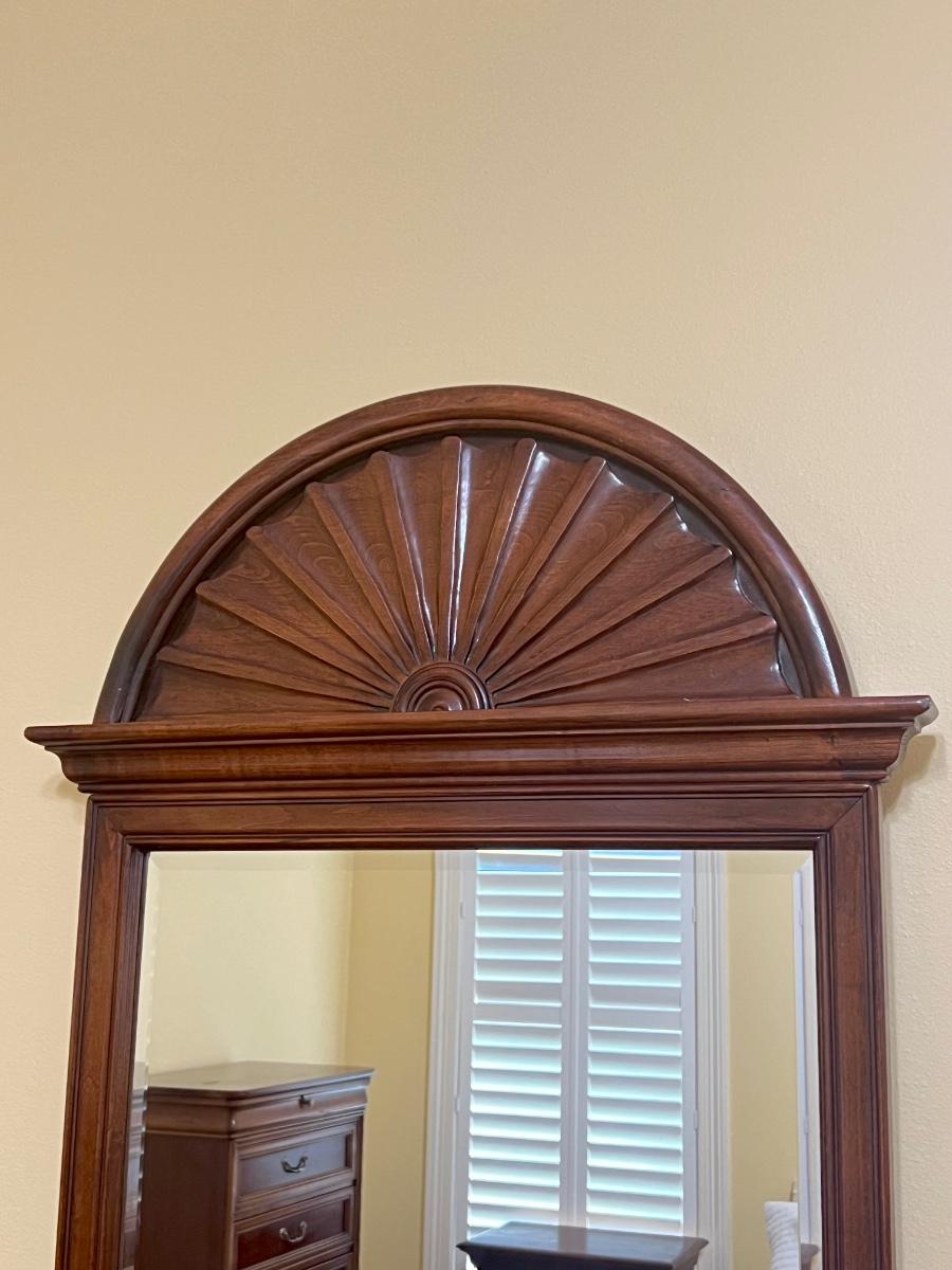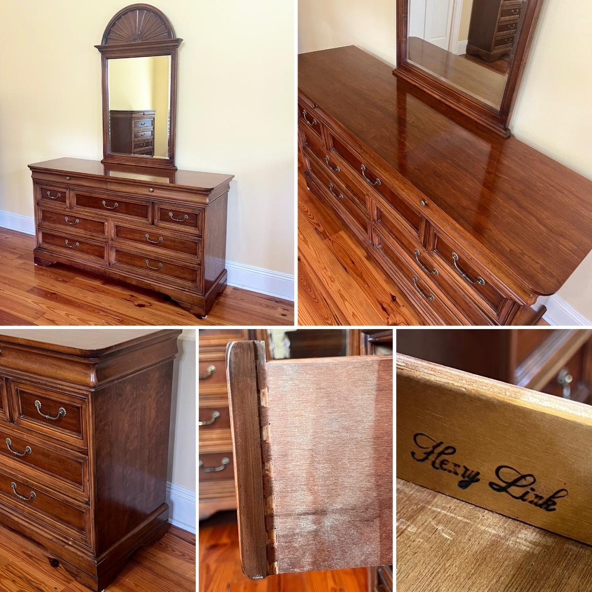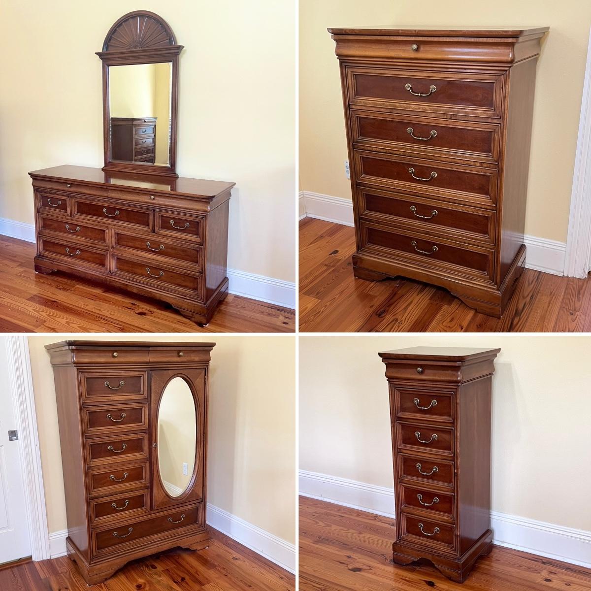 Includes: Beveled mirrored dresser, Chest of drawers, Beveled mirrored wardrobe, & Lingerie chest ~ All drawers slide easy ~ Chest of drawers has minor wear on top, see photos ~ Dresser = 34.5” H x 64” W x 19” D ~ Beveled mirror = 50” H ~ Chest of drawers = 49.5” H x 34” W x 19.25” D ~ Wardrobe = 58.5” H x 40” W x 19” D ~ Lingerie chest = 42.5” H x 18” W x 15” D ~ There is no headboard included