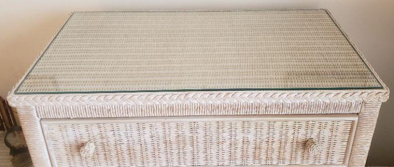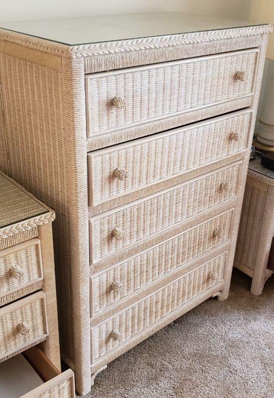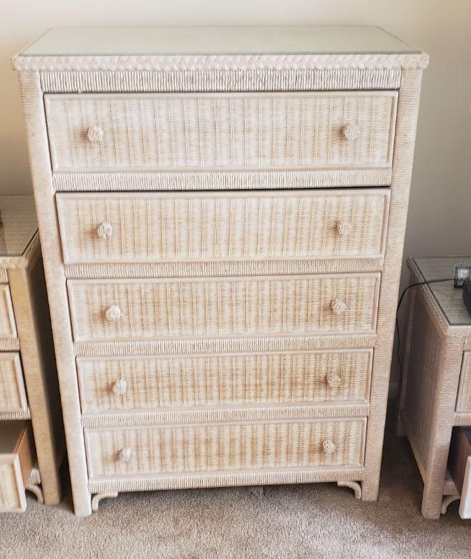 Lexington Glass Top White Wicker 5 Drawer Cabinet